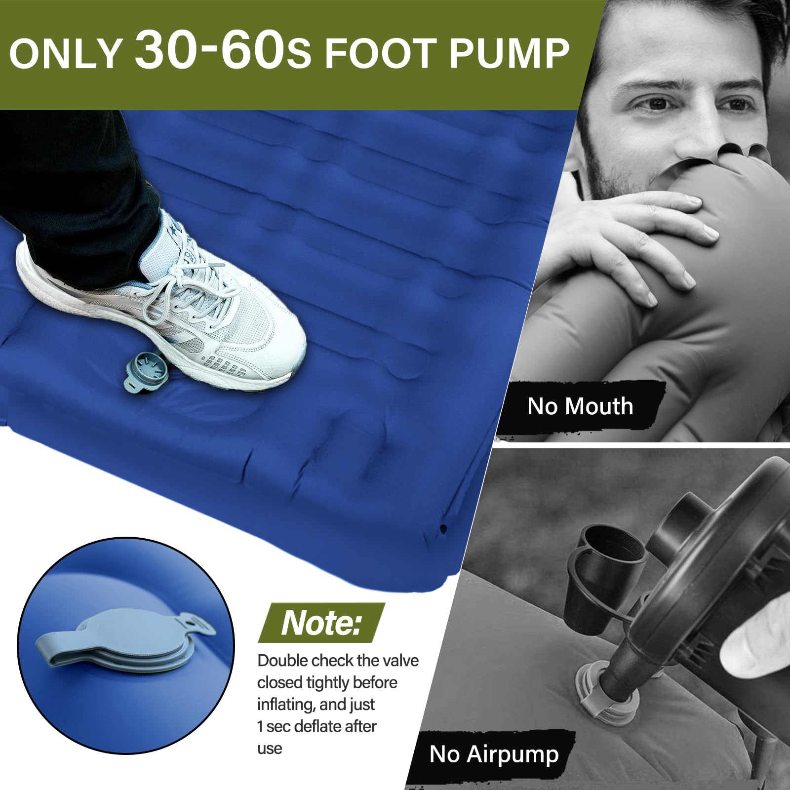 Quick Inflation & Deflation: No more blowing up with your mouth! With the integrated foot pump, the self-inflating camping air mattress is ready to use in just 1 minute. You can quickly deflate the mat via the release valve. The firmness can be adjusted flexibly - for optimal sleeping comfort in any situation.