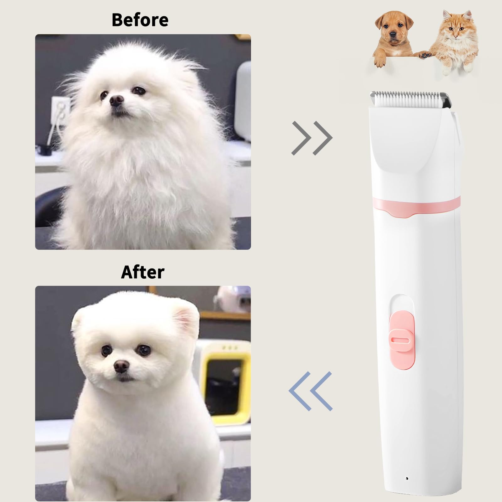 ["[4in1 Cat Clipper Dog Cat] With 4 detachable cutting heads (whole body, partial body, paws, claws), the clipper covers face, ears, body, paws, and nails. Easy installation for cost-effective pet grooming - ideal for daily grooming or professional use","[Quiet & Gentle for Sensitive Pets] Cat shaver with less than 45 dB noise level and gentle stainless steel ceramic blades trims the machine gently, without pulling hair or frightening animals. Perfect for nervous dogs or cats that would otherwise fear noise","[USB rechargeable & 2-hour continuous operation] Charges via a USB-C cable in just 1.5 hours - a full charge lasts for 2 hours of continuous trimming. Cordless operation allows for free movement, ideal as a dog paw trimmer at home or on the go. Lightweight design at only 92 grams for effortless handling, even with delicate paw or facial trimming work","[Sharp Blades & 4 Attachment Combs] The high-quality stainless steel ceramic blades remain sharp for a long time and cut fur effortlessly. 4 attachment combs (3 mm/6 mm/10 mm + specific comb) control hair length precisely - from short facial hair to long body fur","[Safety & Simplicity for Beginners] Two speeds (6000-6500 RPM) adjust to different fur types. Ideal for small and medium-sized pets - note: The whole body cutting head is not suitable for large dogs, but is suitable for partial trimming. Easy cleaning after use with the included brush"]