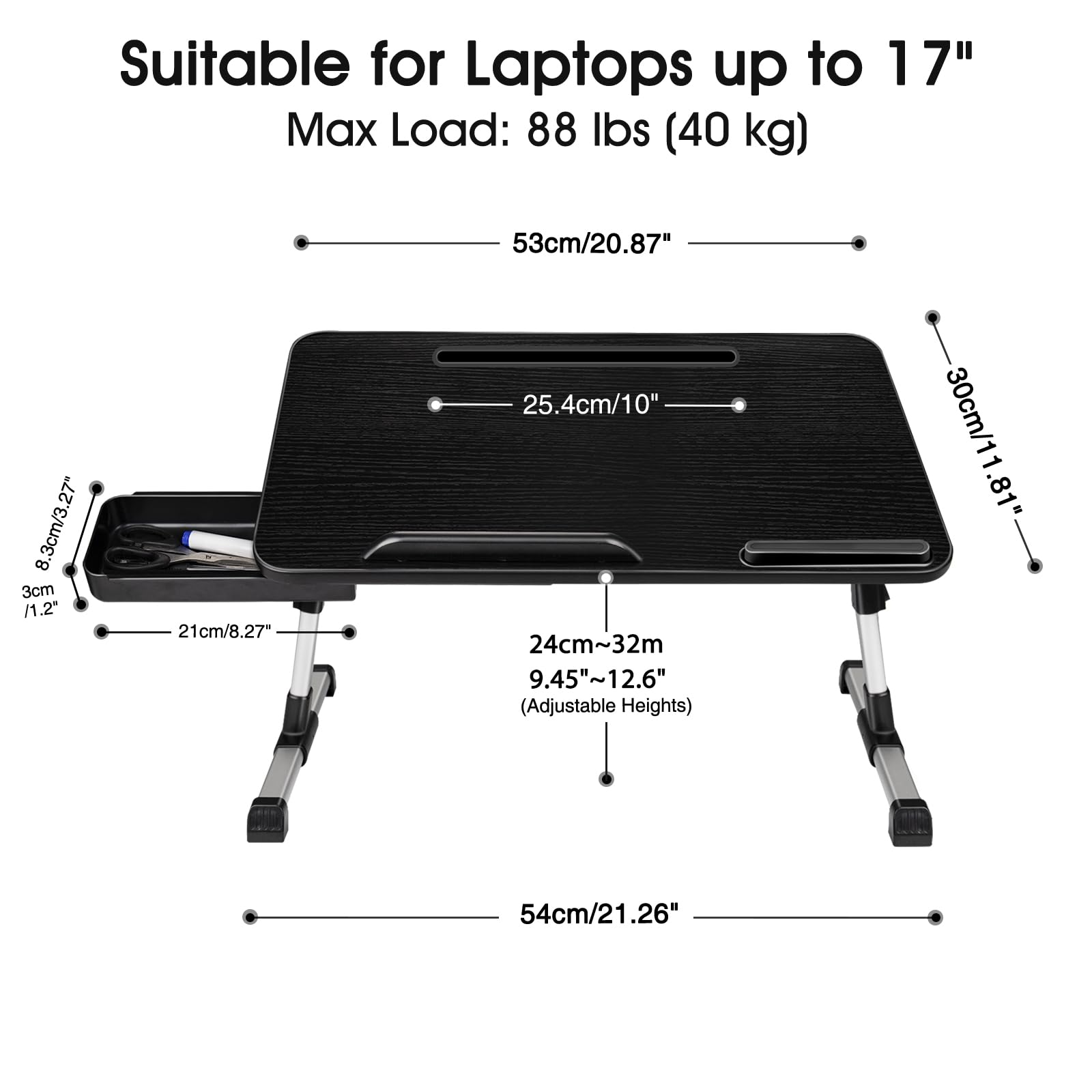 【Versatile】The size of the laptop stand bed desktop is 53(L)x 30(W) and can be used for 11-17\" laptops. Laptop bed table with 1 drawer for stationery or other small items; 1 pad stand, can put tablet (side length <25cm) and phone, convenient for you to watch movies or video calls; 1 laptop border to effectively prevent the laptop from slipping; 1 soft silicone mouse pad to protect your wrist.