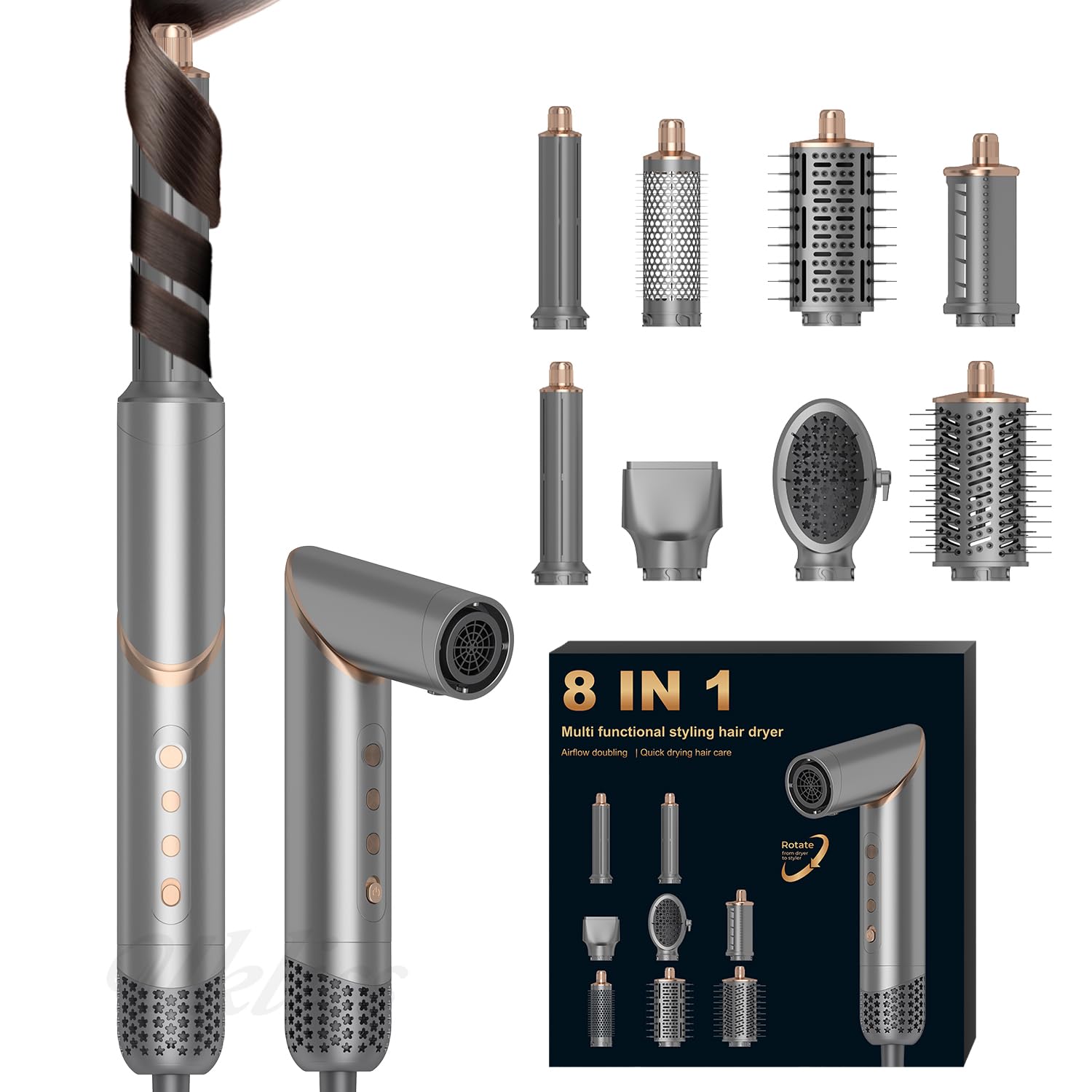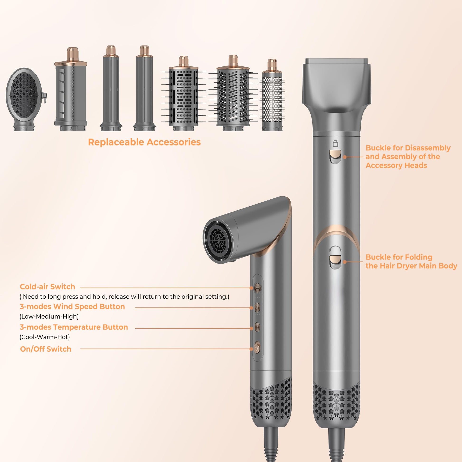 ["【8 in 1 High Speed Ionic Hair Dryer Set】This hair dryer brush and attachments set includes 1 high-speed foldable hair dryer and 8 other hair styling devices, including 2 hair curling irons in different directions, 1 dryer nozzle, 1 double-sided wet brush, 1 anti-flip hair dryer attachment, and 3 dry round brush barrel of different specifications.","【Fast Drying Hair Dryer】The speed of the 1400W dryer can reach up to 110000 revolutions per minute, and the airflow is several times stronger than the average of other dryers on the market, allowing it to quickly dry hair in a short amount of time. This hair dryer with accessory set can also be used as a hairbrush, curling iron, hair straightener, and multi-purpose hairstyler, helping to achieve different looks with just this 1 set.","【Ionic Technology for Hair Care】The dryer brush uses continuous negative ionic airflow technology, making this ionic hair dryer able to effectively smooth static frizz, increase hair shine, and make hair more voluminous and smoother. During use, hair can automatically wrap around the surface of the curling iron, creating smooth and natural curls and protecting hair from heat.","【Intelligent Temperature-Wind Speed Control】The dryer has 3 temperature modes (Cool-Warm-Hot) and 3 wind speed modes (Low-Medium-High) that can be sequentially set by pressing the corresponding button. In addition, long pressing and holding the top button (cool air switch) will return to cool temperature, while the wind speed remains unchanged, and releasing will return to the original temperature.","【Perfect Gifts for Women】The ionic hair dryer and round brush dryer with accessories 8 in 1 set has a beautiful and unique main body design and all well packaged in a high-quality gift box as a package, making it a perfect choice of gifts for women as Valentine's Day Christmas gift set birthday gift for women. If there are any questions about this hair dryer brush set, please feel free to contact us to solve the problem for you.","Note before purchase: Our airstyler and hairstyler uses hot air to automatically curl hair, straighten hair, and style hair, making styling your hair easy and fast. However, the sustainability and effectiveness of the air styler cannot be compared to the classic high-temperature curling iron and flat iron, please carefully consider this before purchasing.","Note for sound-sensitive users: Due to the small size of the internal fan, the hair dryer must rotate at high speed to generate sufficient airflow, resulting in a higher noise level than a conventional hair dryer. For sound-sensitive users, please carefully consider this before purchasing."]