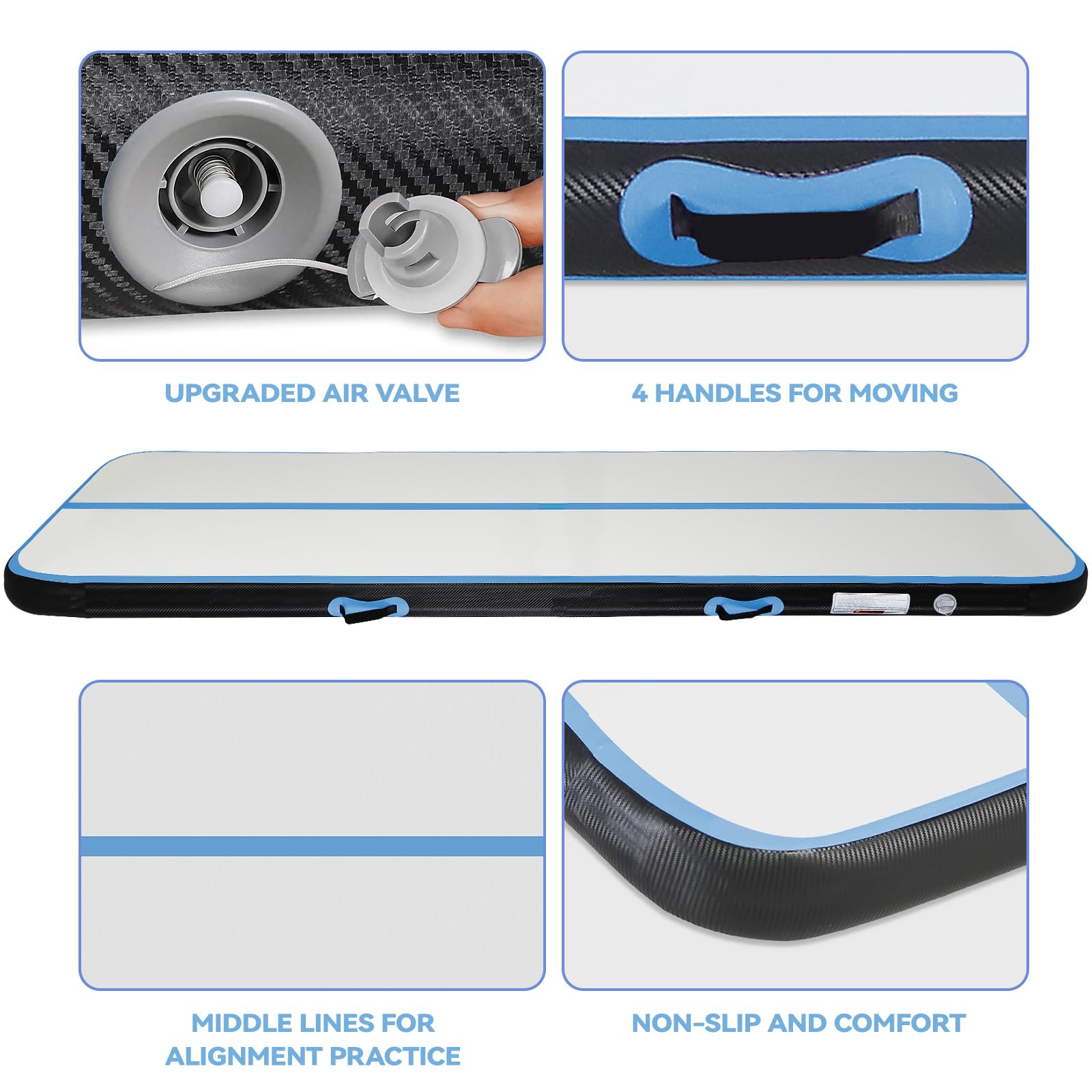 ["【Reinforced without air leakage】Our Air Tumbling Track Mat is made of Filament Grade, 0.9mm high-quality PVC tarpaulin and double-wall material (also known as drop-stitch material). Better airtightness and durability, as reinforcement is done for all seams.","【Portable and easy to store】The gymnastics mat can be quickly folded and unfolded. You will receive an air pump. It only takes less than a minute to inflate or deflate the air gymnastics mat. We offer various sizes for all types of training. Deflated size along with integrated handles allows you to easily take it anywhere.","【Wear-resistant, waterproof, and safe】Compared to other training equipment, the Air Tumbling Mat is soft enough and non-slip so you can jump higher, increase repetition frequency, and reduce the likelihood of getting injured. It is waterproof, so this air tumbling mat can be used in a pool or sea.","【For all ages】Various sizes and thickness colors are available for children, teenagers, and adults. This tumbling track mat can be used by children playing at home as a protective mat, by gymnasts for training, or by adults for sports or yoga at home.","【Wide range of applications】The inflatable gymnastics mat can be used in the gym, school, garden, backyard, park, swimming pool, fitness clubs, dance clubs, leisure centers, and on the beach, water, and grass. You can also use the tumbler mat for gymnastics training, home use, yoga, cheerleading, exercises, indoor and outdoor sports, and high-performance training. Just make sure there is no fire or sharp objects."]