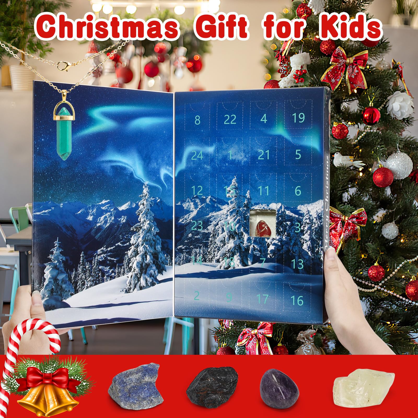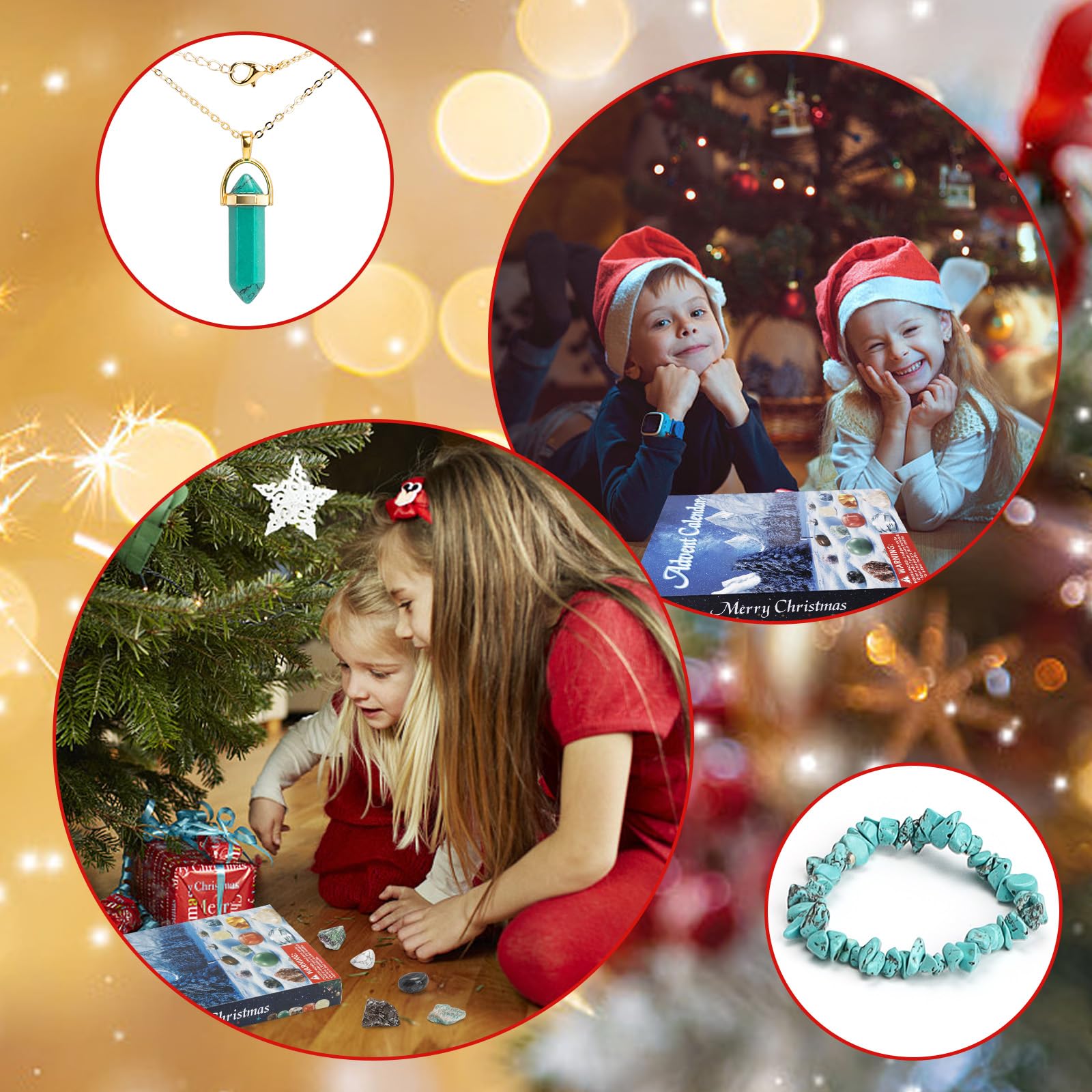 ["【Gemstone Advent Calendar】: You will receive a raw stone of each of the 21 types; 20g of colored agate, 1 turquoise hand; 1 Turquoise necklace.", "【Fulfilling Your Christmas Expectations】: The product packaging comes with 24-inch windows that can be opened. Starting from December 1st, you can open a window every day to receive a jewel. The advent calendar can make children look forward to Christmas even more, in the joy of receiving gemstones.", "【Learning While Playing】: After children receive gemstones, they can learn more about the gemstones they receive and understand how they are formed and what their characteristics are. The gemstone advent calendar can effectively promote children's interest and foundation in geology.", "【Unique Christmas Gift】: An interesting advent calendar is perfect for adults and children as a gift. Additionally, these gemstone spoils have very beautiful shapes and shine, and it is also very suitable to place them at home for viewing after Christmas.", "【Warm Reminder】: Gemstones are naturally formed, so each piece has a different color, shape, texture, and size. Please understand. Of course, if you are not satisfied with the product you have received, please feel free to contact us at any time. We are equally excited to solve various problems for you."]
