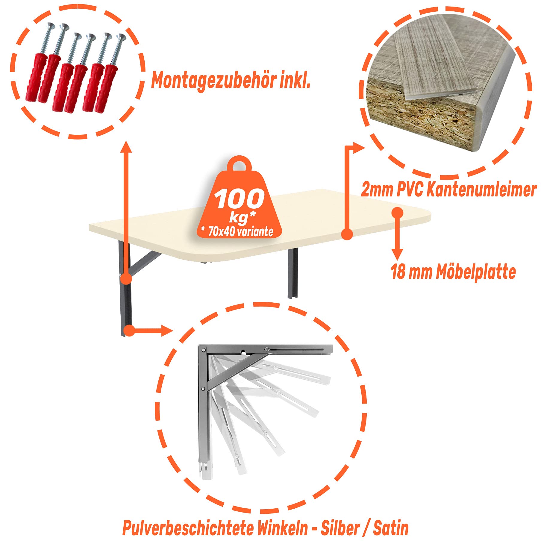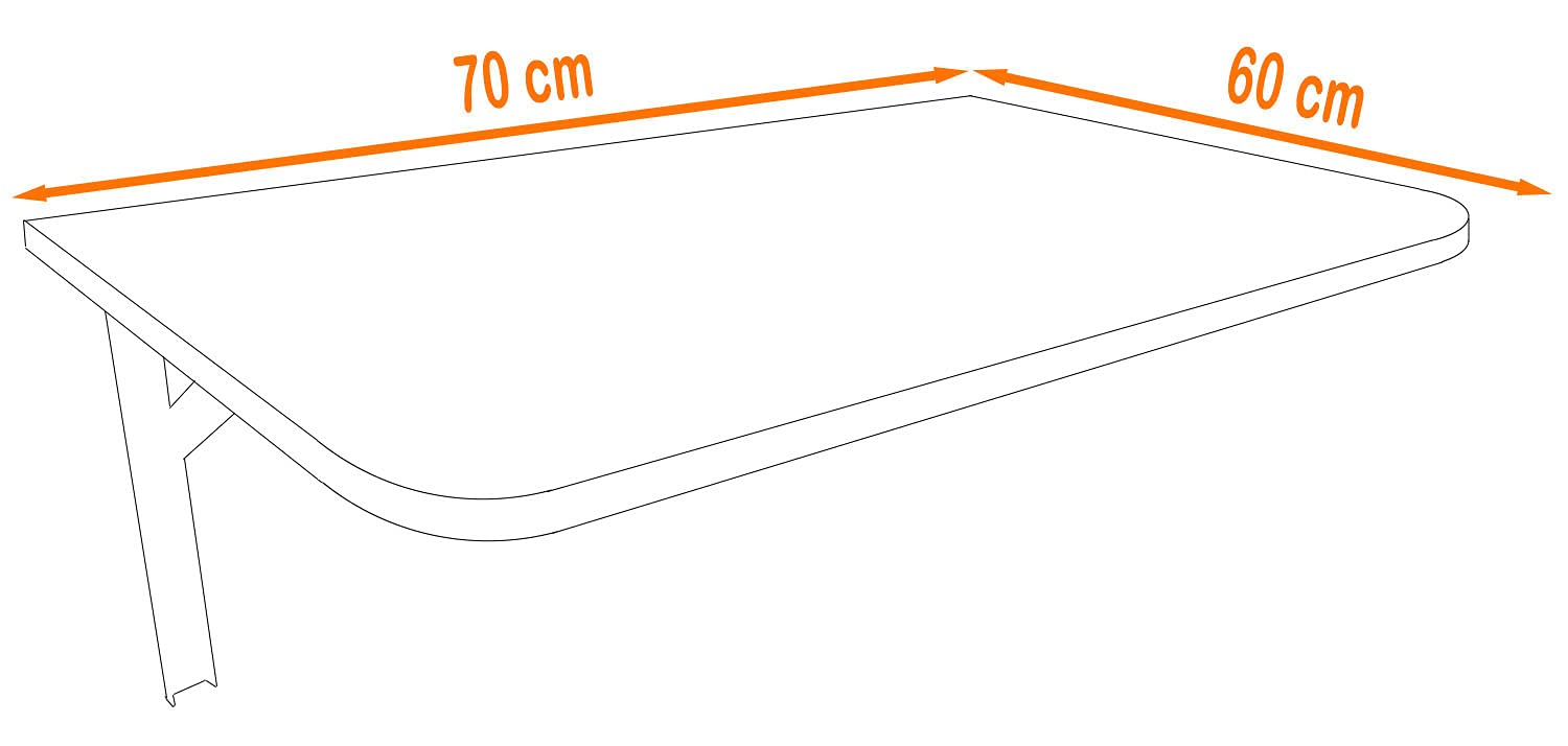 ["ROUNDED CORNERS: Our folding tables can be mounted on the wall at the desired height, e.g. at bar table or dining table height. Also suitable for children as a small desk.","SPACE-SAVING: the wall-mounted folding table can be used as a dining table, computer table, children's desk, laptop table in a room or in the kitchen, or anywhere as an additional workspace.","EASY OPERATION - Simply fold the tabletop up and down as needed in a few seconds. Using this kitchen table is comfortable. The wall-mounted folding table maintains the correct position (90 degrees to the wall).","STURDY PVC - 2MM - All our products are veneered with high-quality 2mm-thick plastic edge banding profiles. This ensures better durability and appearance of the folding children's tables and small kitchen tables.","FOLDING TABLE FOR KITCHEN WITH POWDER-COATED ANGLES - Powder coating protects the metal surface of the wall table from corrosion, scratches, abrasion, as well as chemicals and various cleaning agents. A high-quality piece of furniture for indoor use - not suitable for outdoor use."]
