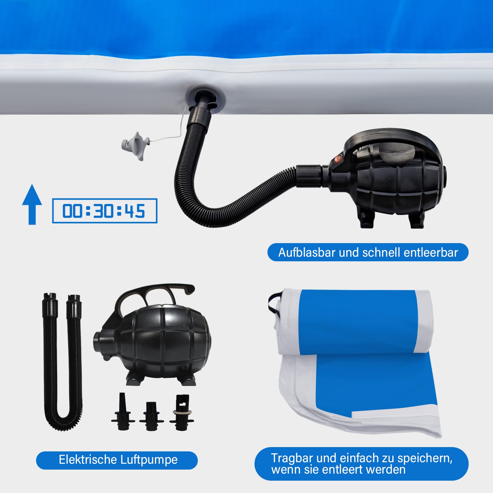 "✔【Complete and Well-Known Brand Accessories】 When purchasing the tumbling mats, you will receive an electric air pump (220-240V), a durable carrying bag, and a repair kit (NO GLUE) for free. With the valve of the well-known brand (BRAVO), you only need a few minutes to inflate or deflate the air, and it can protect the inside of the filament. With the carrying bag, it is convenient to take your gymnastics mat with you.