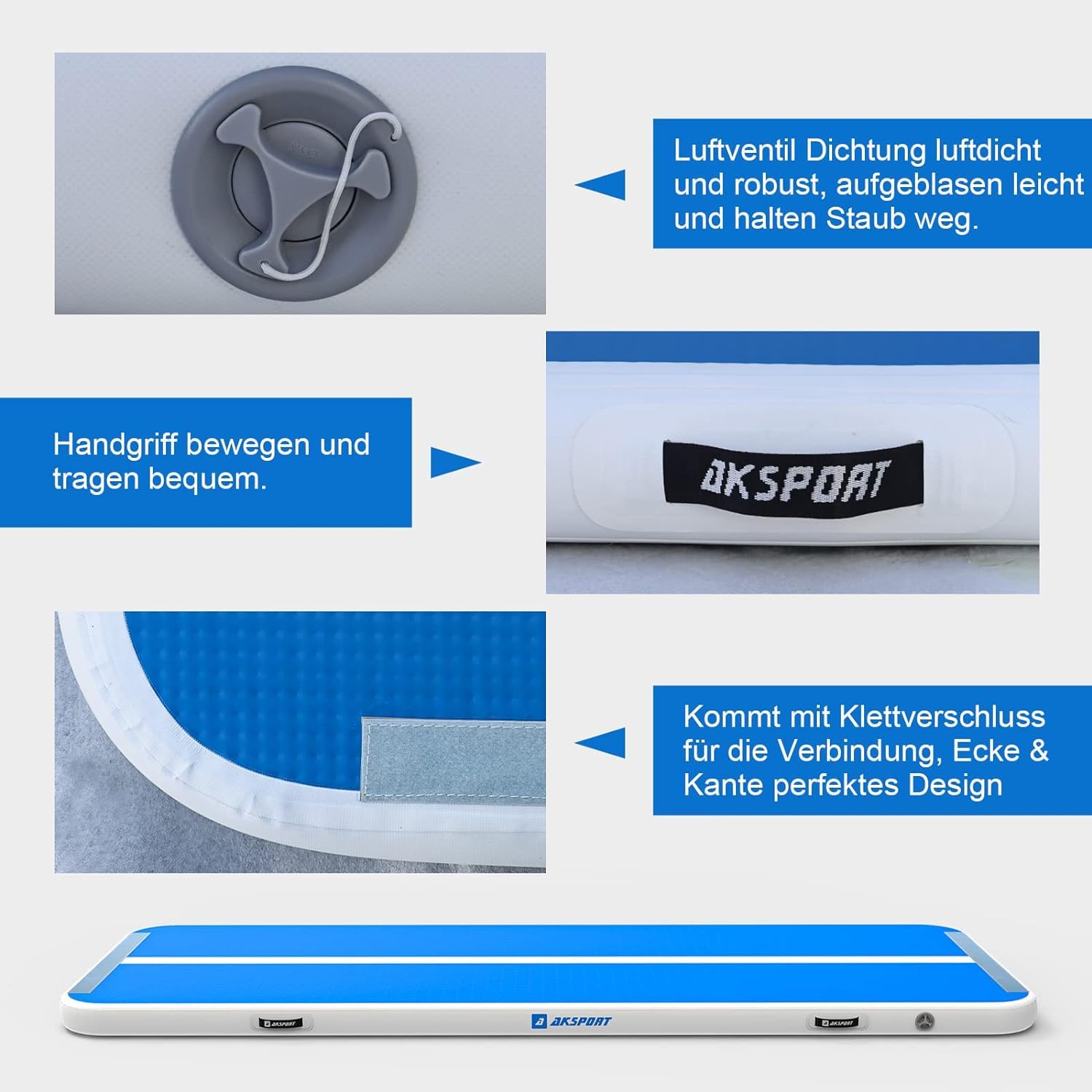 "✔【Durable and Shape-Retaining】 The Inflatable Gymnastics Mat from Aksport is made of double-walled 1000D (thicker and stronger) filament quality material (also known as drop-stitch material) and 0.11mm high-quality PVC tarpaulin, better airtightness and durability than reinforcement is made for all seams. It is extremely safe to use as this mat is leak-proof and odorless due to its high-quality material.