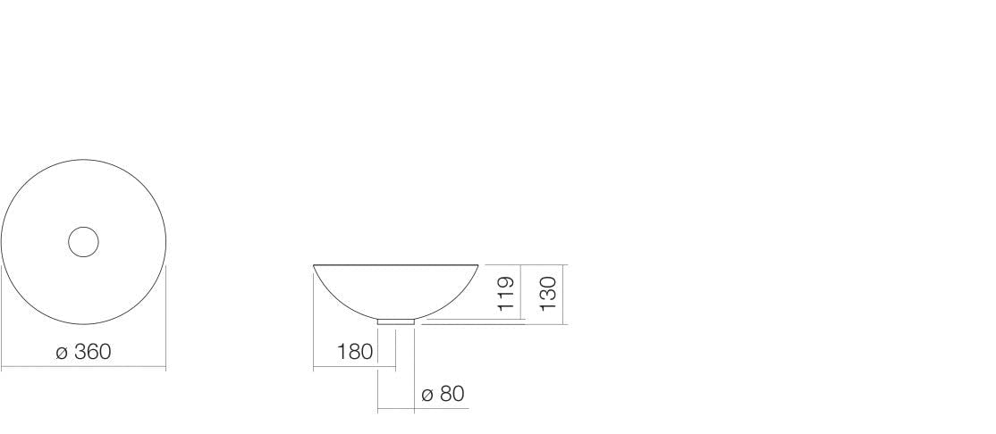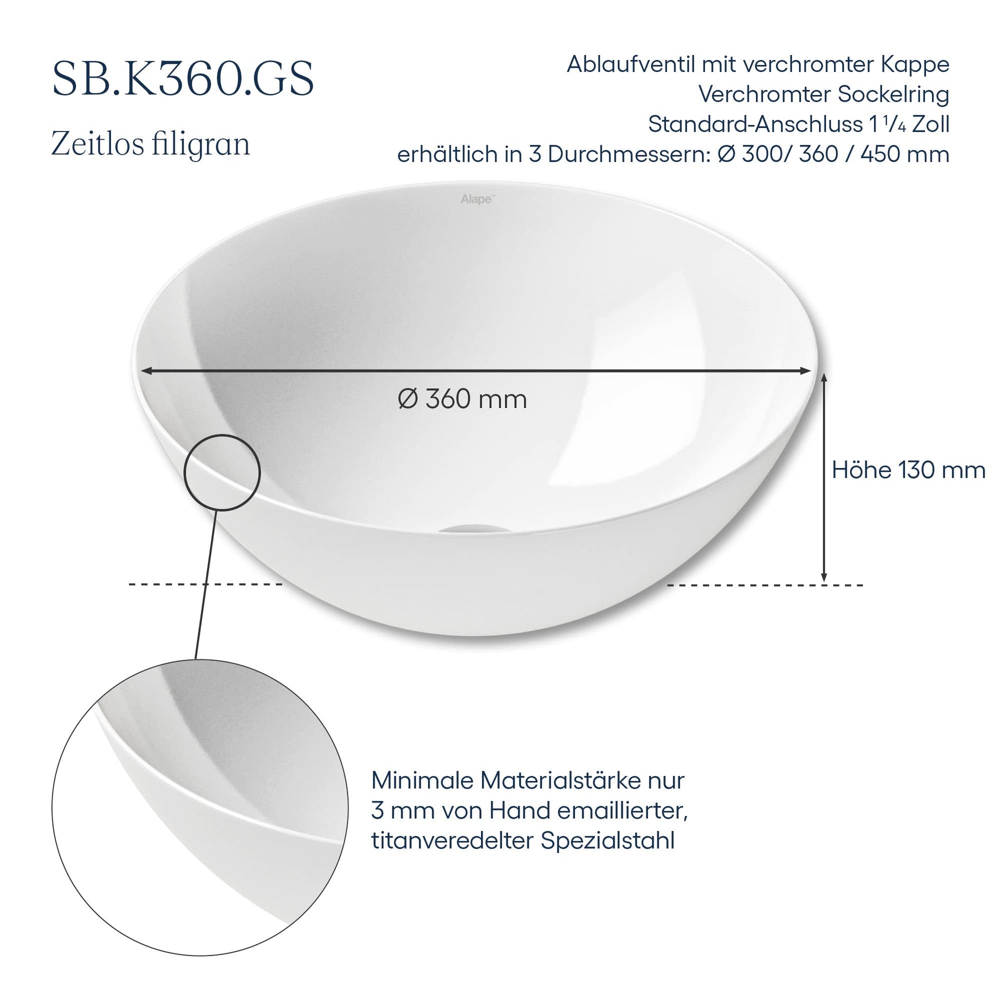 Alape washbasin made of glazed steel in alpine white surface, round, Ø 36cm, height 13 cm, white sink, without faucet hole, without overflow, bowl basin SB.K360.GS.