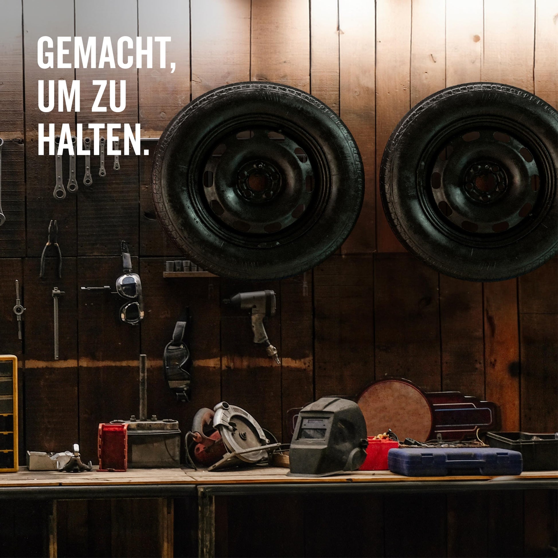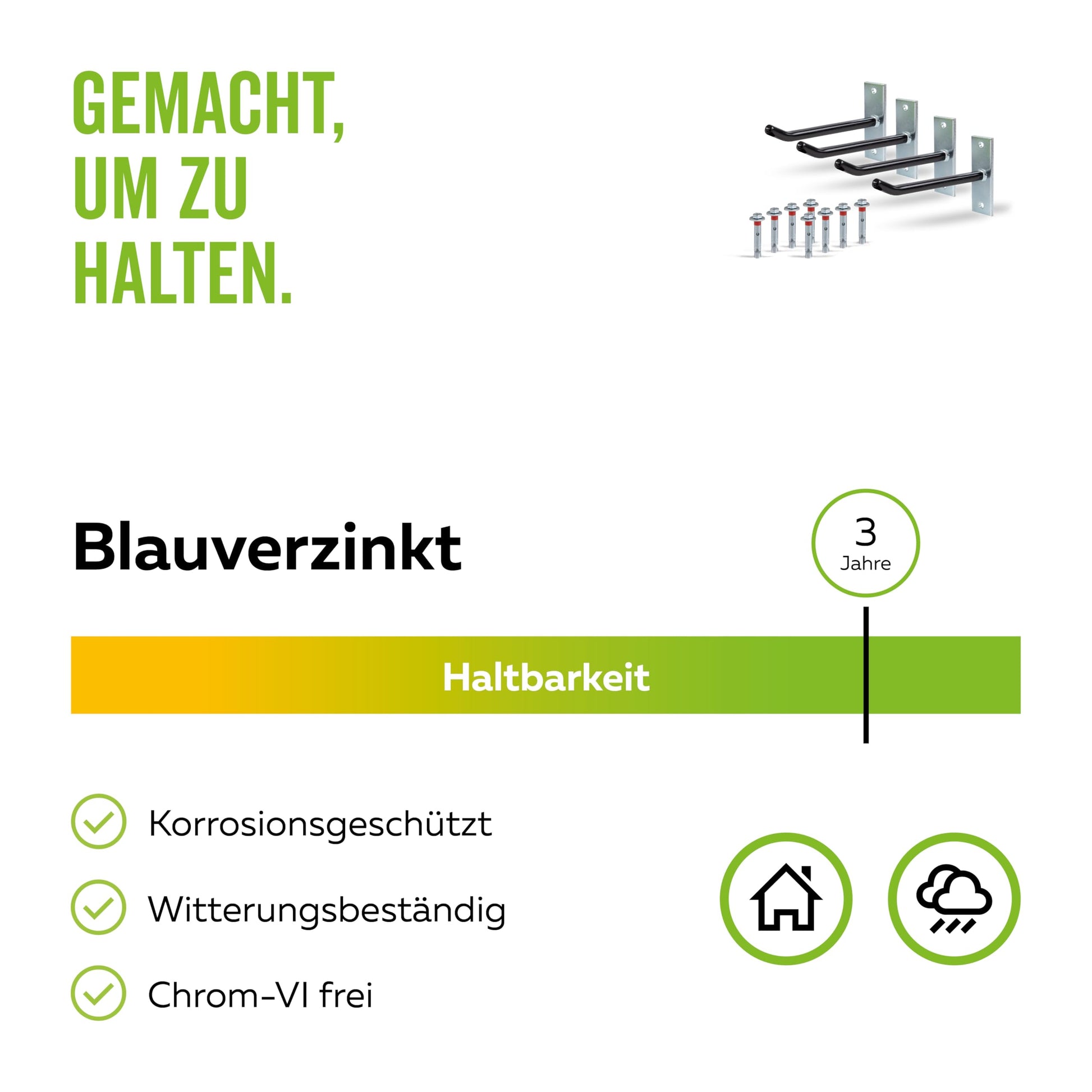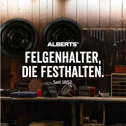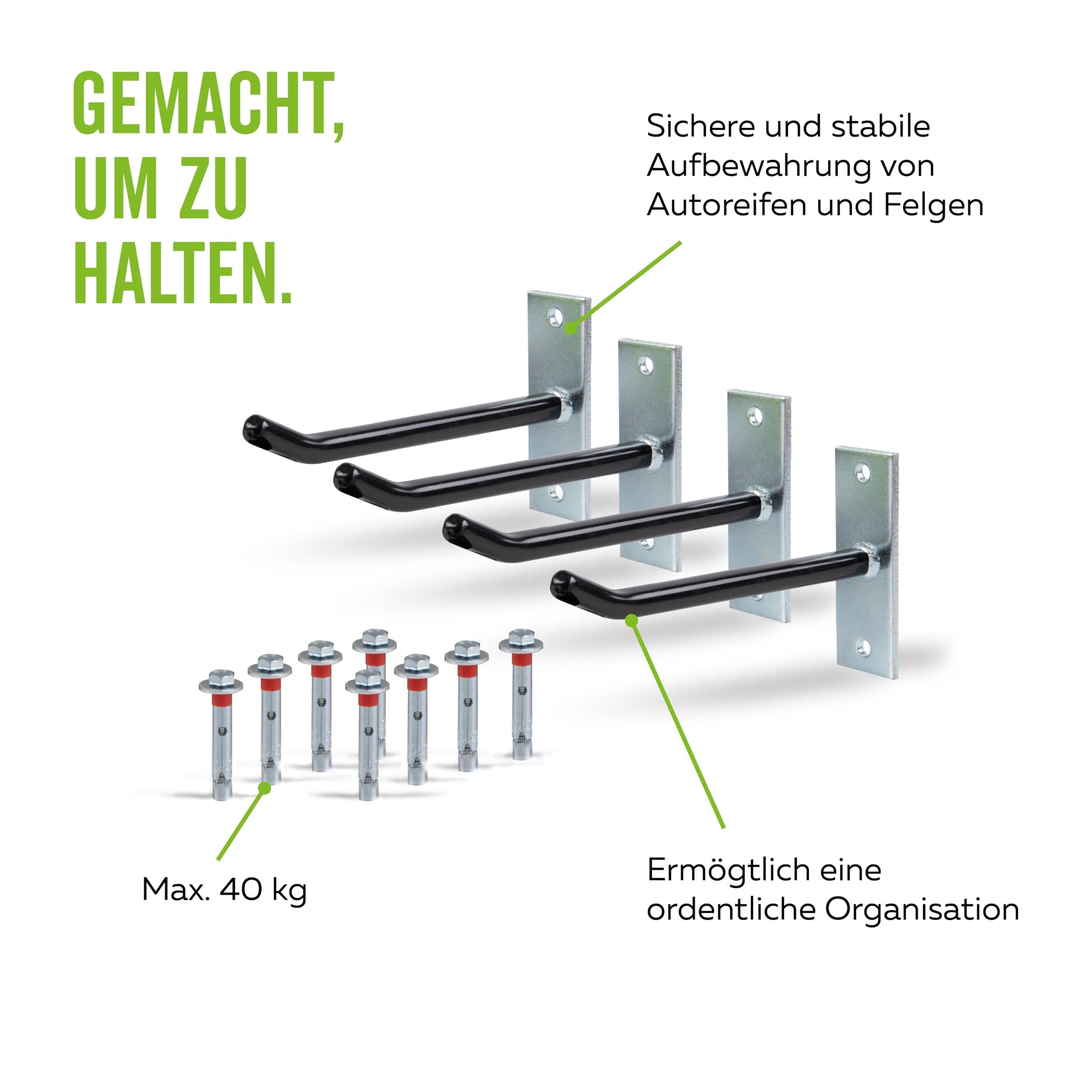 ["Material: Steel, Electroplated Zinc", "Dimensions: Hook 200 mm - Plate width 40 mm - Plate height 120 mm - Plate thickness 5 mm", "The wheel holder set can carry a maximum load of 40 kg.", "Includes: 4x wheel holders - 8x metal screws - 8x metal dowels", "Alberts offers not only a wide range of high-quality brackets and hooks. We also carry a variety of profiles, sheets, and angles, attractive and secure window grilles, as well as practical and decorative fences."]