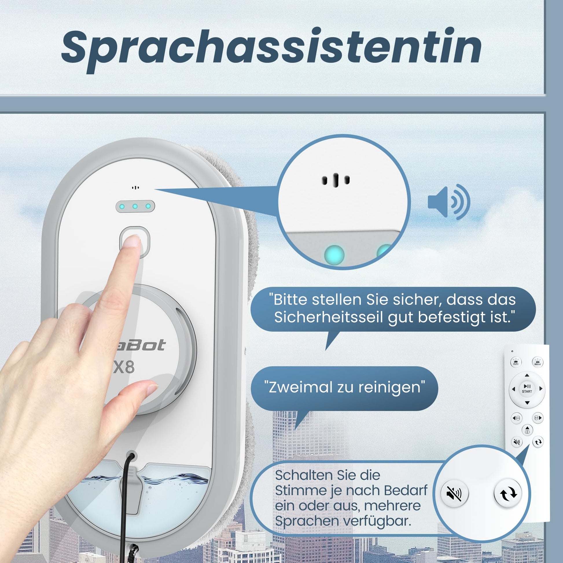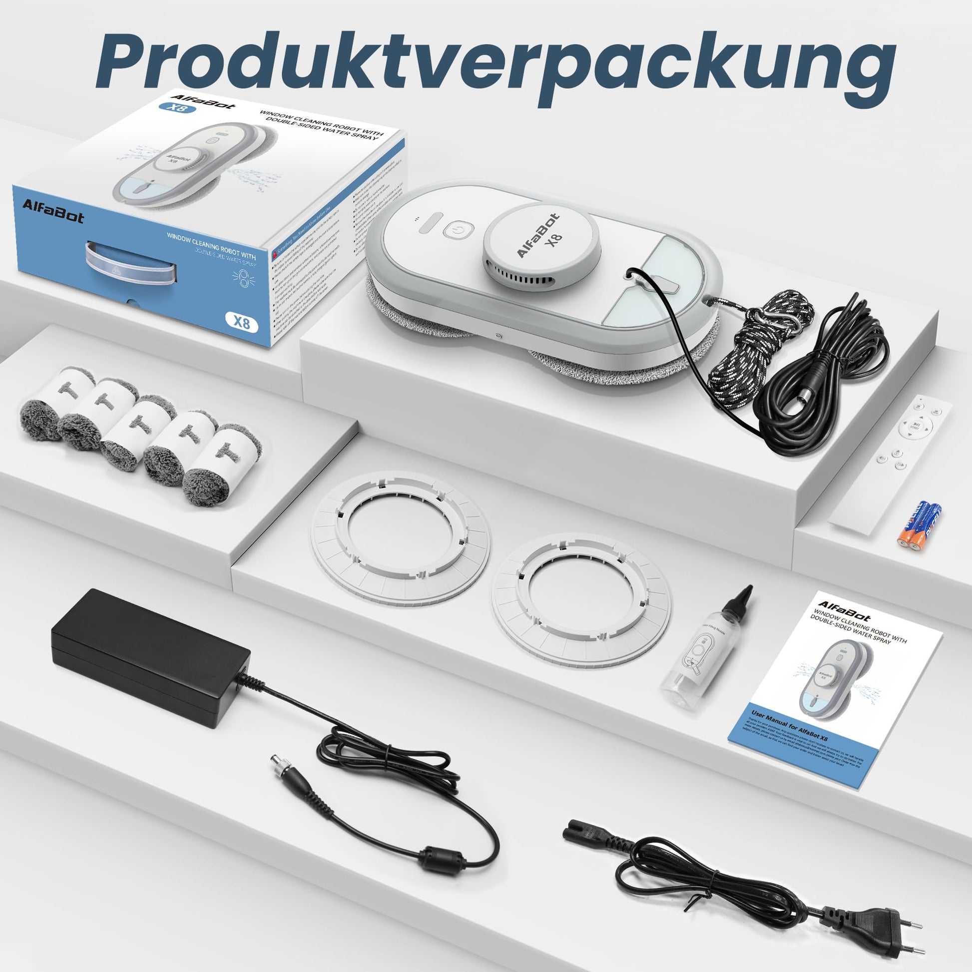 AlfaBot X8 window cleaning robot, electric window cleaner robot, glass cleaning robot with water spraying function in two directions, remote control, voice support in English, auto sprayer.