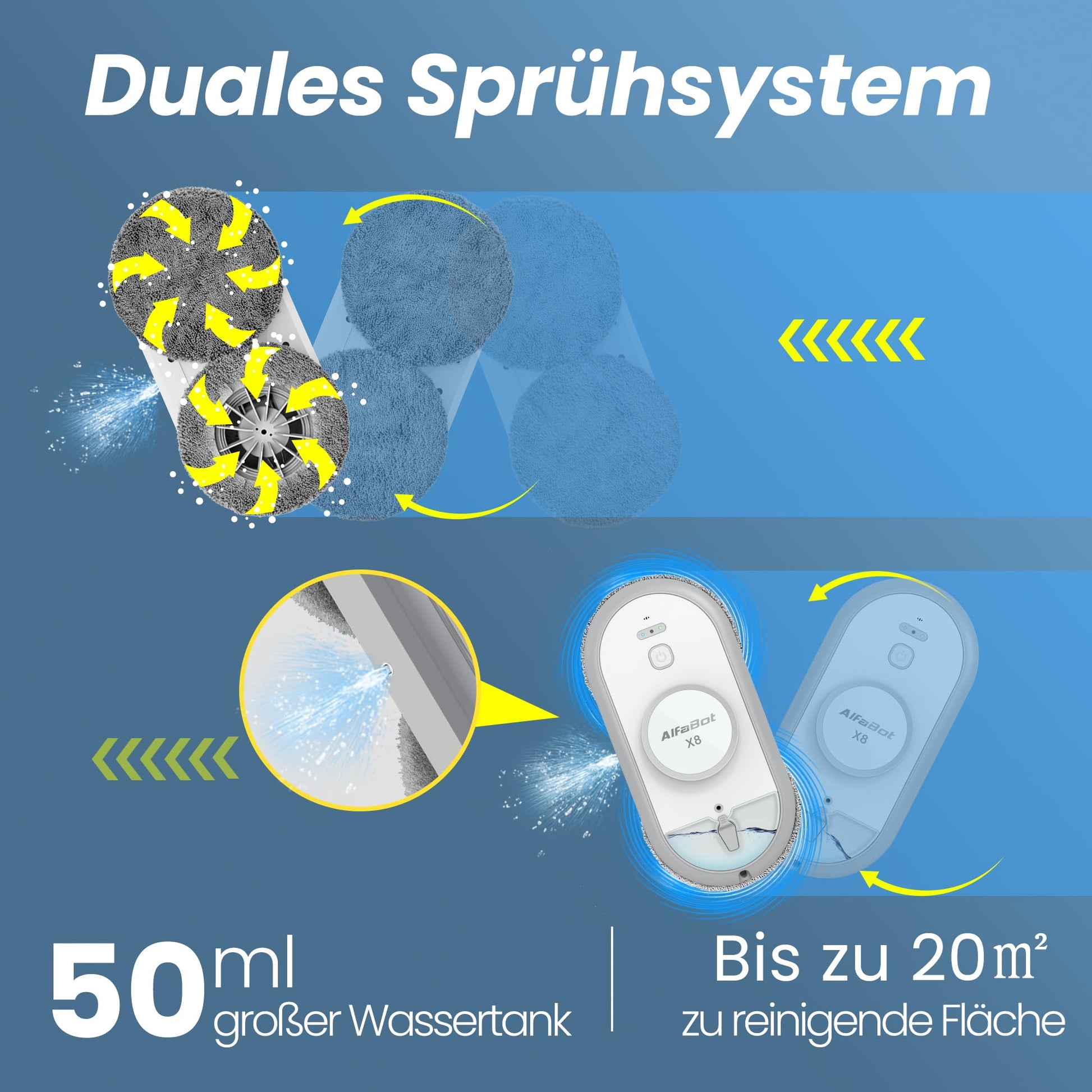 "AlfaBot Electric Window Cleaning Robot, efficient cleaning with automatic spraying. Thanks to the two water outlets, it can spray in two directions, with the right outlet spraying water when moving to the right, as well as the left outlet."