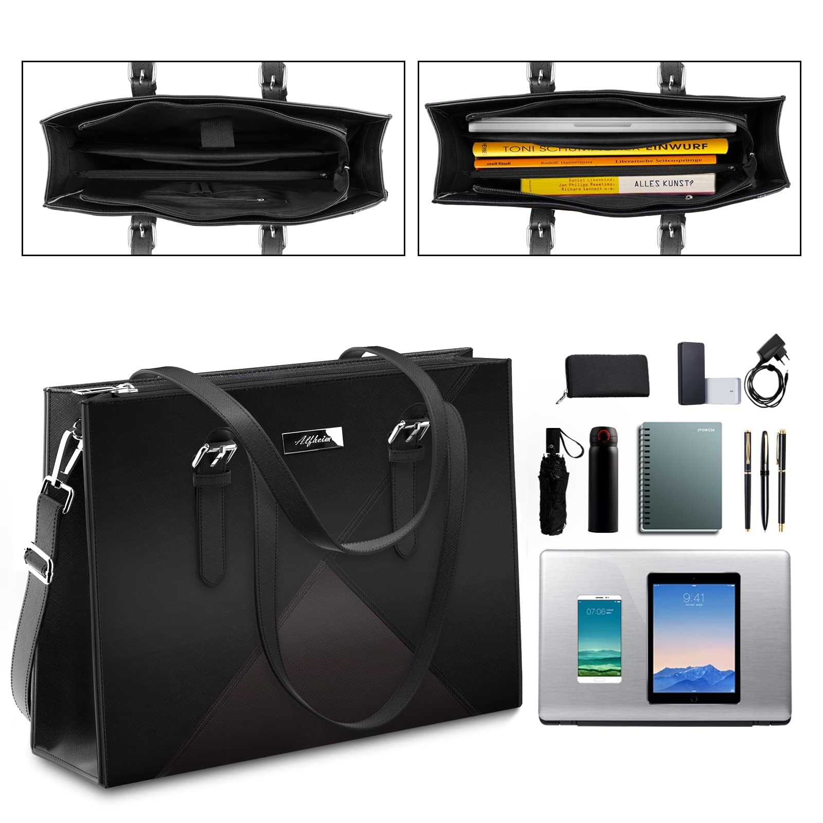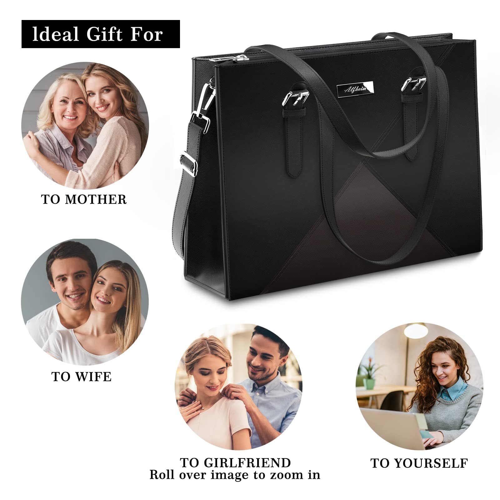 ["Durable PU material】Alfheim ladies' handbag laptop bag is made of high-quality PU leather and polyester lining. High-quality leather makes women's laptop handbags water resistant, scratch resistant, softer, and more durable. With a durable top zipper and a professionally padded pocket, your laptop and essentials are secure. The fashionable stitching color makes this large business women's bag a bag that is at the forefront of fashion trends.