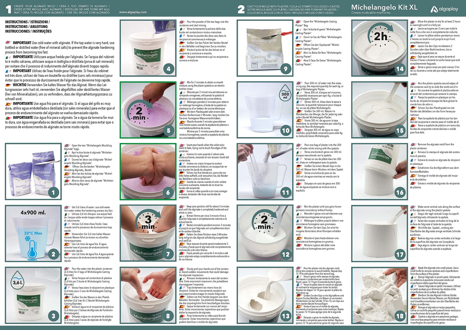 "Contents: 2x450 g Michelangelo Moulding Alginate, 2x1 kg Michelangelo Casting Plaster, 1 liter measuring carafe, 1 mixing spatula, illustrated instructions in 6 languages"