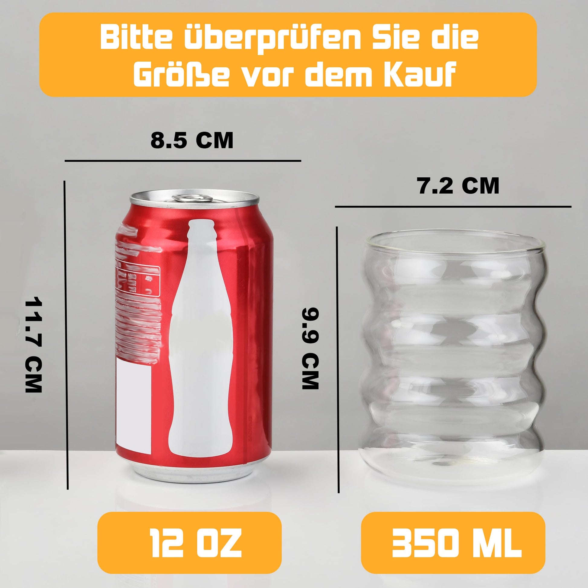 ["CUPS + STRAWS + BRUSH SET - Includes 4pcs clear creative drinking glass cups, 4pcs glass straws (2 straight 2 bent), 1pcs straw cleaning brush. Capacity: 12 oz/350ml","CREATIVE WAVE DESIGN - Unique wave style with European retro taste, easy to grip for kids and adults. Very practical and easy to store","MULTI-PURPOSE: Can be used for water, yogurt, ice cream, milkshakes, cocktails, juice, beer, iced coffee, etc. Suitable for households, bars, dessert shops, and other places","DISHWASHER SAFE - Made of high-quality borosilicate glass, sturdy, thick, and durable, break and chip resistant, dishwasher safe and easy to clean","SAFE PACKAGING - We use cardboard packaging, simple and safe. This makes our cups perfect for giving as gifts.","Tip: Our cups are 350 ML small cups, please confirm the size you need before ordering. We also have the same type of 530 ML cups for sale, you can buy as needed."]