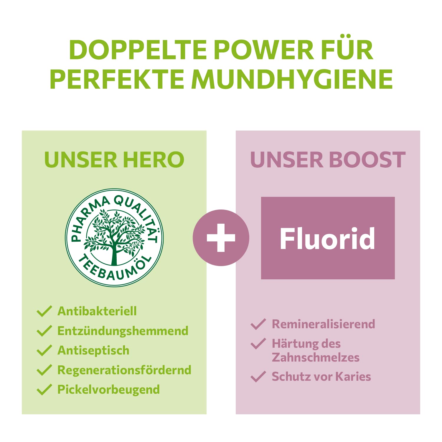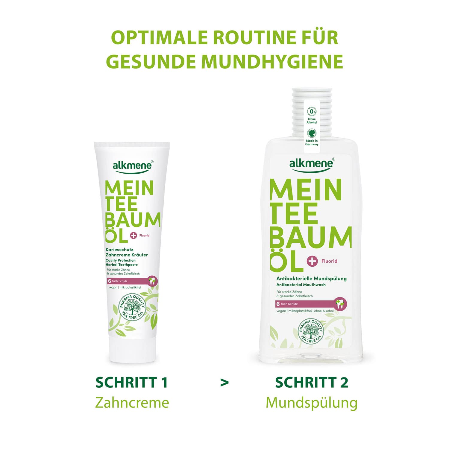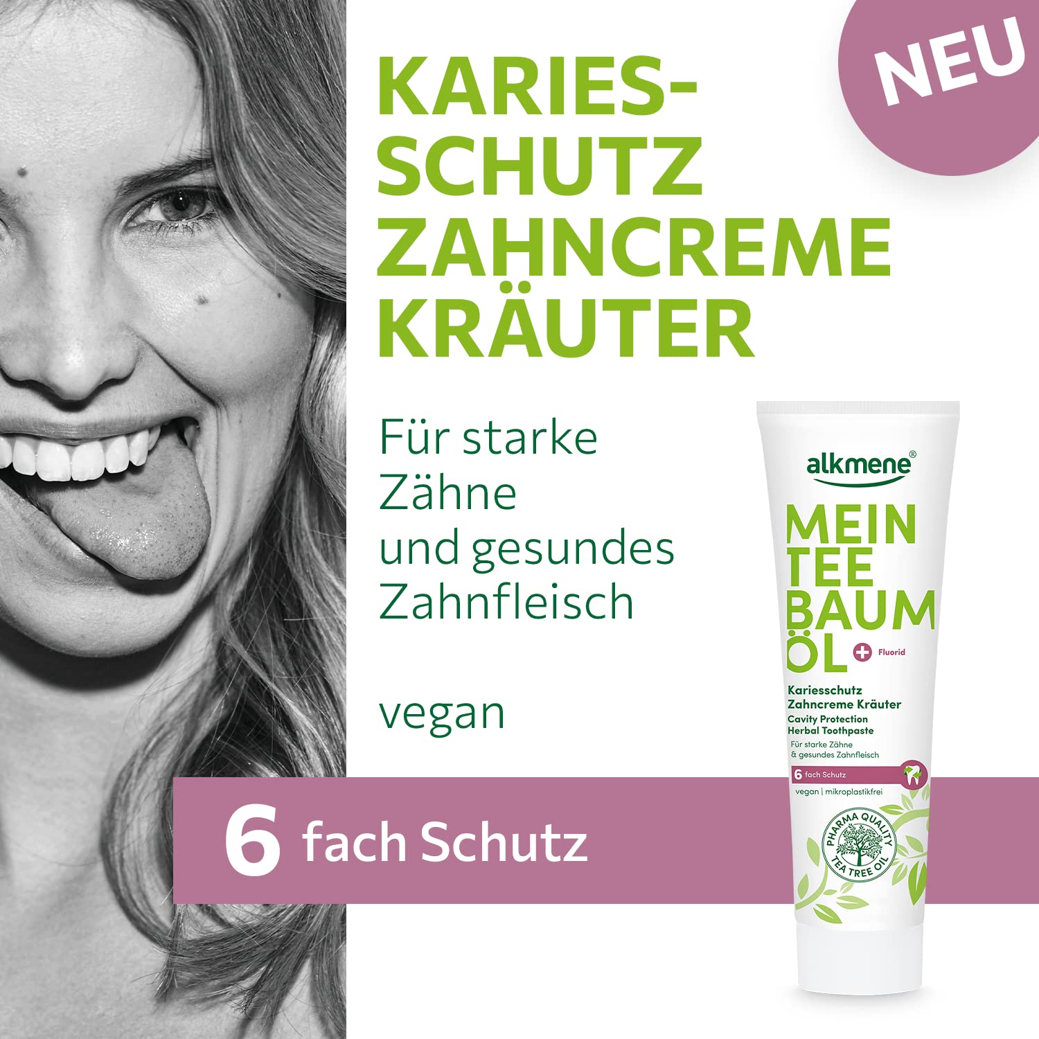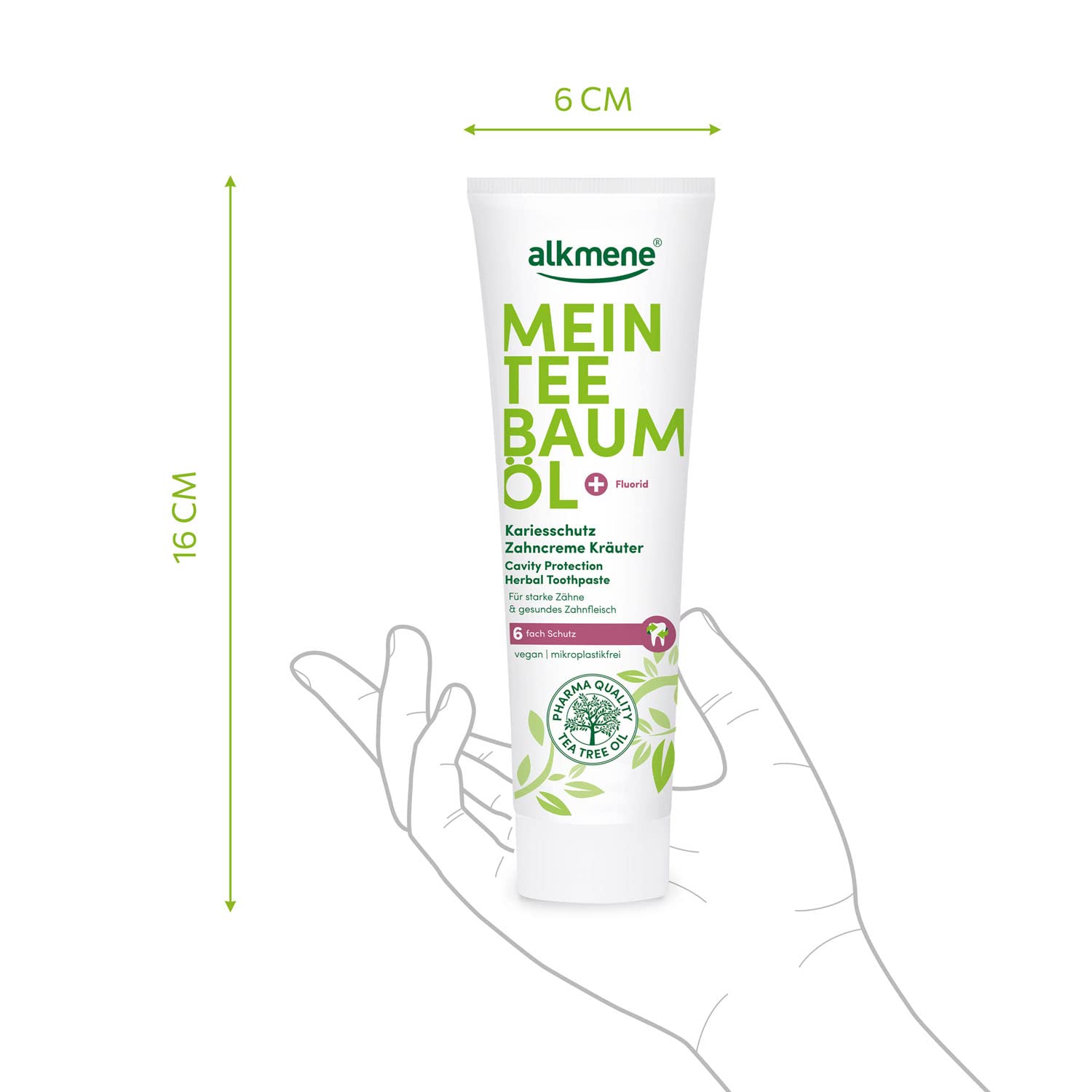 "MY TEA TREE OIL toothpaste for men & women - the caries protection herbal toothpaste with the unique active combination of tea tree oil and fluoride and refreshing herbal aroma works 6-fold","AUSTRALIAN TEA TREE OIL 100% pure in pharmaceutical quality - known for its versatile and natural effectiveness","FLUORIDE - remineralizing and caries protective","GOOD FOR SKIN & ENVIRONMENT - climate-neutral product, dental tested, microplastic-free formula, recyclable packaging, folding box made of 85% recycled material","DELIVERY includes 6x 100 ml alkmene caries protection herbal toothpaste with tea tree oil & fluoride - provides 6-fold protection - caries protection / reduces bacterial plaque / sugar acid protection / gum protection / strengthens tooth enamel / fresh breath"