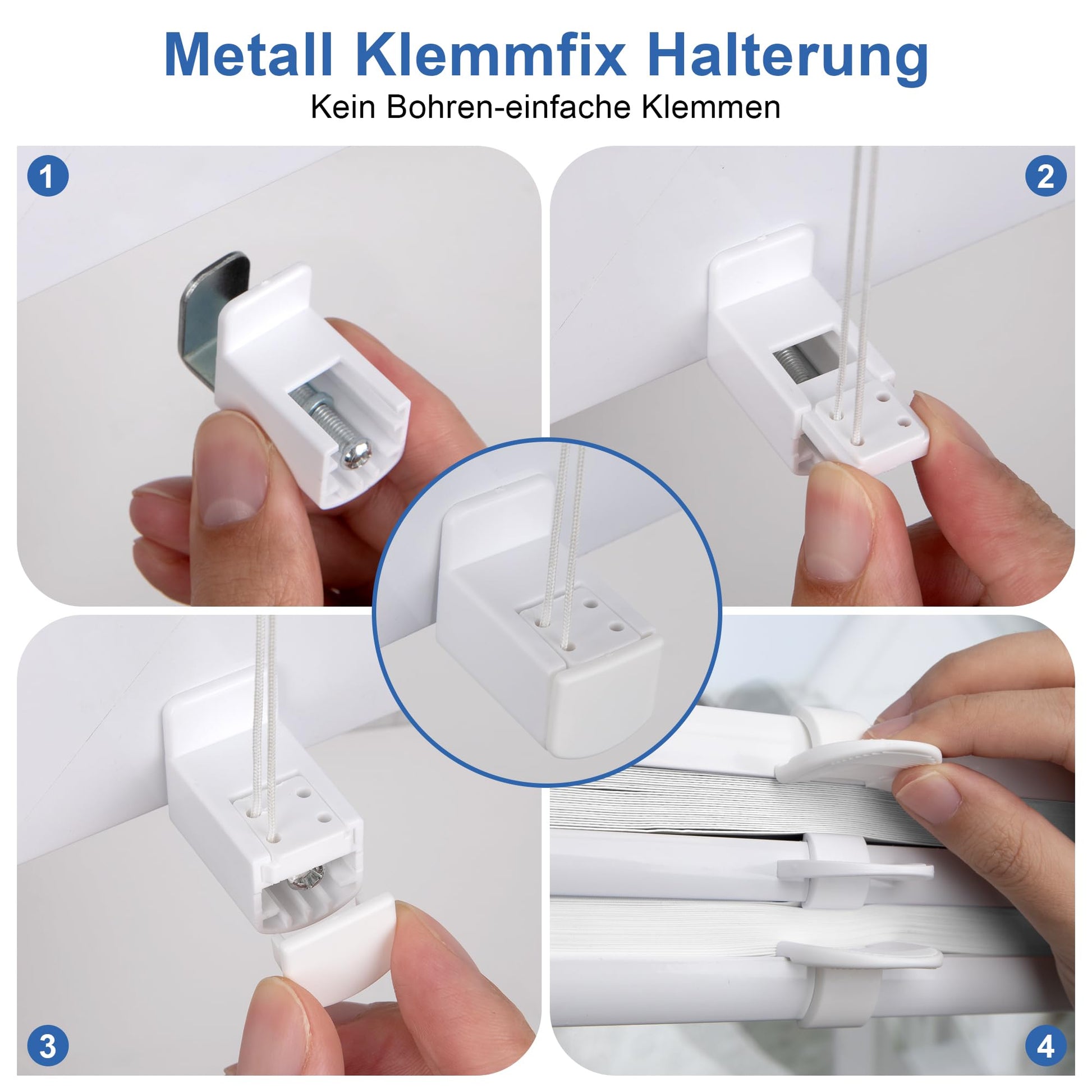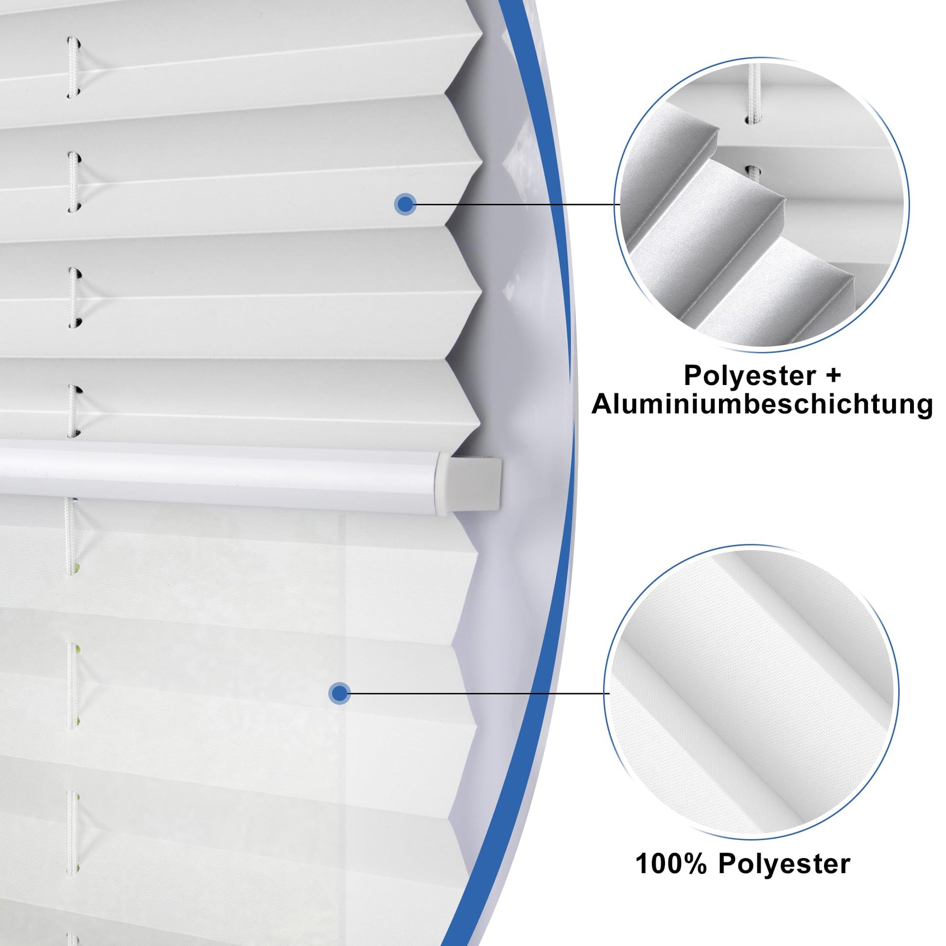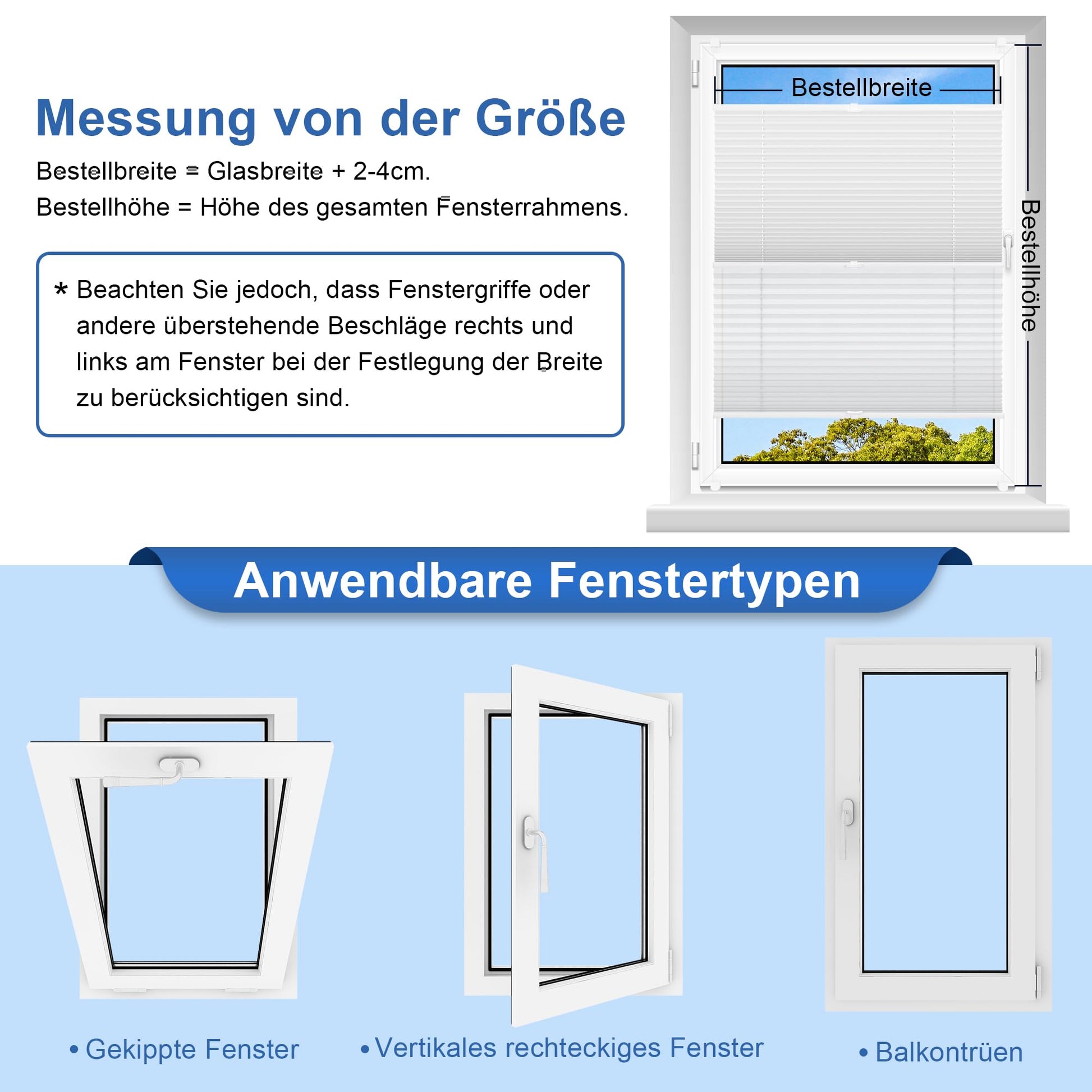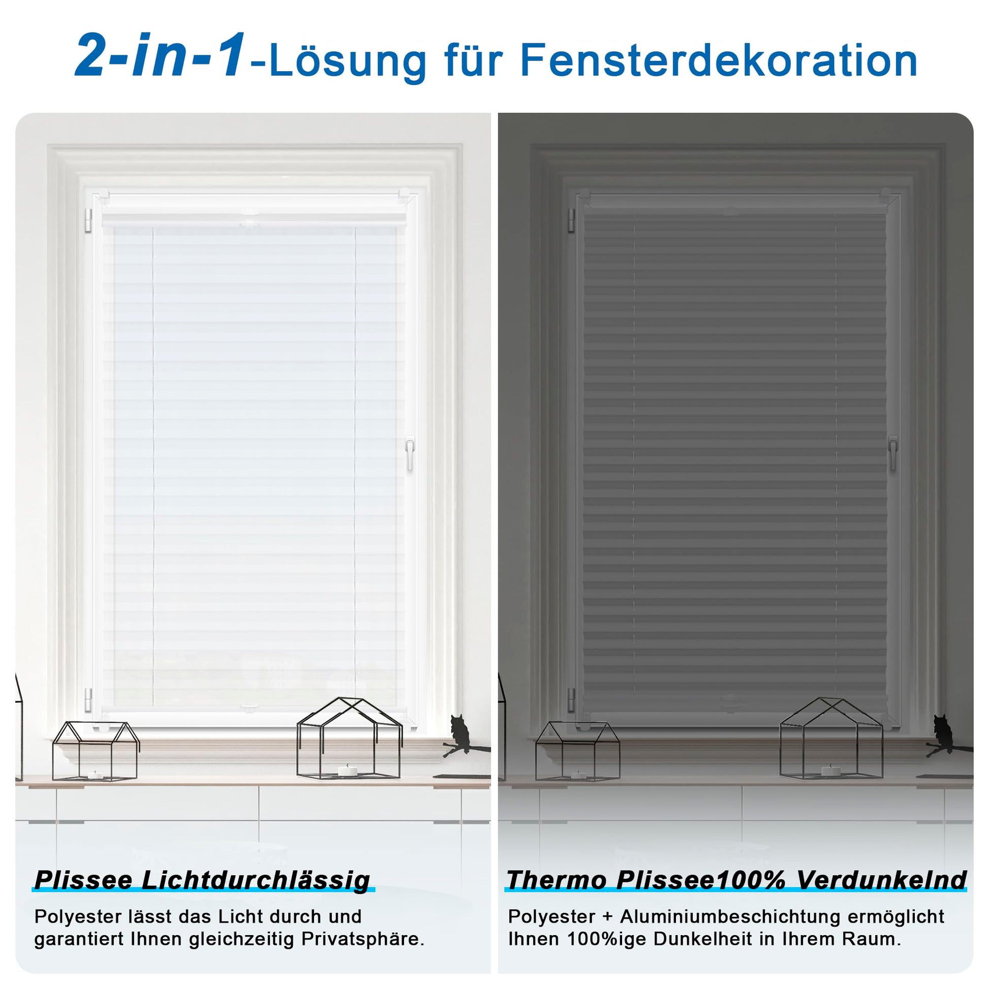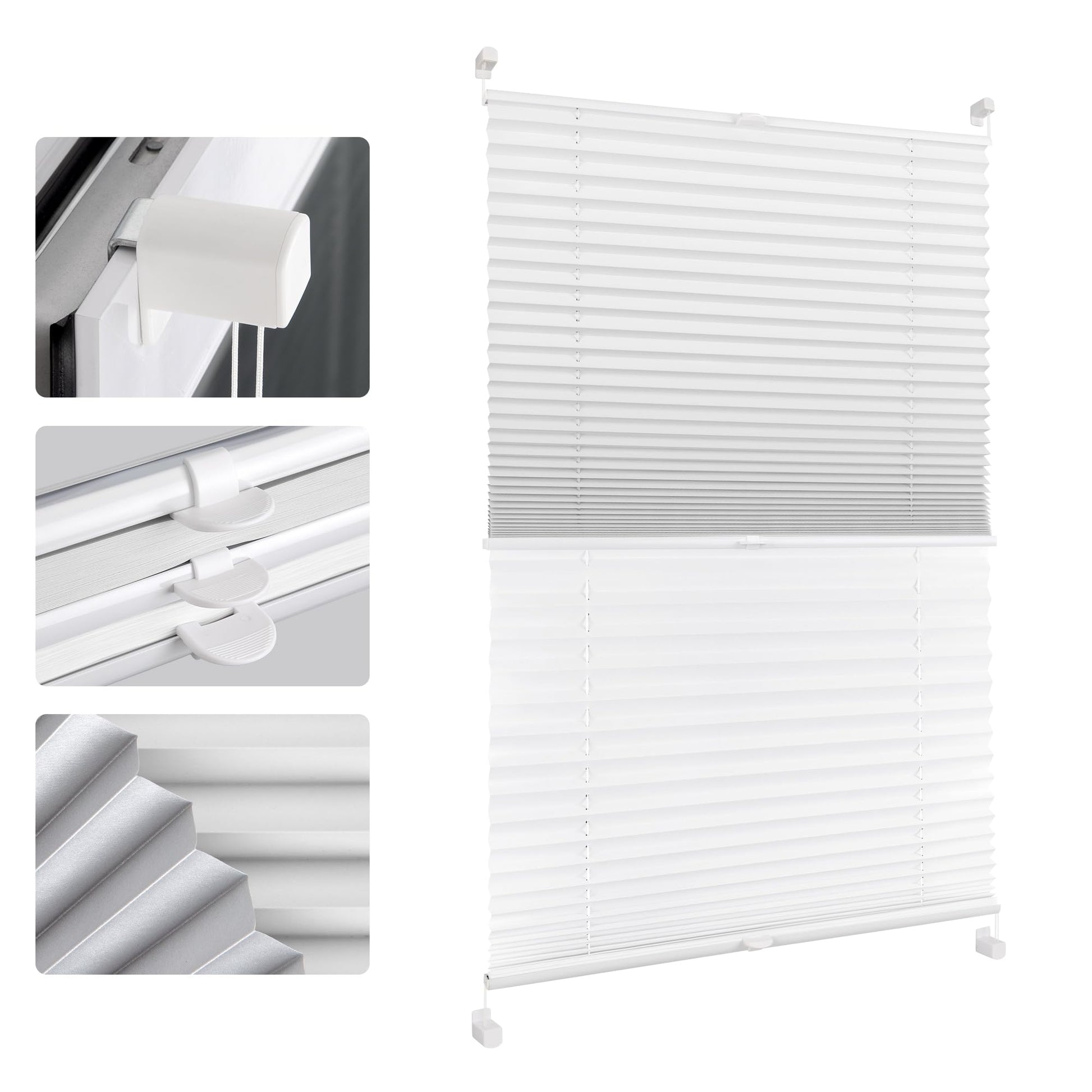 ["【2-in-1 Solution for Window Decoration】: Translucent or 100% blackout? The new EasyFix pleated blind 'Day + Night' is a great idea for a 2-in-1 solution. During the day, the light Day fabrics keep curious looks out without darkening the room. In the evening or in case of too much sunlight, the insulating coating of the dark Night fabrics ensures absolute darkness and a pleasant sleeping environment. Obviously, this is an optimal energy and money-saving solution.","【Adhesive & Clamp Mounts】: 4 metal clamp mounts with white cover cap for tensioning the pendant fuse. Without drilling and screws, the clamp mounts can be attached directly to the window sash. As an alternative to clamps, Easyfix pleated blinds also offer 4 adhesive mounts. Aesthetic, quick & easy installation of pleated blinds without special tools. Not suitable for humid environments, kitchens, bathrooms!","【Continuous Adjustment with 3 Aluminum Rails】: Thanks to 3 aluminum operating rails, the fabric panel can be slid up and down as desired. Use just one hand movement to adjust the opaque – and at the same time translucent – version.","【What Size Should I Order】: Please measure the width of the glass when purchasing. We recommend that you order the blinds for windows 4cm wider than the width of the window pane to achieve a better blocking effect. Width of the window pane is 51cm, then the order width is 2cm + 51cm + 2cm = 55cm. Length.","【Package Includes】: 1 x pleated blind for clamping, all mounting parts incl. 4 x metal core clamp mounts for mounting on the window/balcony door frame, 3 x handles, 1 x German operating and assembly instructions."]