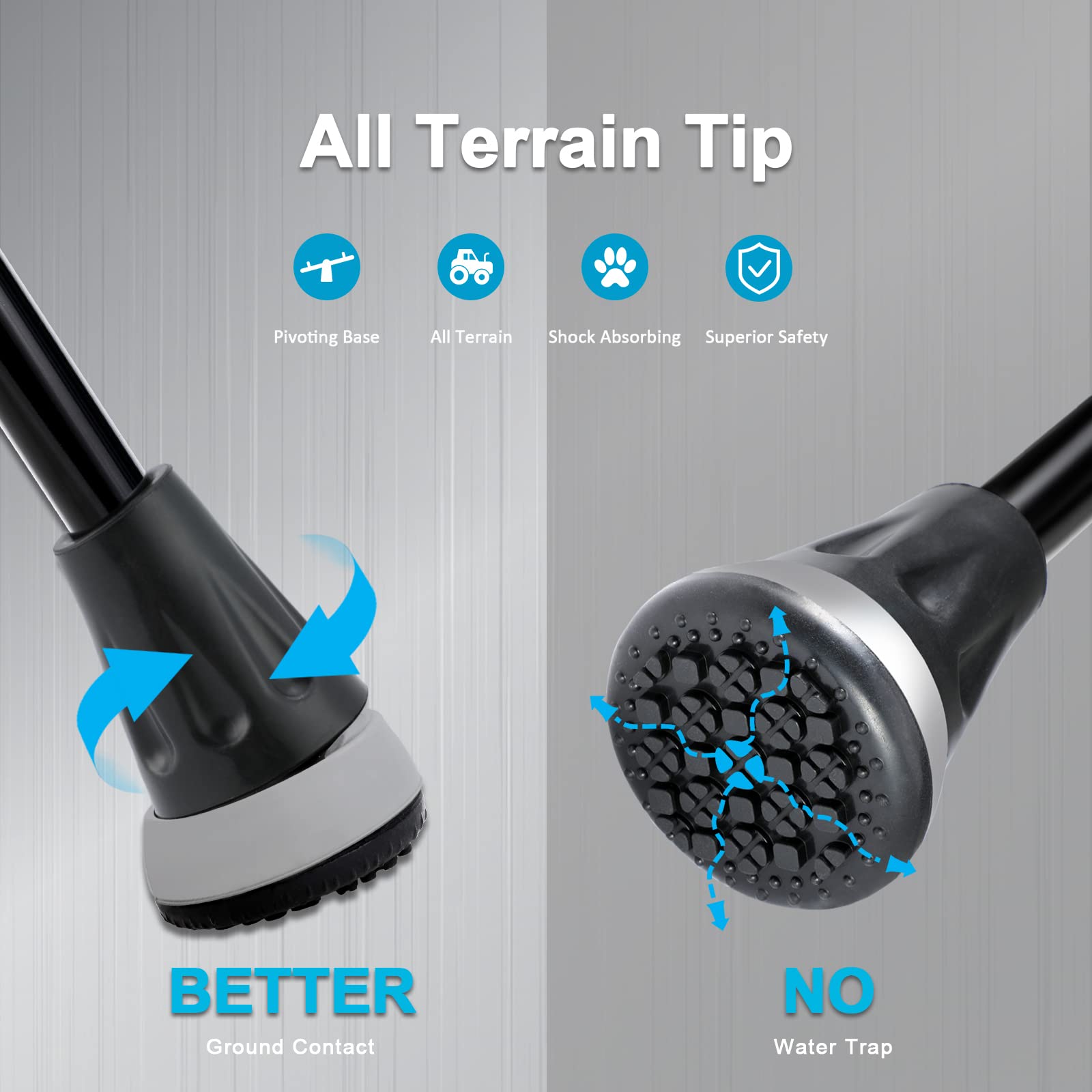"SWIVEL & SHOCK-ABSORBING: Advanced patented technology combines these two functions into one. An all-terrain swivel and non-slip bottom provides superior stability and ground contact on uneven surfaces. The multi-layer rubber structure absorbs shocks and cushions the impact on joints and muscles from bumps. The entire base system maximizes safety in daily mobility needs.",