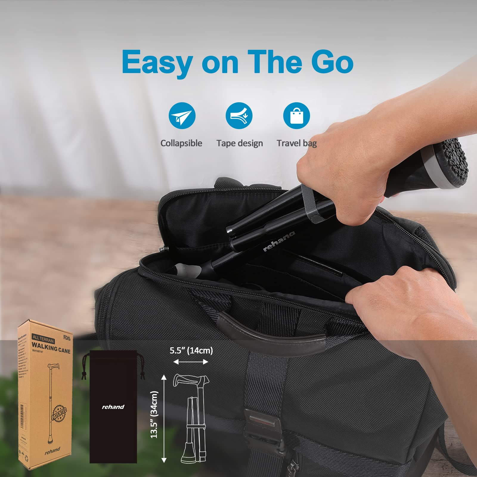 "PACK IT UP: Equipped with a durable and lightweight aluminum frame and a collapsible design, this folding walking stick can be packed in seconds and easily placed in a briefcase, wheelchair bag, or even a handbag. A premium Velcro strap on the stick shaft is standard and can be used to securely attach the stick. All thoughtful designs make carrying and storing a breeze.",