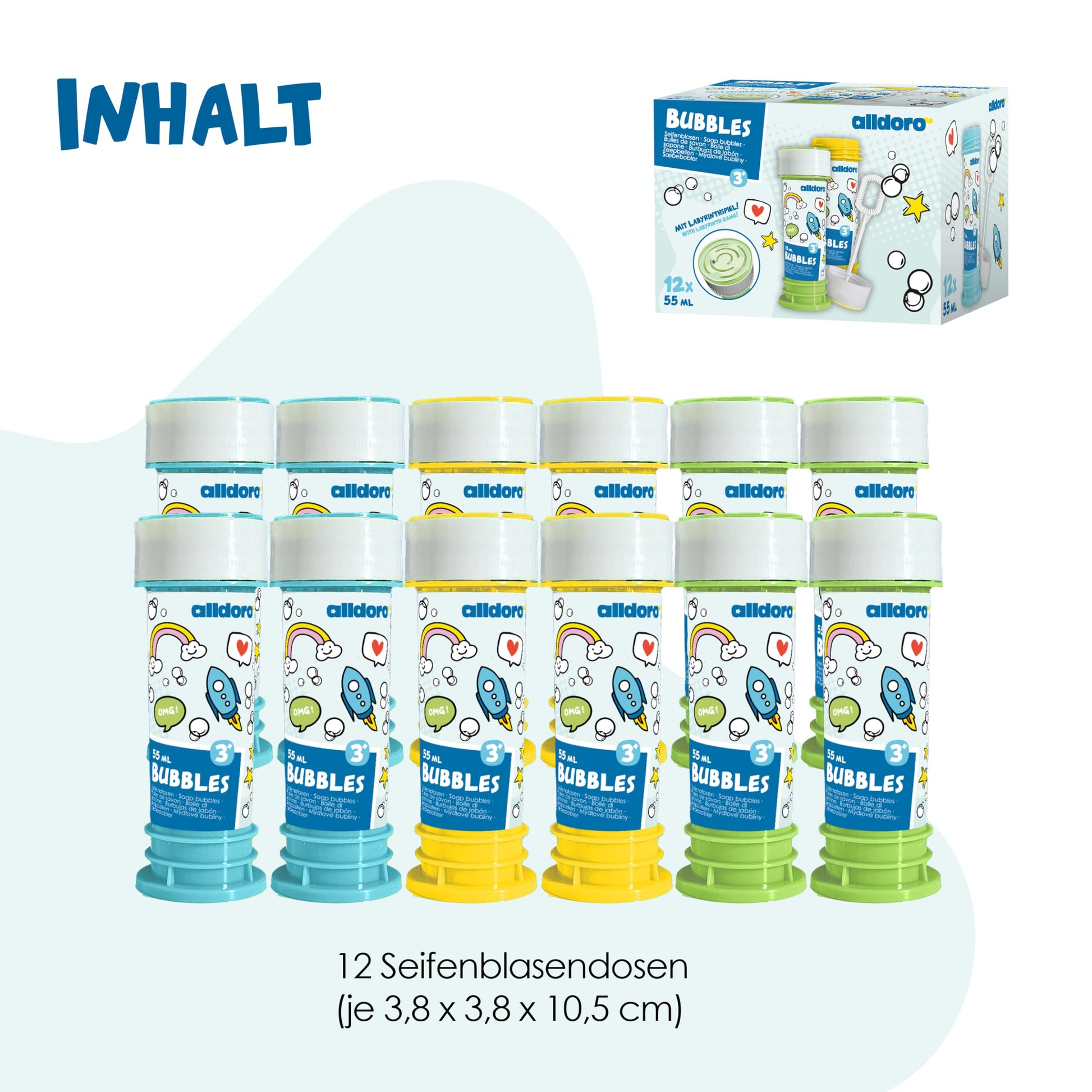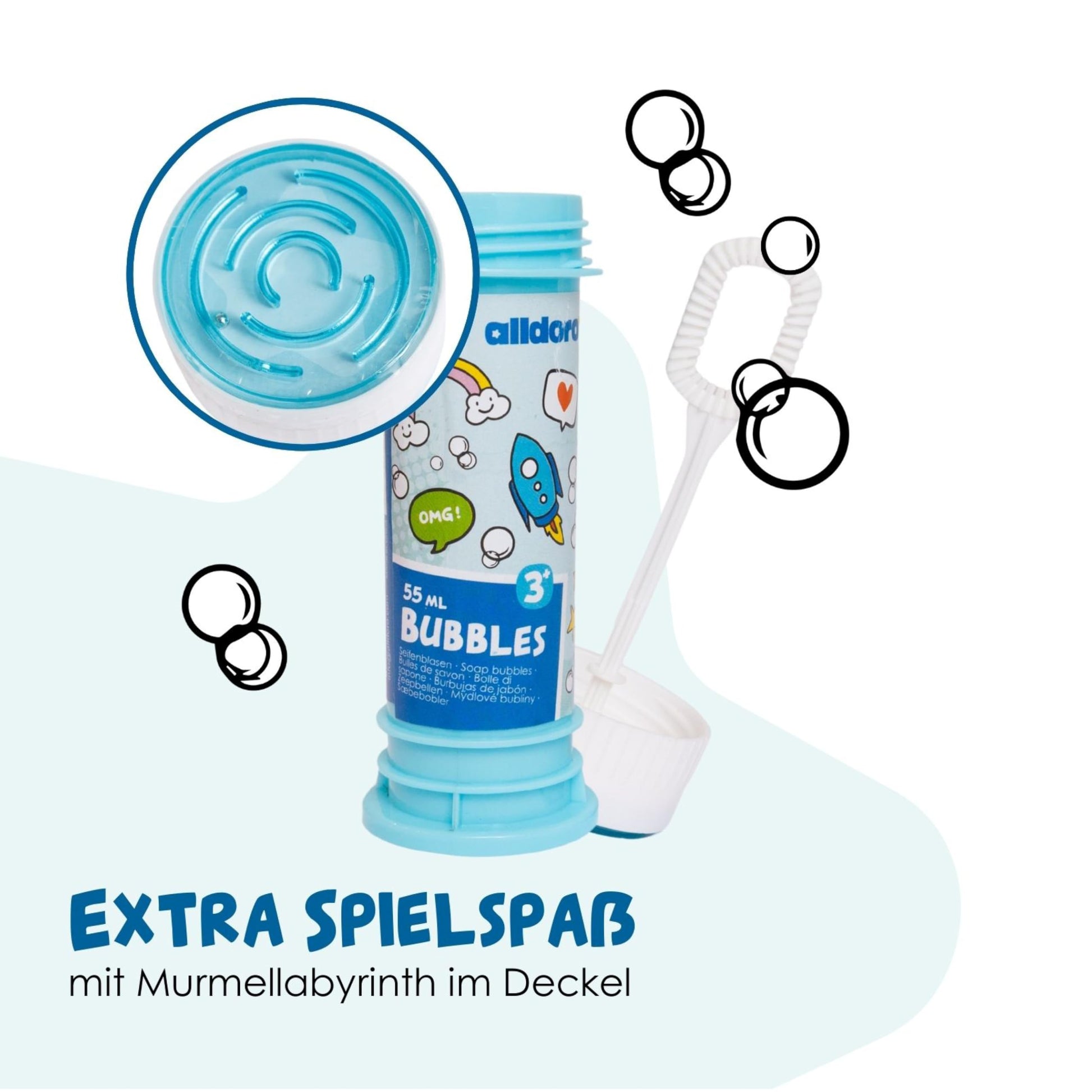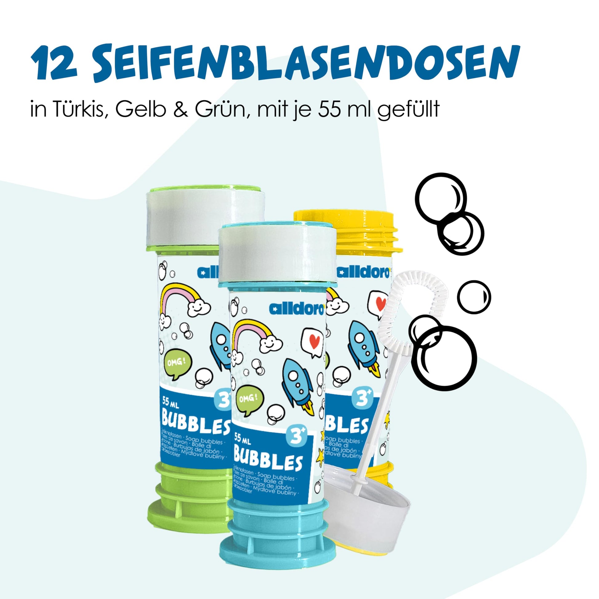 ["Execution - The bubble bottles are equipped with a bubble wand and a marble maze game in the lid. They delight young children and adults with beautifully shimmering bubbles","Content - Each refillable flask contains 2 fl oz of bubble solution, delivered in a 12-pack. Easy to use indoors and outdoors for boys and girls aged 3 and up","Gift - Thanks to double the fun and pocket size, perfect as a party favor for kids' birthdays, school start, bachelorette parties, stag parties, weddings, or graduation celebrations","Atmospheric - The bubble set creates a festive atmosphere. Great for playing and keeping busy in a festive setting, together with siblings or friends, suitable for all ages","alldoro - Supporting the little heroes of tomorrow today with great playing experiences: indoor and outdoor toys with cool designs to discover and experience your own superpowers"]