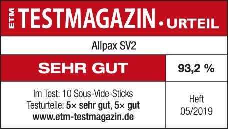 ["YOUR PERFECT DINNER: The professional Sous Vide cooker SV 2 by Allpax in optimized version guarantees you success in the kitchen and perfectly cooked food - with a powerful 1400 Watt heating up water baths with a capacity of up to 30 liters, for optimal vacuum cooking.","OPTIMAL COOKING RESULT: Thanks to the gentle vacuum cooking method at low temperatures, all flavors and nutrients are preserved, so you can cook particularly tender meat and crispy vegetables in vacuum bags as well as dishes in jars such as Crème Brûlée and even make yogurt.","START-UP: The device is hung for operation in a pot or container at least 20 cm high, attached to the wall with the knurled screw - then the vessel is filled with water so that a water depth between 19 to 25 cm is given.","SETTINGS: The water temperature in °C and °F as well as the cooking time can be set precisely up to 99 hours via the touch panel, while the cooking process can be read off the LC display, even though it does not need to be monitored thanks to the integrated circulation pump.","DELIVERY: 1 x SV 2 Sous Vide cooker, powerful kitchen aid from Allpax for vacuum cooking of food in a water bath."]