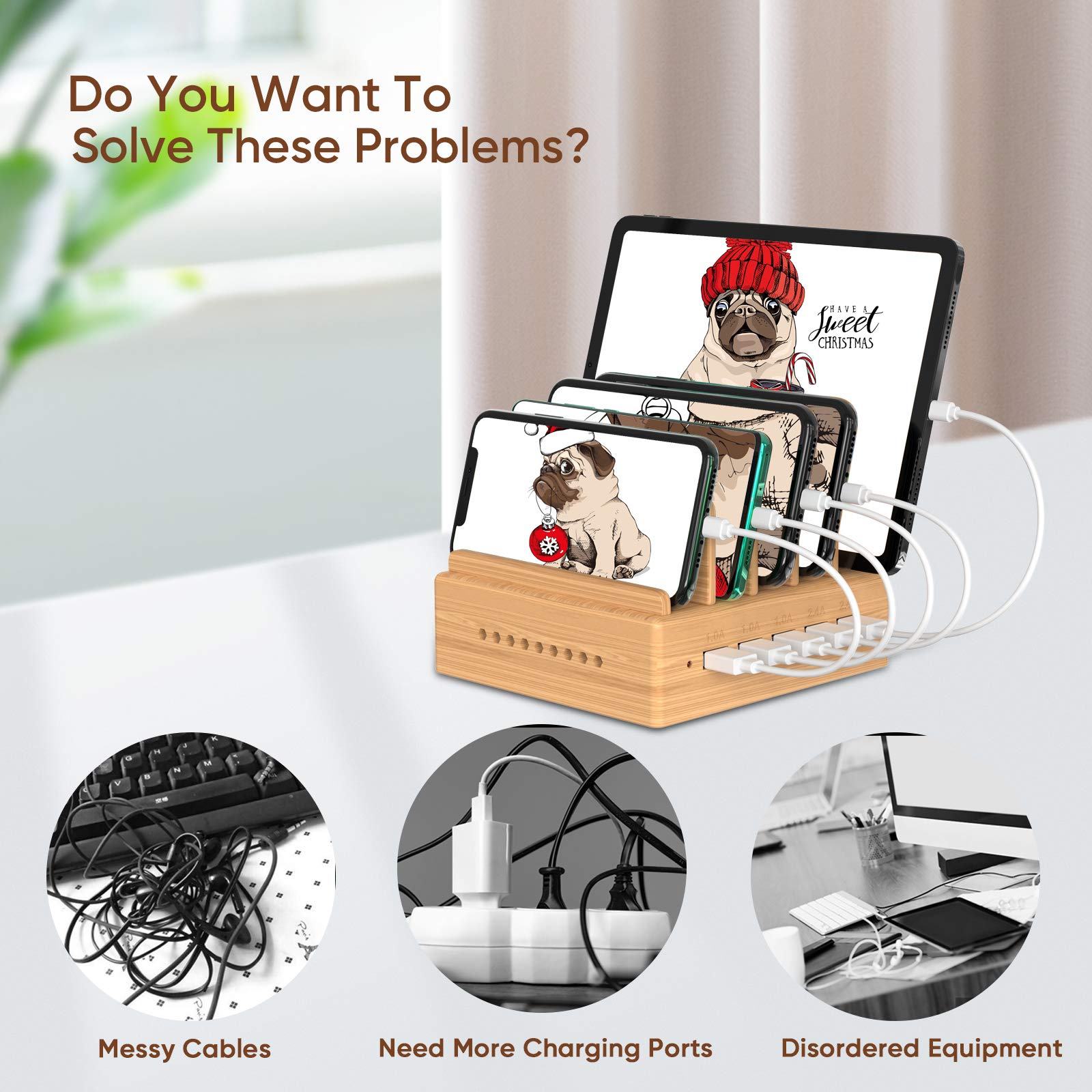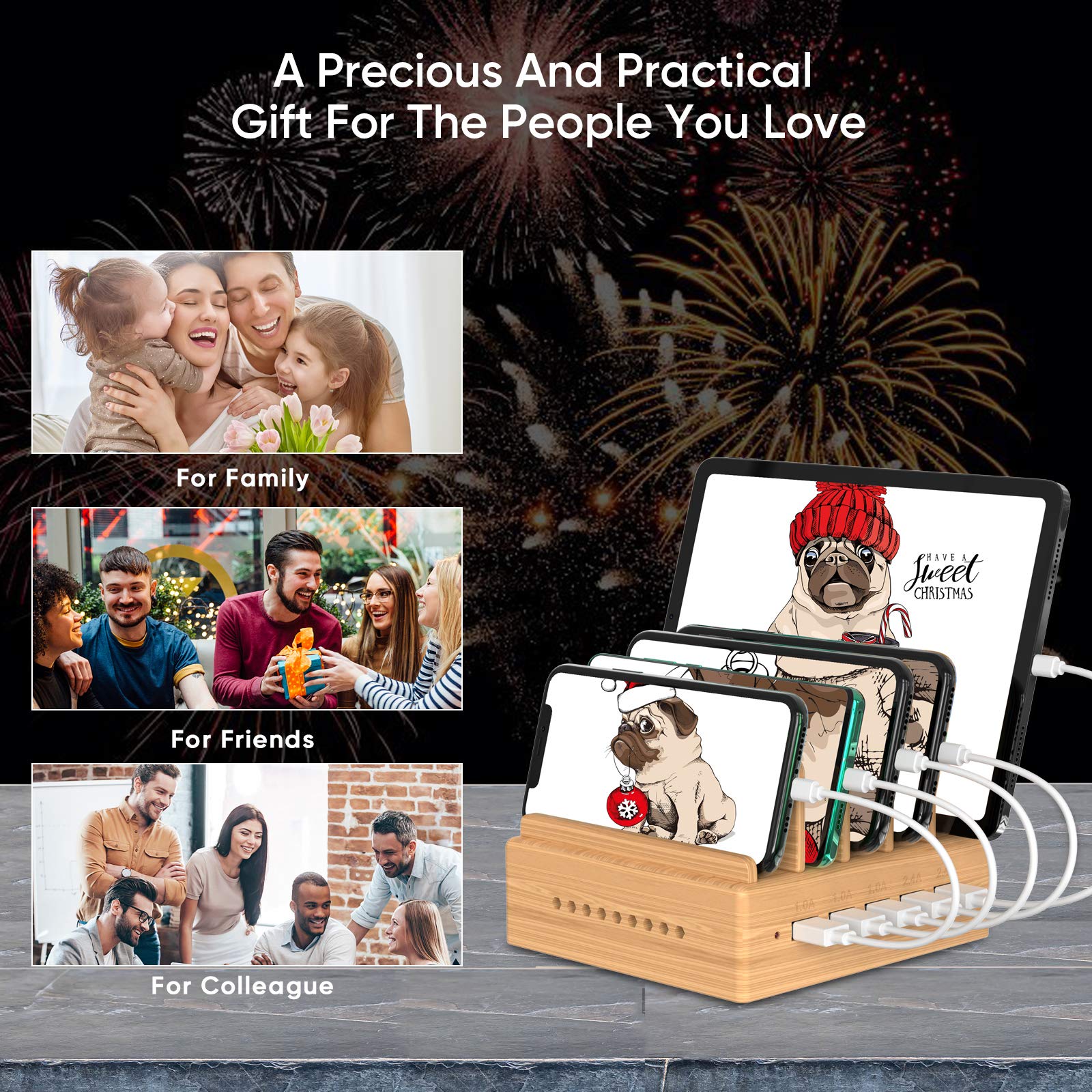 ["✅SAFE CHARGING STATION: CE, RoHS, FCC approved. Built-in overcurrent protection, overvoltage protection, overload protection, leakage protection, short circuit protection, flame retardant protection. Protect your charging station and phone in all directions.","✅5 IN 1- Designed with 5 USB fast ports (0-2.4 A / port) and an internationally compatible AC 100-240 V alternating current. Keep your 5 devices in one place while charging. No more searching for chargers and cables everywhere. Bring them a convenient and neat life.","✅CLEAN AND ORDERLY: No more mess. A bamboo charging station for simultaneous charging of any phone, tablet, and other USB devices. This multiple charging station keeps all phones in one place for a nice, clean, and tidy workspace. It comes with 3 cables for iOS products, 1x mini USB cable, and 1x Type-C cable.","✅ COMPATIBILITY FOR MULTIPLE DEVICES - Our phone charging station features 5 USB ports that can charge 5 devices simultaneously. This USB charging station is suitable for all devices, universally compatible with iOS and Android phones, tablets, cameras, speakers, and other USB devices.","✅ IDEAL GIFT FOR FRIENDS- We choose a 5-year-old bamboo material. The natural texture gives your home and office a more noble appearance. After fine polishing and design, you will see a beautiful decoration. And packaged in a pretty gift box, perfect gift for your family and friends."]