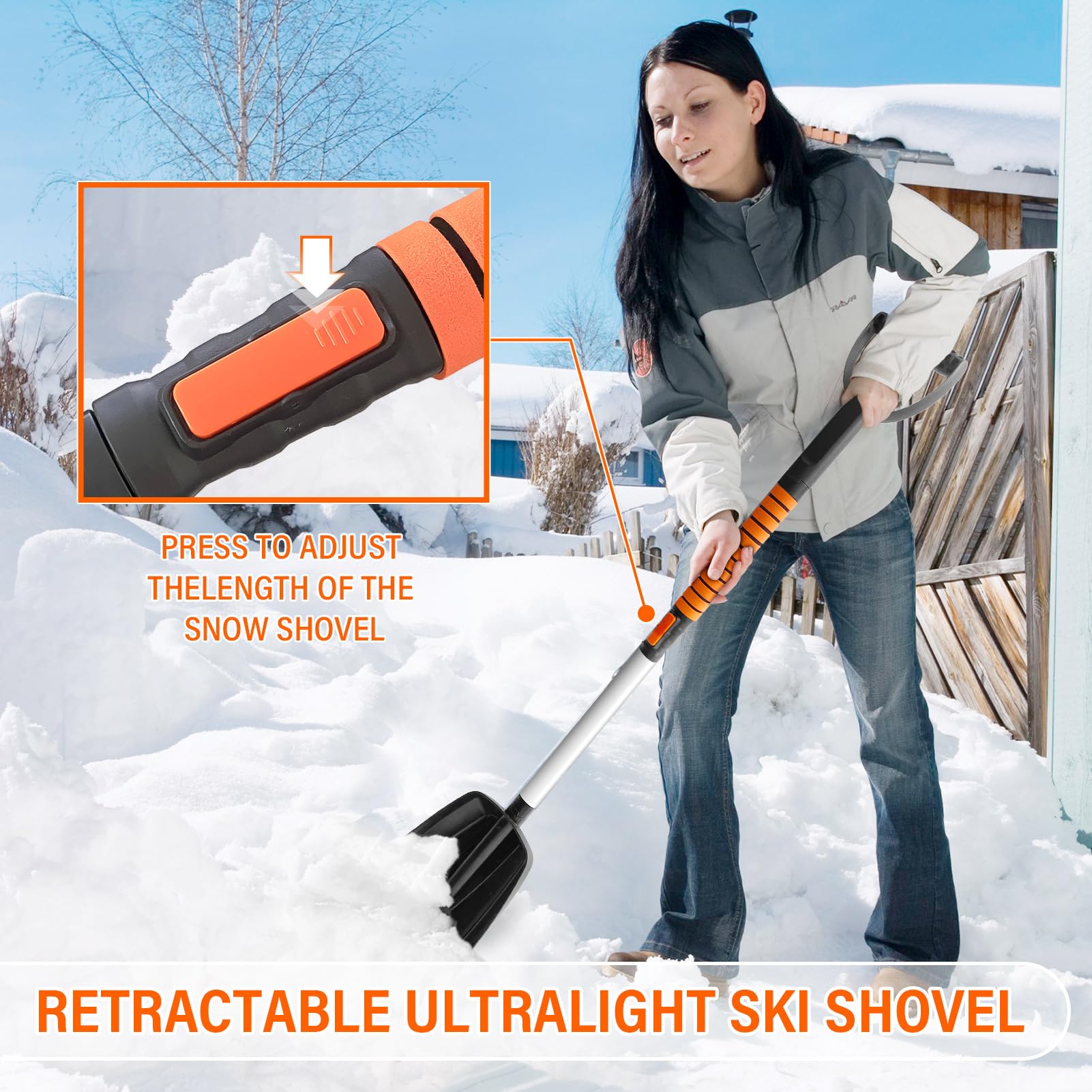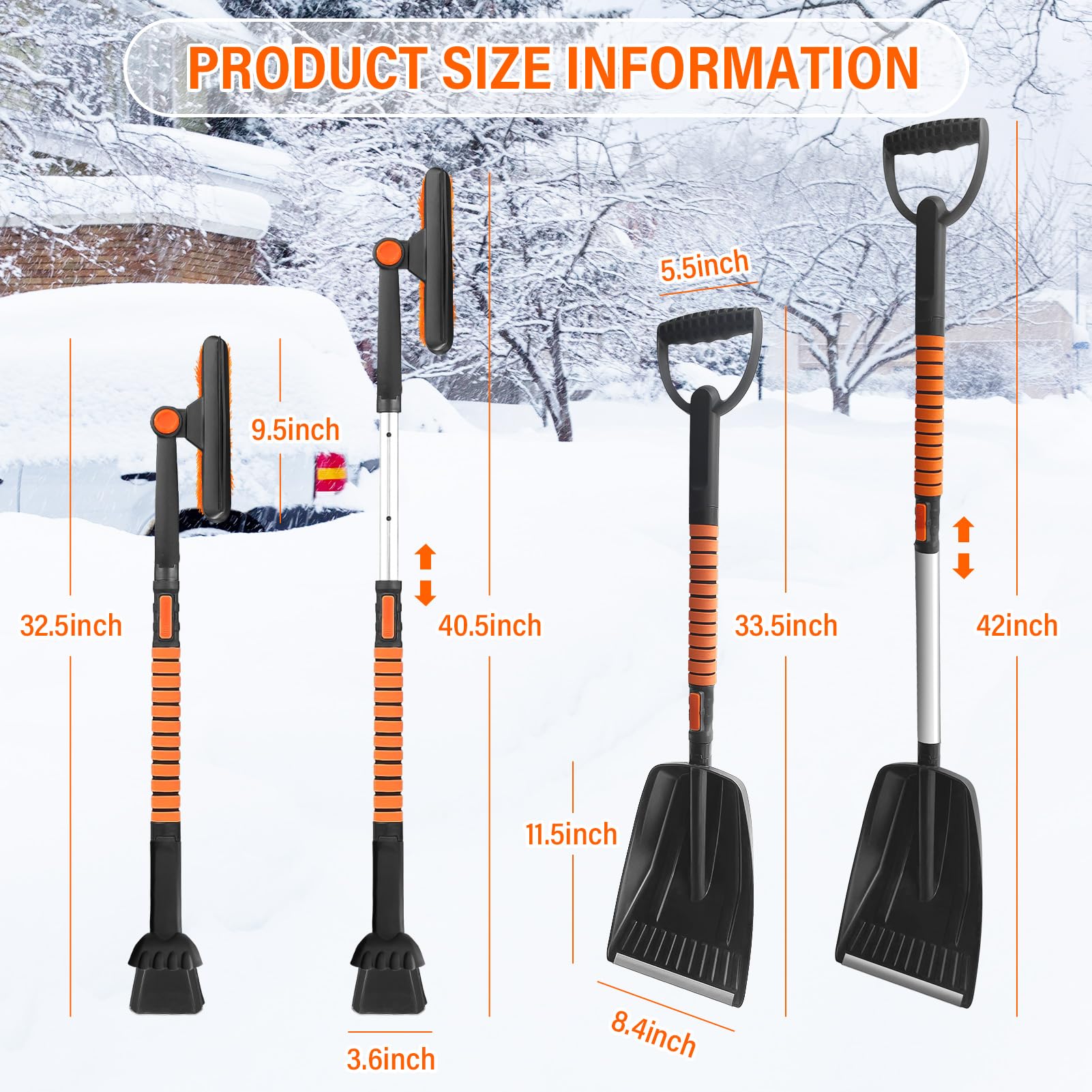 【Versatile design】Our well-designed snow scraper and brush set offers multipurpose use. The extendable snow brush easily removes snow from the roof, windshield, and hood of your car, while the ice scraper quickly eliminates frost from the glass. The sturdy and expandable snow shovel allows for faster snow removal.",