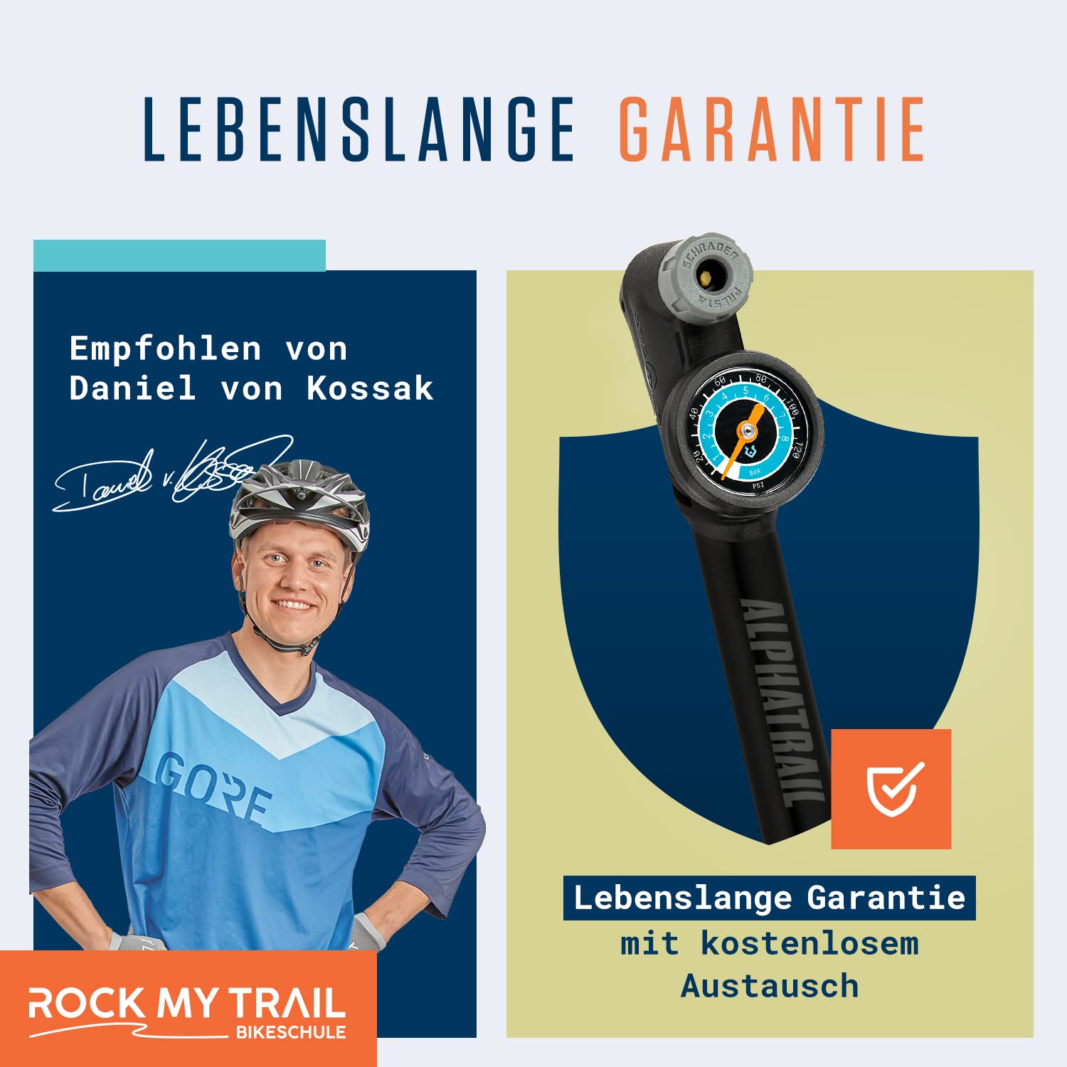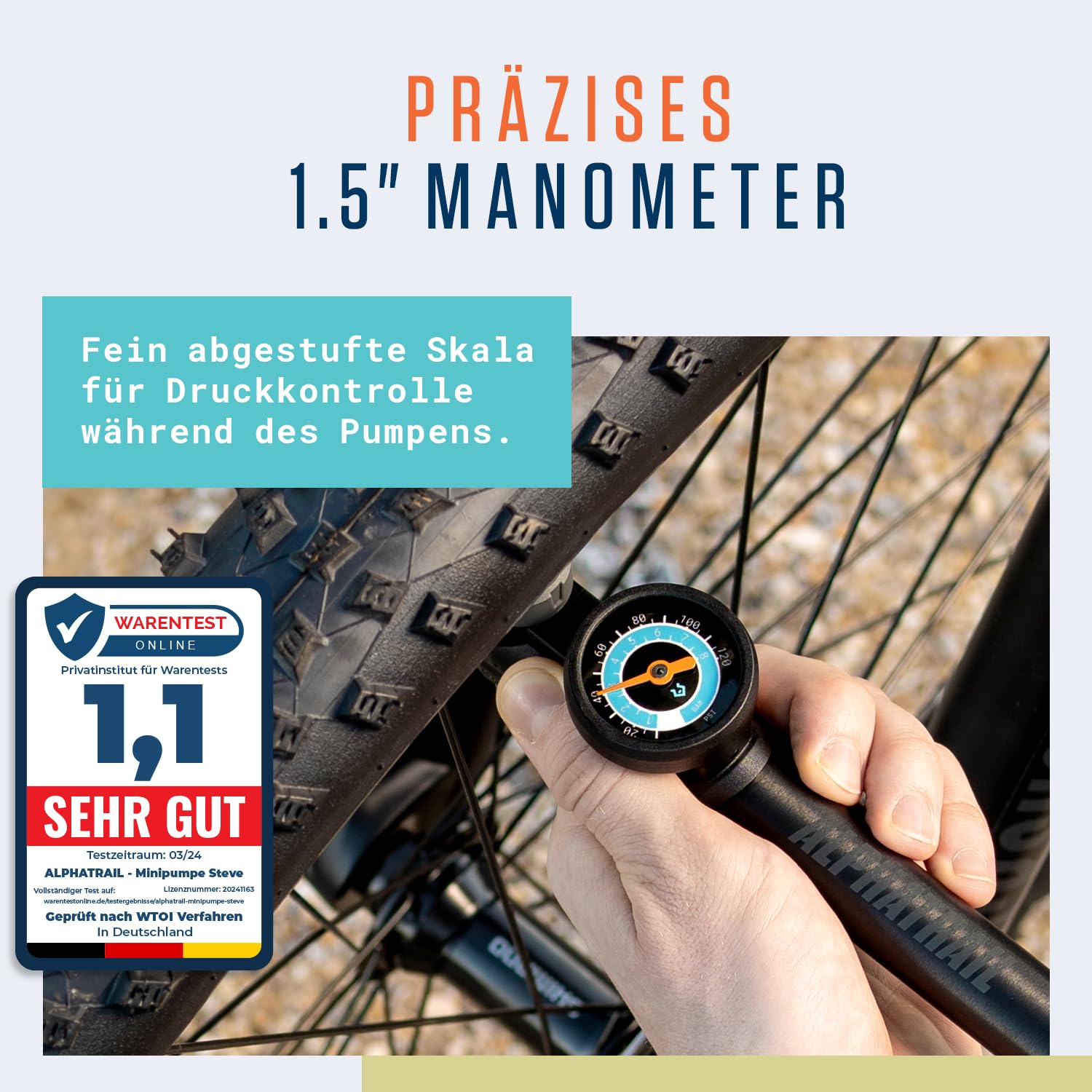 Alphatrail Minipump Steve - Suitable for all valves 8.3 Bar / 120 PSI max pressure I Large round gauge (Ø32mm) I Ergonomic T-handle I Pump for French, Schrader & Dunlop valves