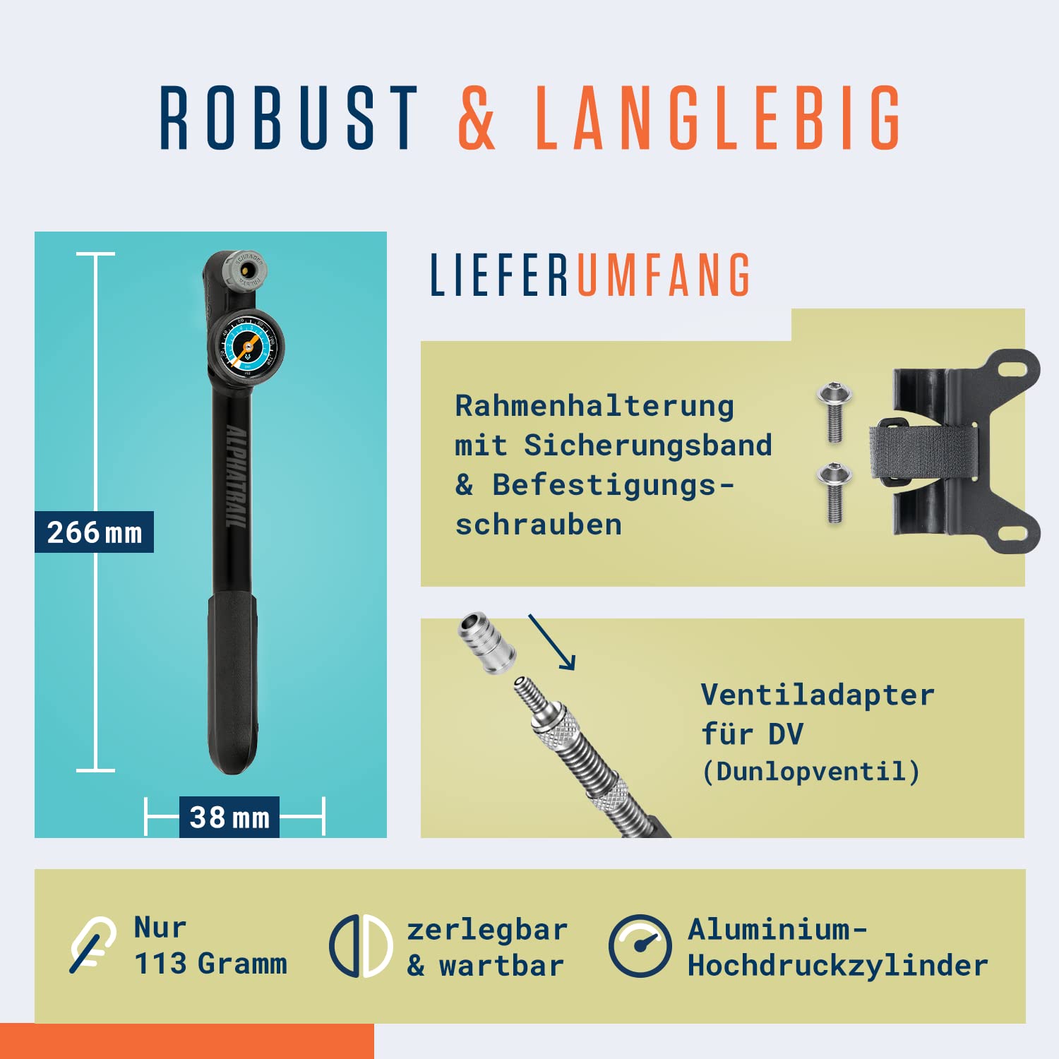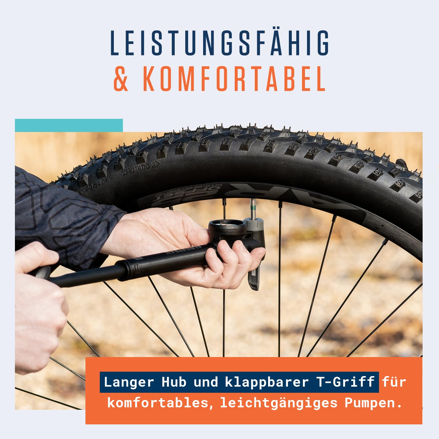 ["FOR ALL VALVES - The mini pump with intelligent pump head fits without modification for Presta (SV) and Schrader valves (AV), with included adapter also on Dunlop valves (DV) and creates up to 8.3 bar (120 PSI) pressure. Perfect for city, touring or road bike and MTB.","COMPACT AND LIGHTWEIGHT - Disappears with 27 cm length and only 113 g weight easily in any pocket and securely holds on the bike with the included bracket.","POWERFUL & COMFORTABLE - With large locking lever for a secure fit on the valve, 1.5\" round gauge (Ø 32 mm) for accurate pressure measurement and collapsible T-handle for comfortable pumping.","ROBUST & DURABLE - Resilient aluminum and high-quality plastic make the pump particularly sturdy and ensure its function remains intact for a long time.","LIFETIME WARRANTY - We provide a lifetime warranty on all our pumps. If a warranty case occurs, we will of course replace it free of charge. Excluded are damages caused by external influences, wear and tear or improper use. Product packaging may vary."]