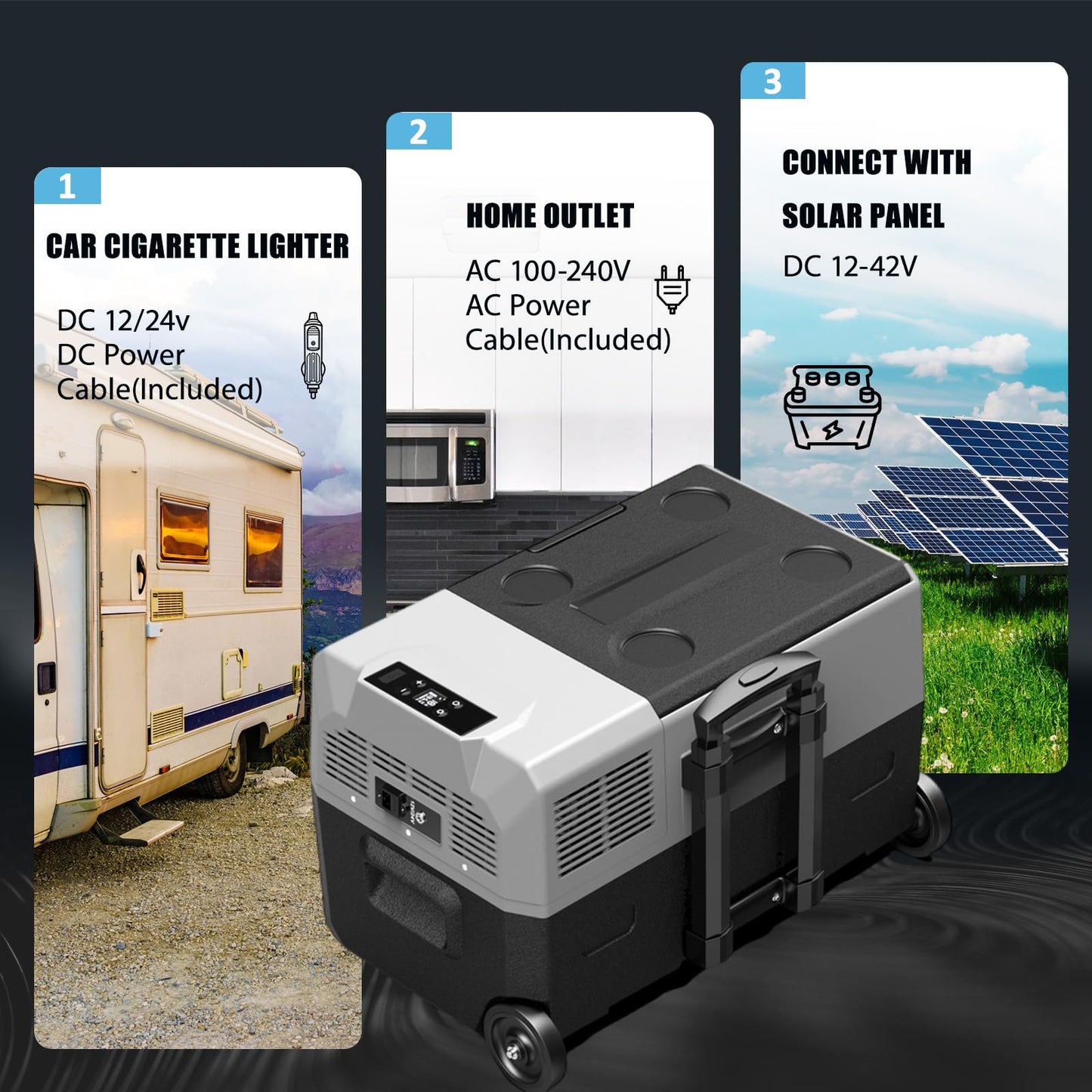 ["Fast cooling with advanced technology. This car refrigerator with freezer compartment features advanced cooling technology that ensures better and more stable cooling performance. It only takes 15 minutes to cool down to 0 °C. After disconnecting the power supply, the foam and insulation materials can continue to cool the refrigerator for several hours.","High energy saving: Two different modes can be set according to need: MAX and ECO mode. The average energy consumption is well below 1 kWh/day, which represents a huge energy saving.","Car battery protection: The refrigerator has three types of battery protection functions: H (high), M (medium), and L (low). If the vehicle's output voltage drops below the minimum voltage required for the refrigerator to operate, the refrigerator will automatically shut off to prevent draining the car battery.","Easy to transport: Thanks to the sturdy wheels and telescopic handle, this refrigerator stays in good condition even on bumpy roads and can be easily taken anywhere.","Can be used with removable batteries, batteries are not included and must be purchased separately."]