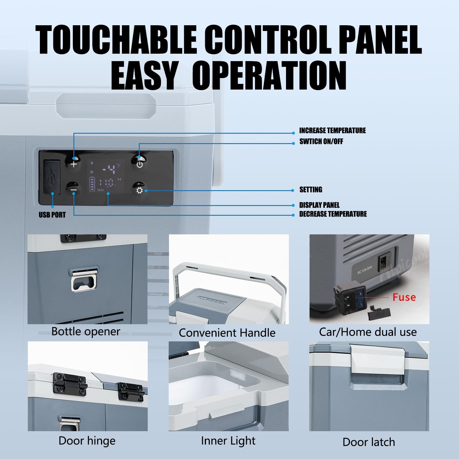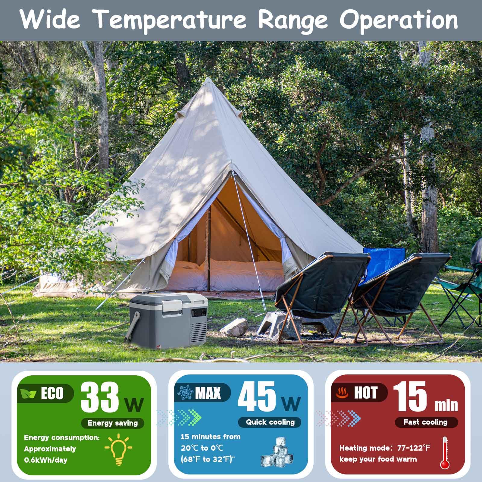 ["Fast Cooling - No need to add ice, the car refrigerator can cool down to 0℃ within 15 minutes, minimum adjustable temperature is -20℃, it can be a refrigerator or freezer.","Convenient to carry - Portable refrigerator LGMP8 with carrying handle & adjustable shoulder bag. Lightweight design for camping, travel, or on-the-go.","Battery Protection - The refrigerator has three types of battery protection functions: H (high), M (medium), and L (low). If the car's output voltage drops below the minimum voltage required to protect the refrigerator battery, the refrigerator will automatically shut off to prevent draining the car battery.","Multiple Use - Comes with 2 types of power plugs, DC and AC. You can plug the DC cable into your car's cigarette lighter socket (12V) to precool your items before traveling, picnicking, or camping. This P18 car refrigerator is perfect for outdoor use.","Can be used with removable batteries, batteries are not included in this item and must be purchased separately."]