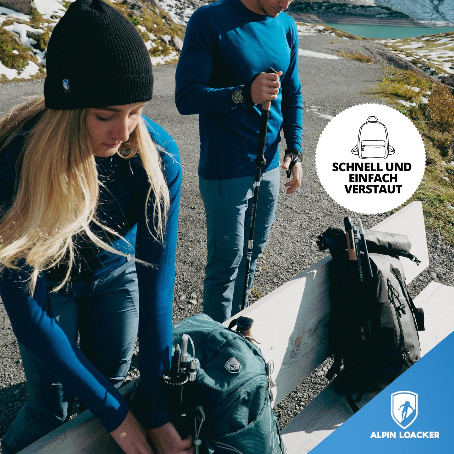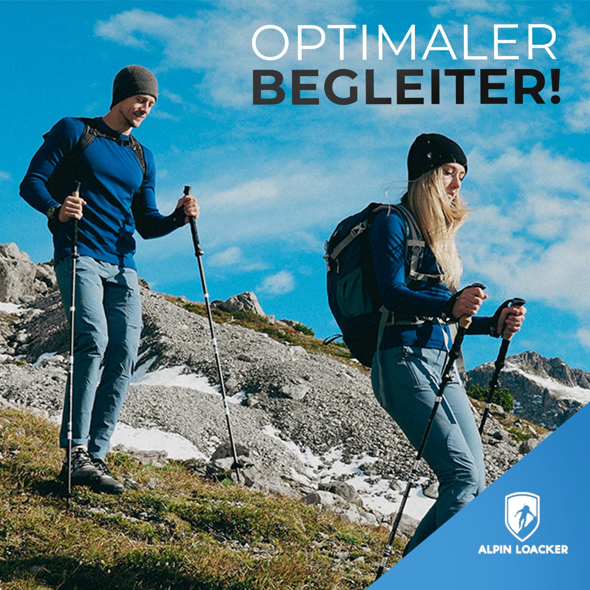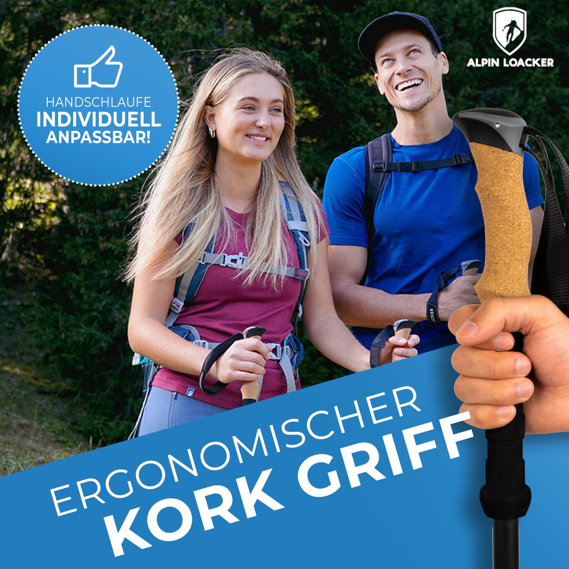 ["π² Advantage - A foldable aluminum hiking pole weighs only 291 grams and is extremely stable and break-resistant! Lightweight aluminum foldable hiking poles with adjustable cork grips make it easier for you to hike in the mountains. These Nordic Walking poles are a true trekking wonder! With innovative push-button design patented in Austria - No slipping like with conventional manufacturers!","π² Ultimate small foldable trekking poles - The walking poles measure only 35cm when folded! The Nordic Walking poles for women and men are adjustable from 100 to 120cm and suitable for heights up to 1.65m!","π² Includes accessories - The trekking poles come with snow baskets, mud baskets, and rubber tips. With the Alpin Loacker hiking pole, you can climb any mountain and safely descend!","π² Free bag - With the sporty bag, you can easily transport the mountain hiking poles anywhere. This way, your backpack stays clean and all parts stay together.","π² Warranty - Alpin Loacker is an outdoor brand from Austria that has been on the market since 1993. All foldable poles are extensively tested in the Alps in Austria."]