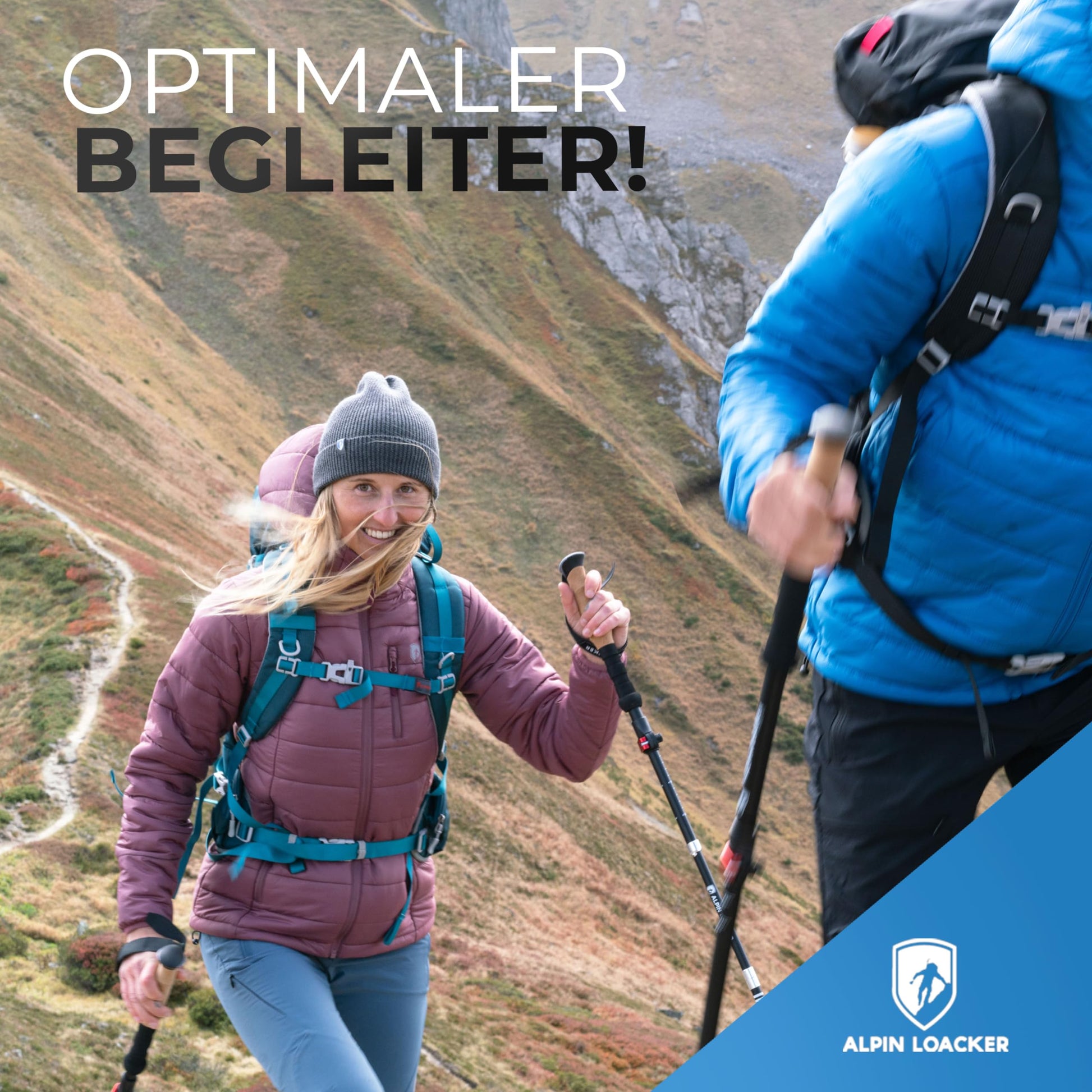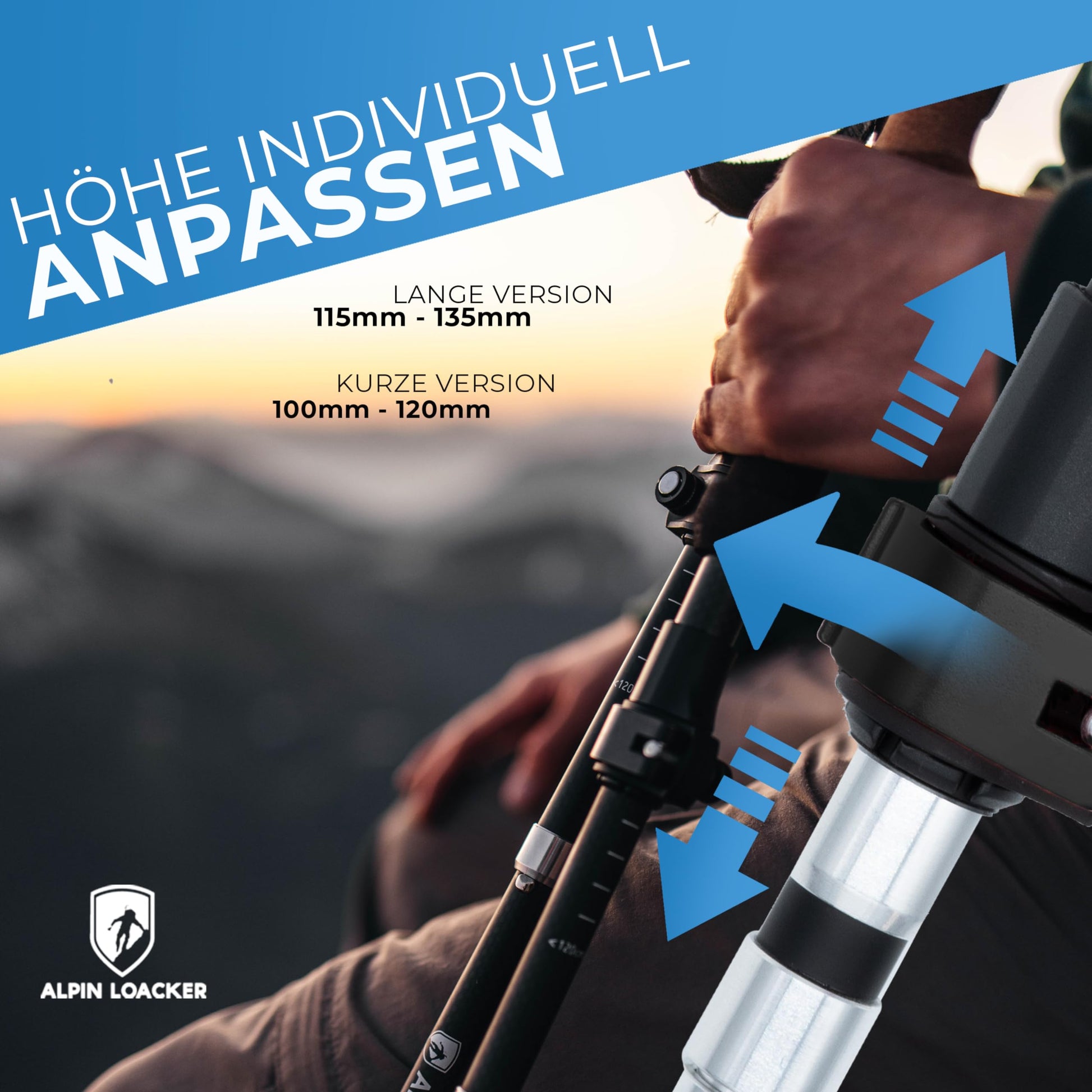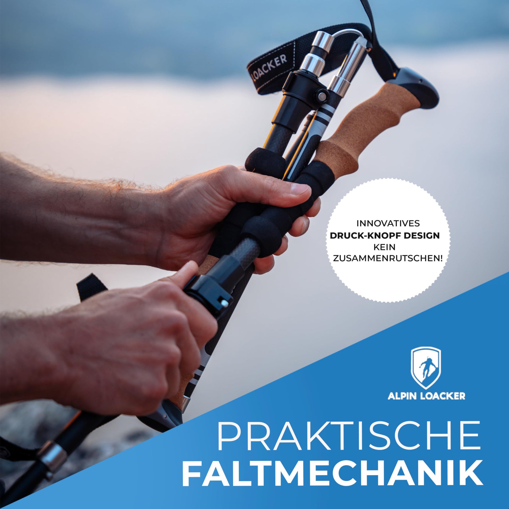 ["Shatterproof and ultralight hiking poles - This carbon collapsible telescopic pole is in the top mountain equipment league. The trekking poles weigh only 8.1 ounces and are extremely stable and break-resistant. With innovative push-button design patented in Austria - No slipping like with traditional manufacturers!","Compact - The collapsible telescopic hiking poles from Alpin Loacker measure only 13.8 inches when collapsed. The trekking poles are individually adjustable from 45.3 to 53.1 inches and are ideal for anyone over 5 feet 5 inches tall.","Includes accessories - The trekking poles come with snow baskets, mud baskets, and rubber tips. With the Alpin Loacker hiking pole, you can reach every mountain top and safely make your way back down!","Free bag - With the sporty bag, you can easily transport the hiking poles anywhere. This way, your backpack stays clean and all parts stay together.","Warranty - Alpin Loacker is an outdoor brand from Austria that has been on the market since 1993. All collapsible poles are extensively tested in the Alps in Austria."]