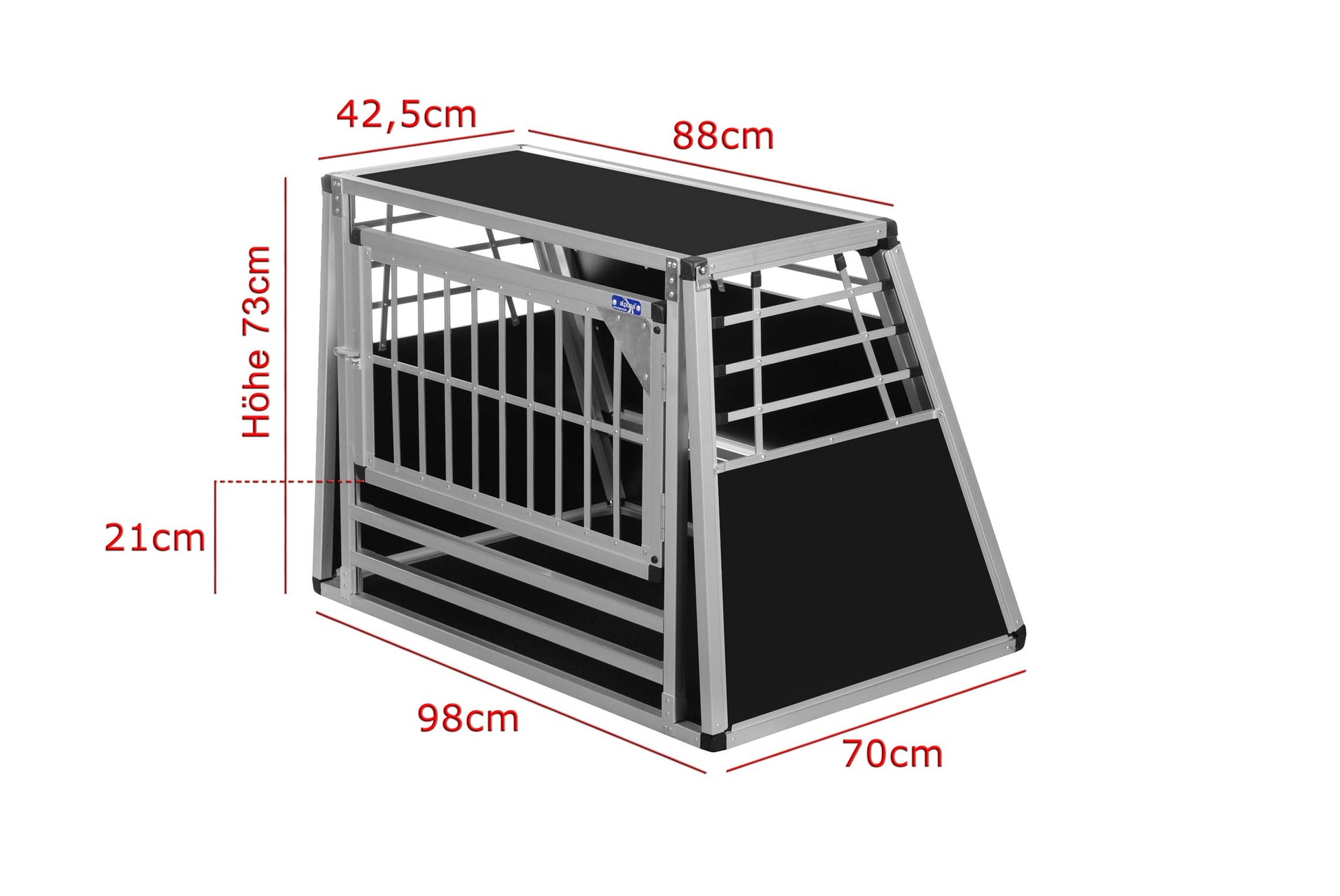 ["Optimally suitable for Skoda Yeti (2009-2017) + Skoda Roomster (2006-2015)", "Dimensions approximately L 70 x W 98 x H 73 cm", "Emergency exit on the back of the dog box", "Height of the lower door edge 21 cm above vehicle floor", "including removable floor mat, non-slip and washable"]