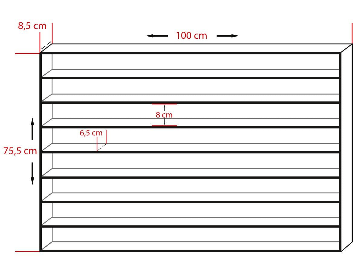"Shelves: 8 compartments; Number of panes: 4 panes of acrylic glass",