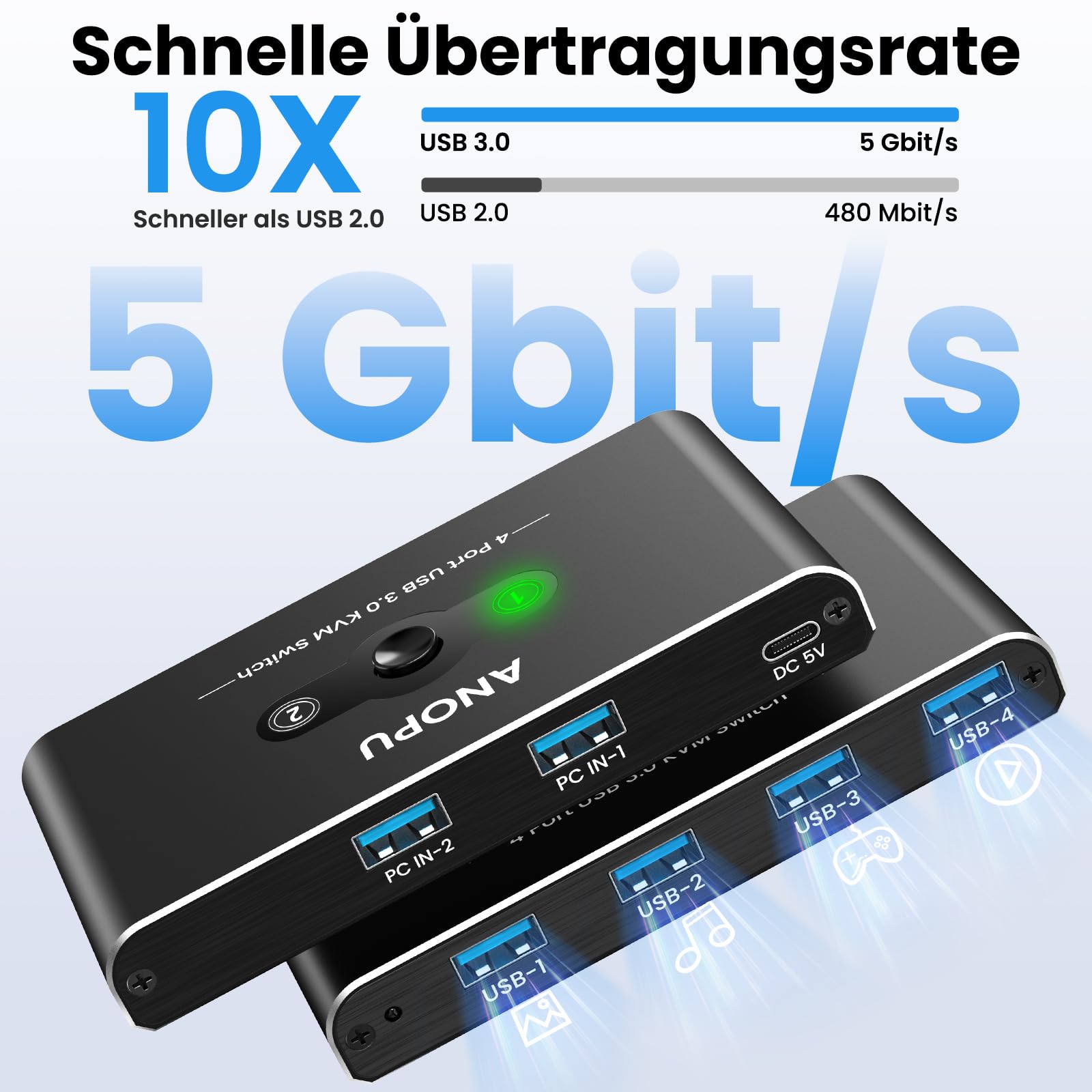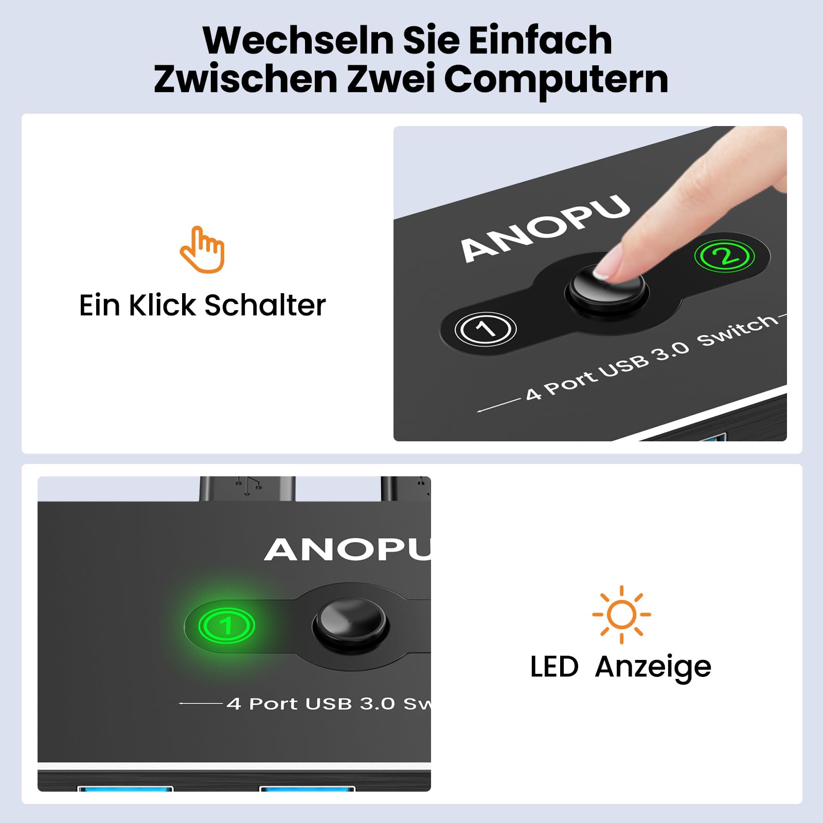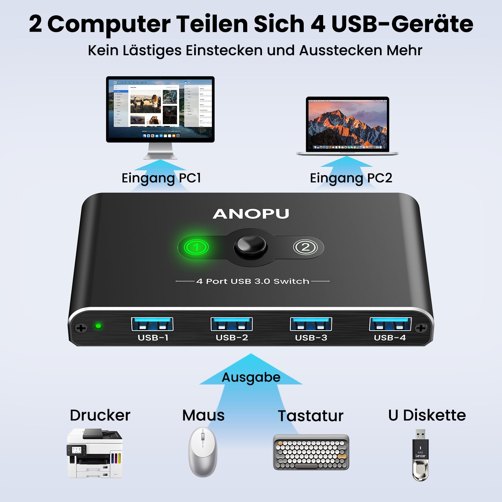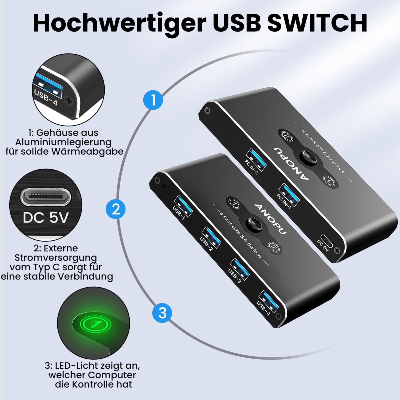 ["Efficient 2-In-4-Out USB Switch for 2 PCs This high-quality USB switch 2 pc allows two computers to share up to four USB 3.0 devices together, ideal for peripherals such as mice, keyboards, printers, scanners, hard drives, headphones, USB flash drives, and other USB accessories. Improved office productivity By eliminating the cumbersome process of repeatedly reconnecting cables or configuring complex network sharing software, this USB switch facilitates switching between your office and personal computers. This not only saves time but also increases office productivity and efficiency without compromising your devices. Stable and fast data transmission Equipped with the latest IC chips, this USB-C switch supports data transfer speeds of up to 5 Gbps (10 times faster than USB 2.0) with backward compatibility to USB 2.0/1.1. The aluminum housing ensures durability and efficient heat dissipation, while the 24K gold-plated interface ensures excellent image quality and stable signal transmission. One-button switching With an intuitive LED indicator design, this USB switch offers easy operation. The one-button switching function allows you to select which PC you want to connect your devices to, enabling seamless control of two computers simultaneously. The green LED indicator on the KVM USB switch indicates the currently active PC. Sharing across multiple devices Compatible with various systems, including Windows XP/Vista/7/8/8.1/10/11, Linux, Chrome, Mac, and more, this kvm usb switch supports plug-and-play functionality for effortless use on different platforms. It also supports hot-swapping. (Note: For devices that require additional power via USB, use a standard 5V power supply to power them)."]