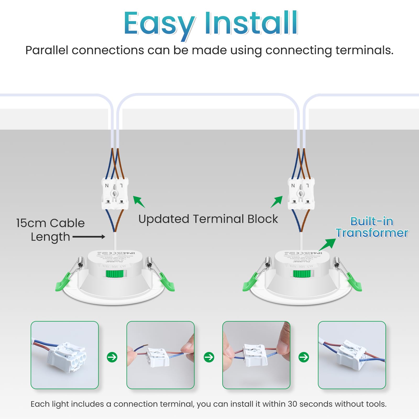 ["【3 Color Temperature Adjustable】- LED Recessed Light 230V flat with 3-color temperature design, 3000K Warm White/4000K Neutral White/6500K Cool White can be adjusted by a green toggle switch on the Downlight. You can choose the lighting color that best suits your apartment.",