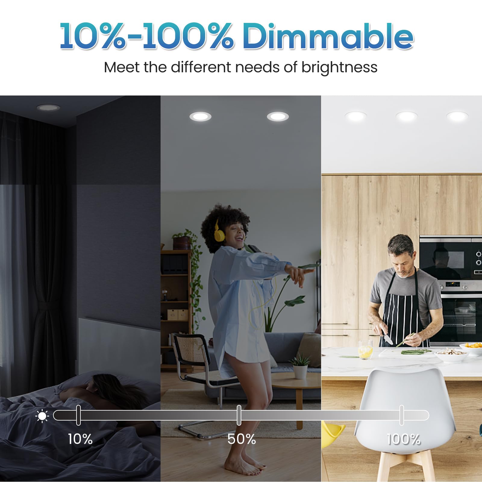 "【10%-100% Dimmable】- Dimmable LED Spots, Smooth dimming 10%-100% without flickering or noise, meets your different brightness requirements. 120° wide beam angle ensures a large lighting area. Dimmer not included, our Downlights can also be operated at full power without a dimmer.",