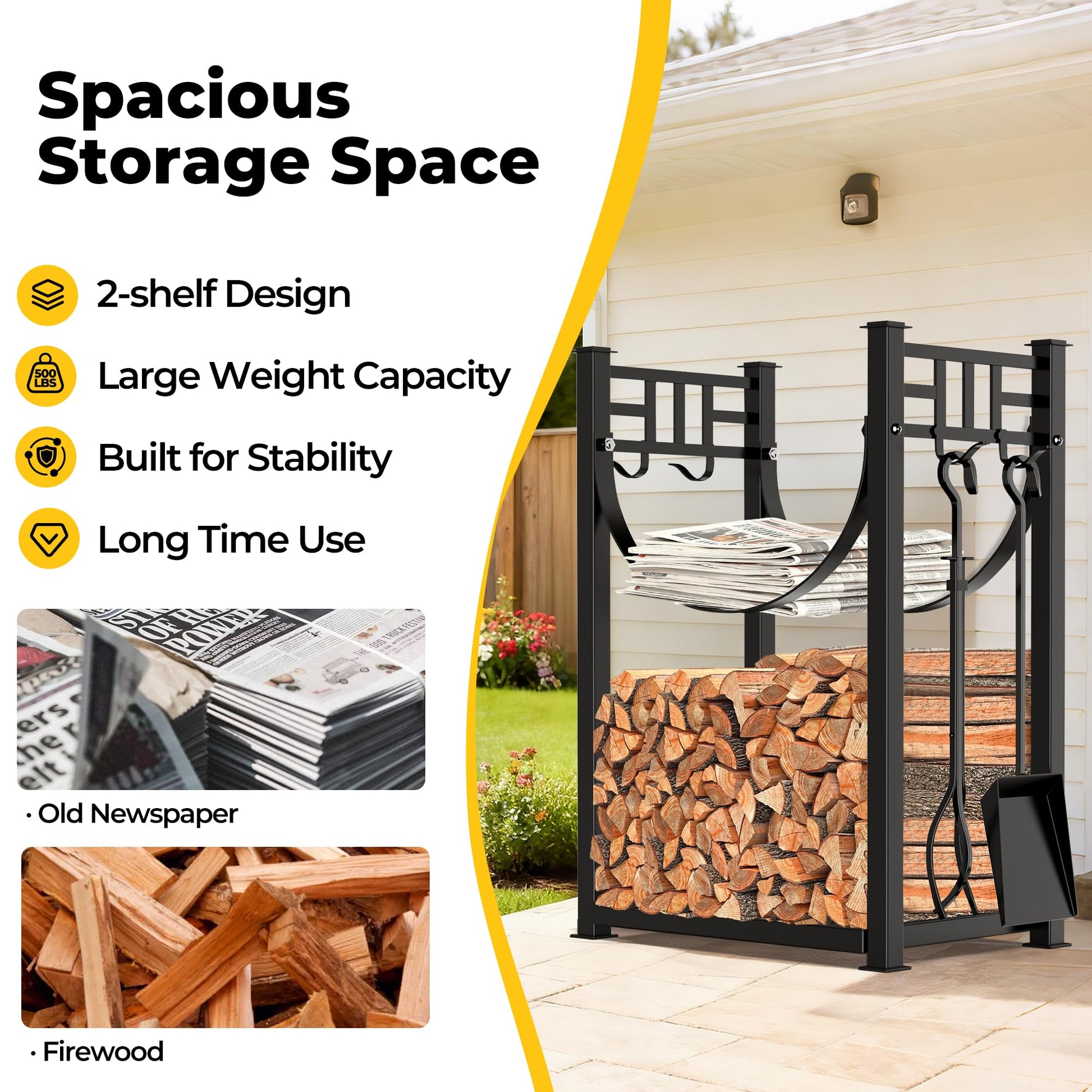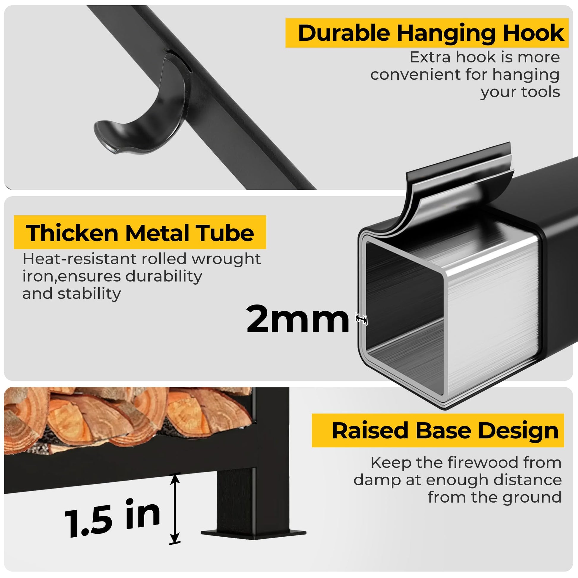 Large capacity and floor ventilation: Double-layered firewood rack to hold enough firewood stacks for logs indoors or outdoors. It can greatly help and avoid the hassle of carrying wood back and forth; 2” elevated base above the ground allows for airflow to keep the wood dry; The plate design of the base can prevent wood debris/mess from falling on the ground.