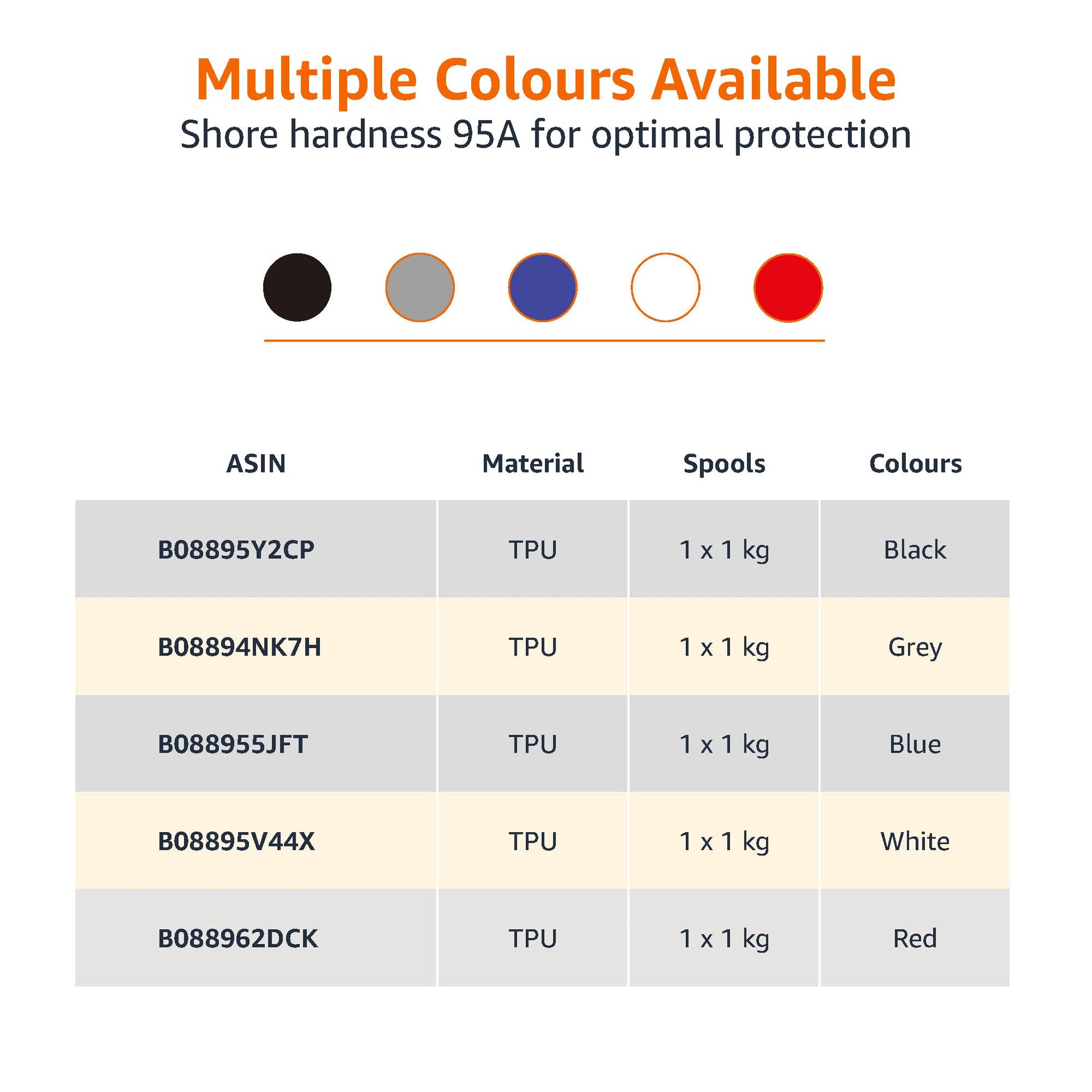 "3D printer filament with a diameter of 1.75 mm (+/- 0.05 mm); suitable for common 3D printers (please check spool size for compatibility); ideal for printing small parts, phone cases, watch bands, and more; Blue; 1 kg spool Made from sturdy but flexible thermoplastic polyurethane (TPU) that is easy to use and provides excellent layer adhesion; resistant to oil, grease, and scratches; very good wear resistance"; Integrated display on the spool shows the remaining material quantity in percentage and approximate remaining length; Designed to reduce printer errors; comes with a resealable storage bag to protect the filament when not in use; Dimensions (L x W x H): 24.8 x 23.6 x 40.8 cm; Weight: 0.9 kg; Vacuum packed in a moisture-absorbing bag for a fresh, dry, and dust-free product and optimal 3D printing results"