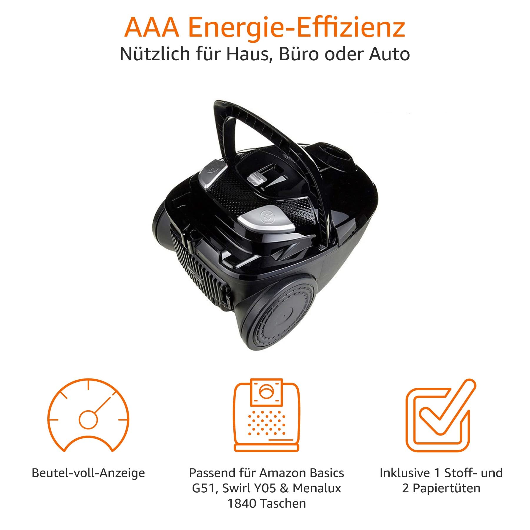 "700-Watt-Bagged Cylinder Vacuum Cleaner; AAA performance in terms of energy efficiency and cleaning performance; 25 kWh consumption per year","Triple-action nozzle for thorough suction of coarse and fine dirt; easy-to-use sliding button to regulate suction power","Washable HEPA-12 filter captures over 99.5 percent of all particles for cleaner air output","1.5 l capacity; small, compact and lightweight; easy to carry thanks to integrated handle; 5 m cable length; 1.5 m adjustable hose","Exceptionally quiet (78 decibels); full bag indicator; cable rewind; practical accessories and bags (1 fabric and 2 paper) included.","Compatible with the following vacuum cleaner bags: Amazon Basics G51, Swirl Y05, Menalux 1840, and others","If the appliance does not start, properly plug in the power cord, check if the power outlet is live, or check if the power switch is turned on.","Check for low suction performance if the flexible hose, extension tube, or any accessories are clogged and remove and clean the filters","If the motor is loud, stop it immediately, check if the hose, tube, or any accessories are blocked, remove the blockage, if the noise persists, turn off the appliance, unplug it, and contact customer service.","Troubleshooting tip: Switch to a different good power outlet; Some dust has entered the motor. Please remove the hose to check if the motor is working or not, and clean or remove the dust from the hose. Clean the HEPA connection after each use. If the dust cannot be completely removed, please replace it with a new HEPA connection"