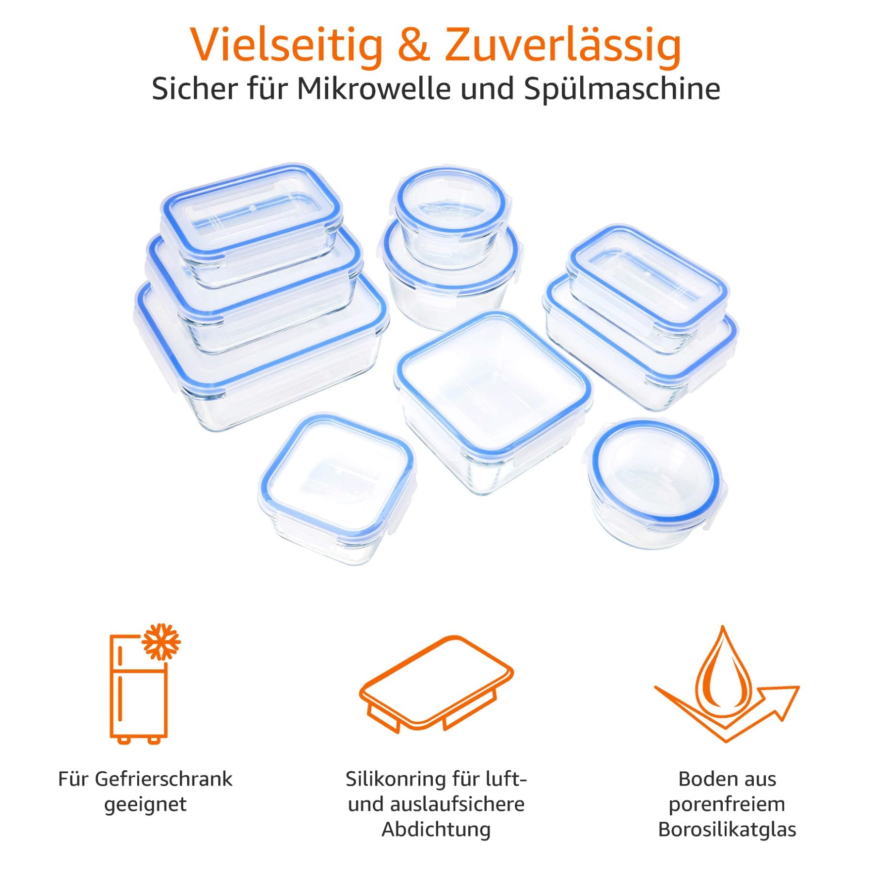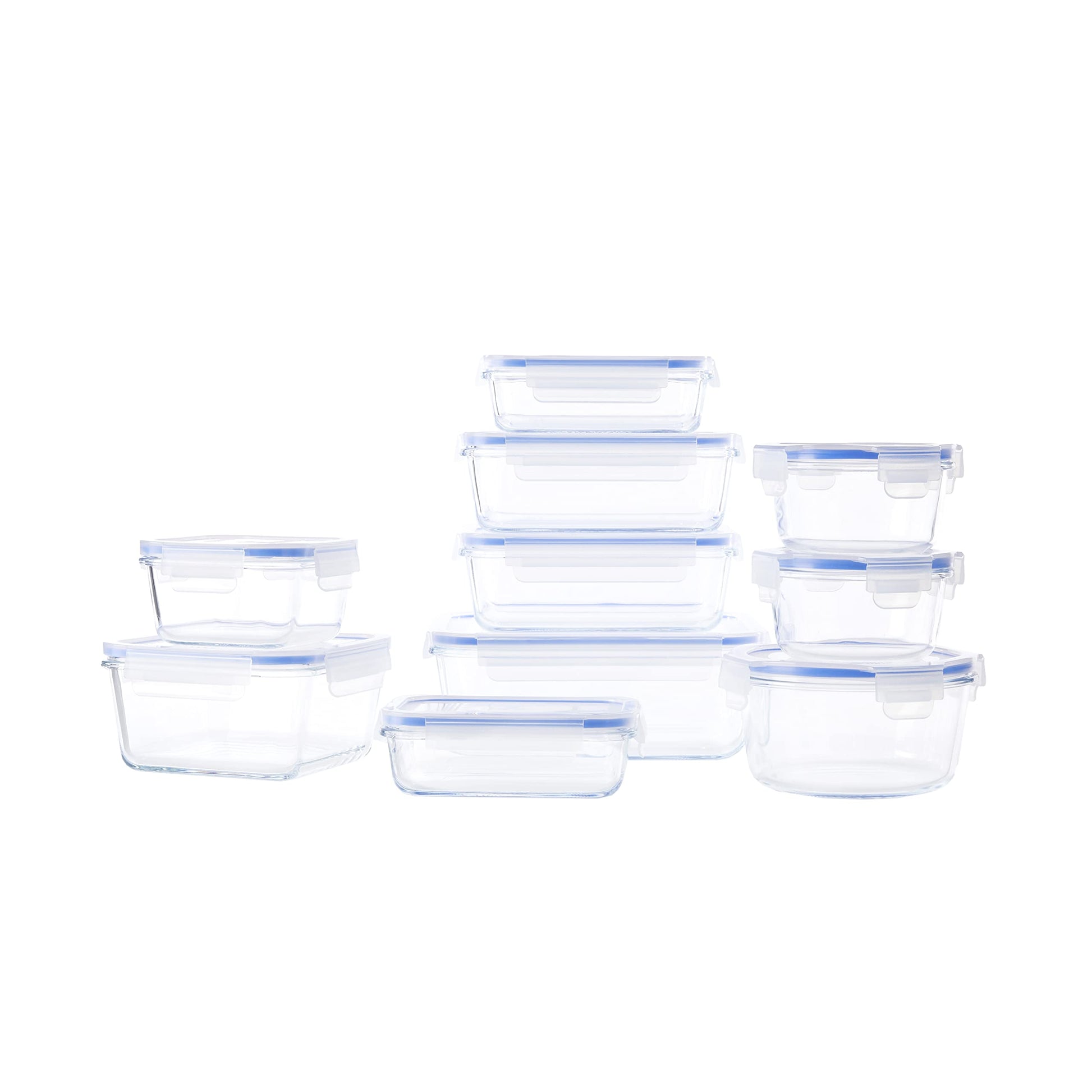 Amazon Basics leak-proof glass containers with locking lids, 20-piece set including 10 containers and 10 plastic lids, transparent, blue, BPA-free.
