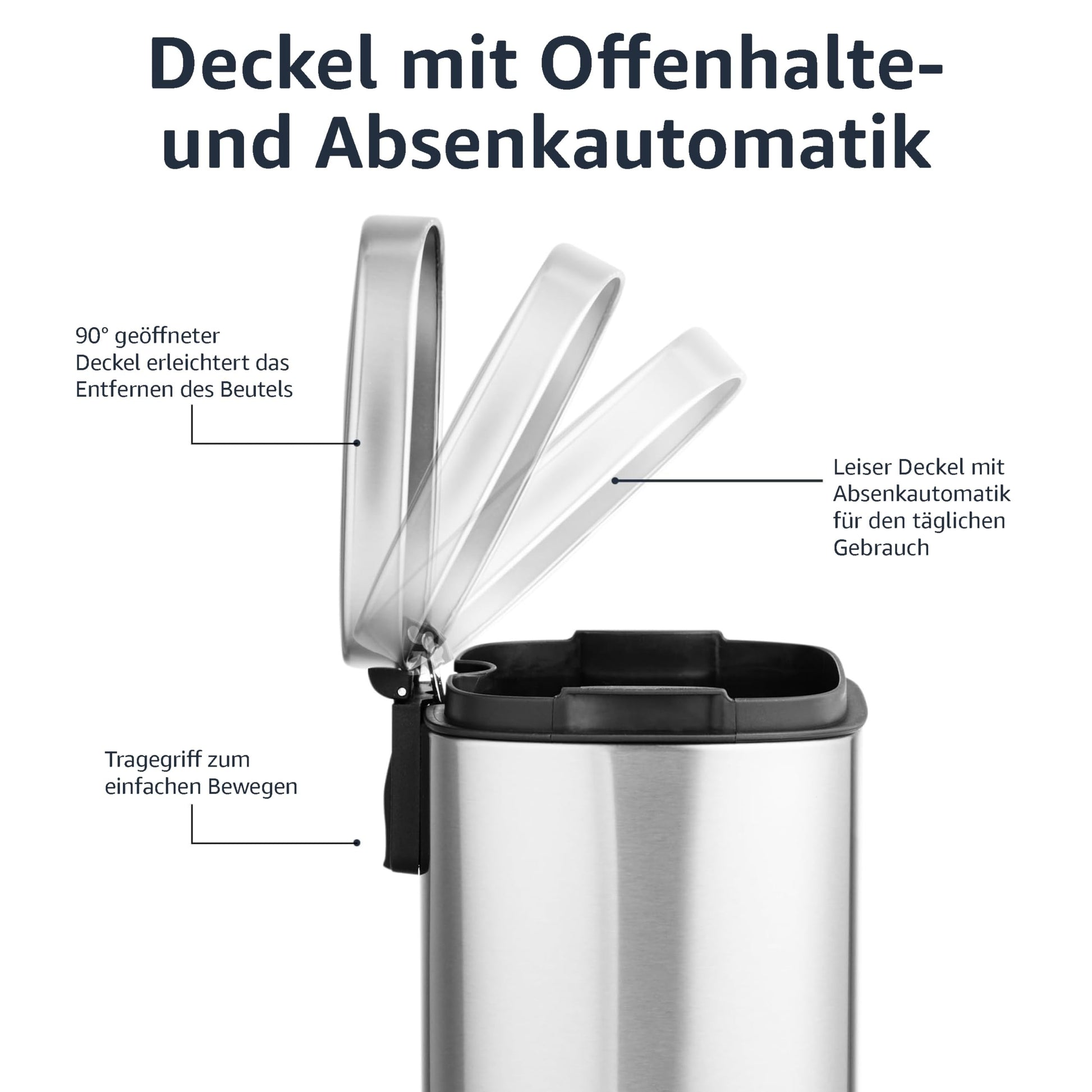 ["Small rectangular trash can: Modern, fingerprint-resistant and dirt-repellent 5-liter trash can made of brushed stainless steel with a manually operated foot pedal","Lid design: The softly closing lid of the trash can reduces noise when closing and minimizes wear","With durable inner container: The sturdy black plastic inner container is removable, easy to wipe clean, and allows for convenient disposal of waste","Versatile: This trash can, ideal for kitchen waste or paper, can be used in the bedroom, bathroom, kitchen, or office","Dimensions: Compact trash can measuring 21.5 x 18.5 x 30 cm (L x W x H)"]