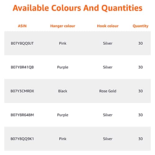["Details: 0.20 x 17.4 x 9.3 inches (W x L x H), 2.34 oz","Soft, lint-free velvet cover with notches to prevent clothes from slipping off hangers and falling to the ground","The extremely thin profile maximizes closet space and allows for easier storage of even more outfits","Sturdy construction supports up to 10 lbs; suitable for heavier clothing items","Convenient pack of 30 pieces"]