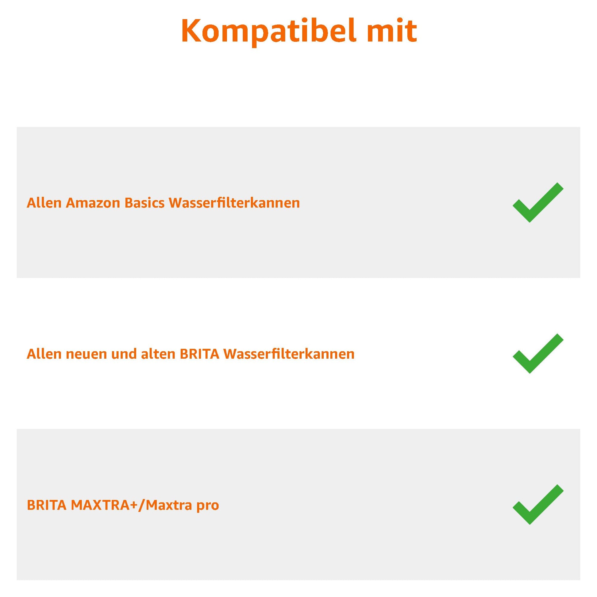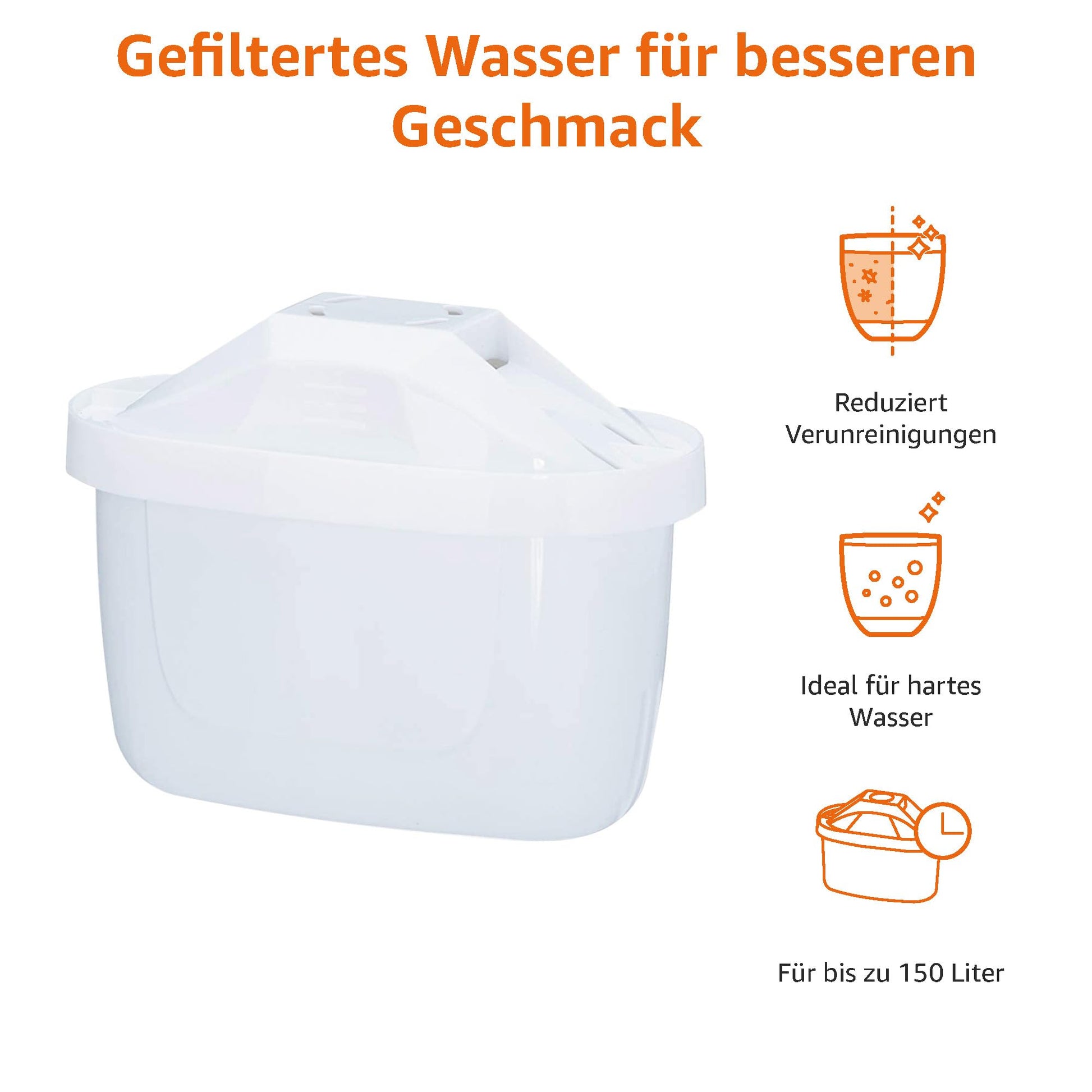["Water filter cartridges, suitable for all new and old BRITA, as well as all Amazon Basics water filter systems","Reduces chlorine, limescale, and other impurities in water","Improved filtration: significantly increased activated carbon filter surface area, fine mesh for better reduction of coarse particles, fine integrated mesh inserts filter particles out of the water, and fine grid inserts in the cartridge base effectively reduce the release of activated carbon particles","TÜV certified & BPA-free","Each water filter cartridge should be replaced after 30 days or 150 liters (depending on the water hardness)","Quick start-up in just 4 steps - no time-consuming pre-wetting of the cartridge required"]