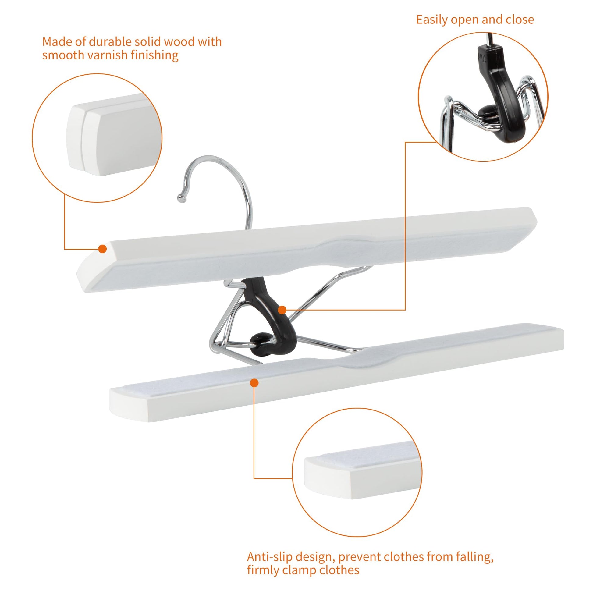 ["Clothes hanger with clips to keep pants organized and off the floor","Includes 10 pants hangers","Made of smooth, durable wood with white finish","Great for pants, jeans, leggings, and more","Fits most standard hanging rods and clothes racks"]