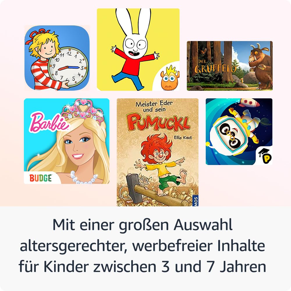 ["SAVE UP TO $60 - In the bundle, compared to the total price of the items purchased separately: a fully equipped tablet (not a toy) for kids aged 3 to 7, 1 year of Amazon Kids+ content, and a kid-friendly case with integrated stand.","POWERFUL AND LONG-LASTING BATTERY - With an 8-inch HD display, 3 GB RAM (50% more than the 2022 model), 32 GB storage, expandable up to 1 TB (sold separately). A battery that lasts all day - up to 13 hours of entertainment with books, videos, and music.","AMAZON KIDS+ INCLUDED - With one year of Amazon Kids+, a digital membership with unlimited access to ad-free, age-appropriate content kids love. This includes STEM content, as well as books in various languages for children to learn from. After the first year, monthly charges of $4.99+ apply at no additional cost. You can cancel the membership anytime through the Amazon Parent Dashboard or by contacting customer service.","2-YEAR WORRY-FREE GUARANTEE INCLUDED - If the tablet breaks, we'll replace it for free when returned. The screen is made of reinforced aluminum-silicate glass. Each Fire Kids tablet comes with a durable kid-friendly case included, providing protection against drops and impacts.","EASY-TO-USE PARENTAL CONTROLS - You can easily prioritize books and educational apps over entertainment content from your device and see your child's activities to learn more about what they enjoy.","SAFETY IS A PRIORITY - Amazon's Family Trust team collaborates with leading safety, privacy, and child development experts to ensure that we support families in developing safe, healthy digital habits.","WITH DURABLE, KID-FRIENDLY CASE - Contents: Fire HD 8 Kids Tablet (2024) with Wi-Fi, kid-friendly Amazon case with stand/handle, Amazon power adapter, USB-C charging cable (2.0), built-in battery, and 1 year of Amazon Kids+ (one year at no additional cost, then at the current price)."]
