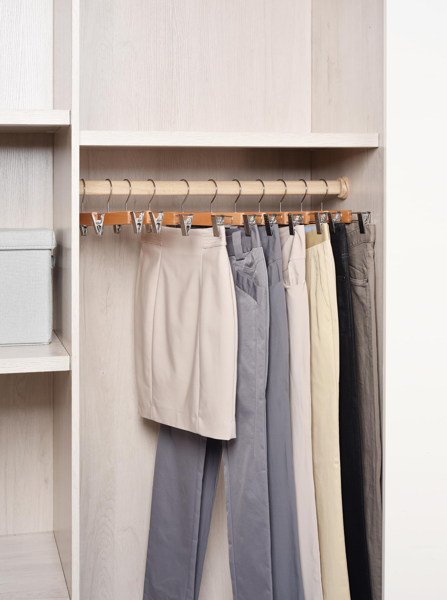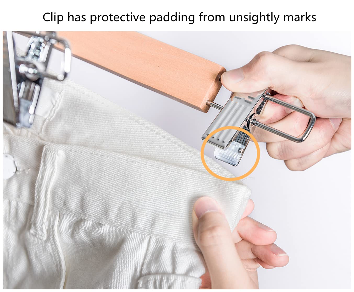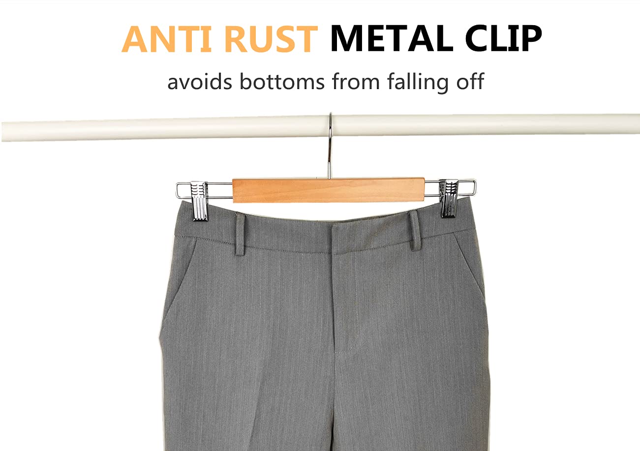 ["(1) Product Information: Material: High-quality wood and metal accessories. Dimensions: Length: 14 inches Thickness: 0.47 inches. Packaging: 10 pieces/set","(2) Thanks to the 360° rotatable, rust-resistant chrome hook, the hangers can be easily hung and removed in any direction. It also has excellent load-bearing capacity and is suitable for various suits, jackets, sweaters, and shirts.","(3) High Quality: A transparent non-slip rubber mat is built into the inner side of the clamp, soft and does not scratch clothes. It prevents wrinkles from falling off. Thanks to the highly elastic spring, it has an excellent lifespan. The thin design facilitates storage and saves space.","(4) Lightweight and thin construction makes storage easier and saves more space in the wardrobe.","(5) Elegant and high quality: Flat and glossy surface, bright color makes your wardrobe much more beautiful. The adjustable multifunctional pants hanger is suitable for men's clothing, women's clothing, and children's clothing, and is considered an indispensable hanger at home."]