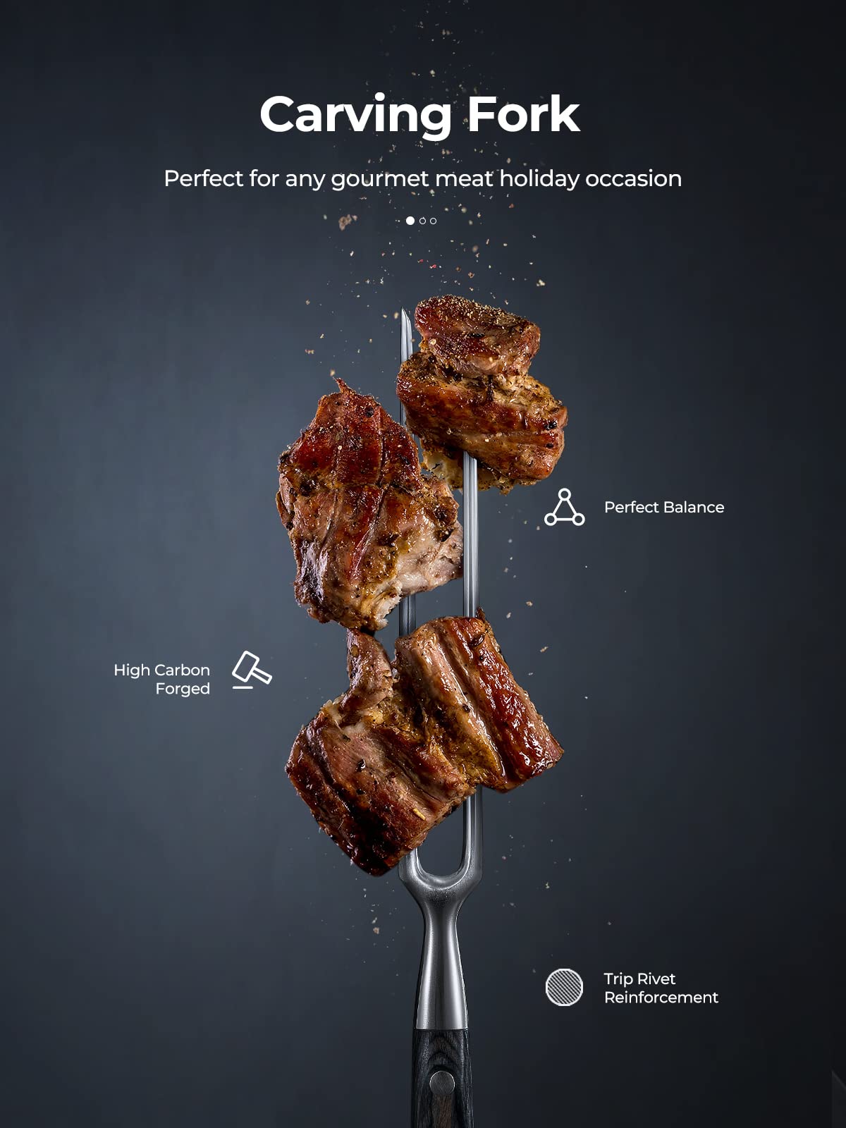 Optimal carving knife set: The 7-inch carving fork easily holds food in place while cutting or carving, making slicing safer and more precise. The fork tip can pierce through all types of raw or cooked meat and safely deliver it to the plate without dropping."