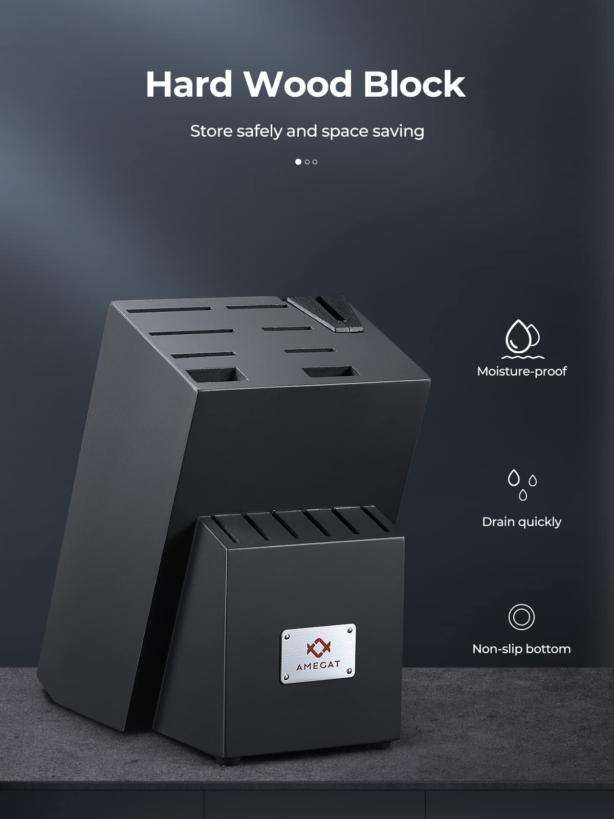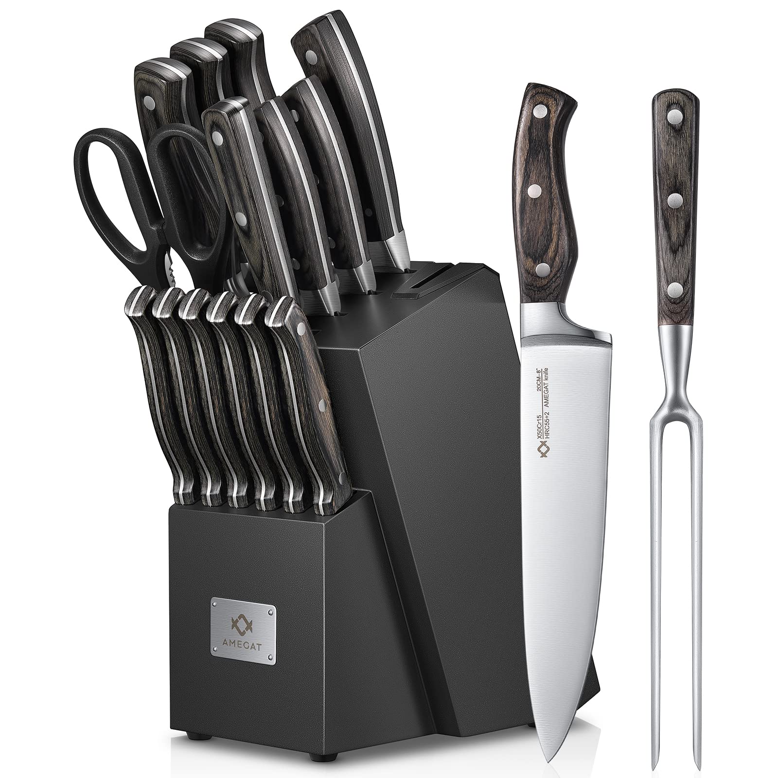 AMEGAT 15-piece knife block set with self-sharpening knife block and carving fork, wooden handle in full tang design and 3-rivet design. High-quality stainless steel chef's knife set with wooden block.