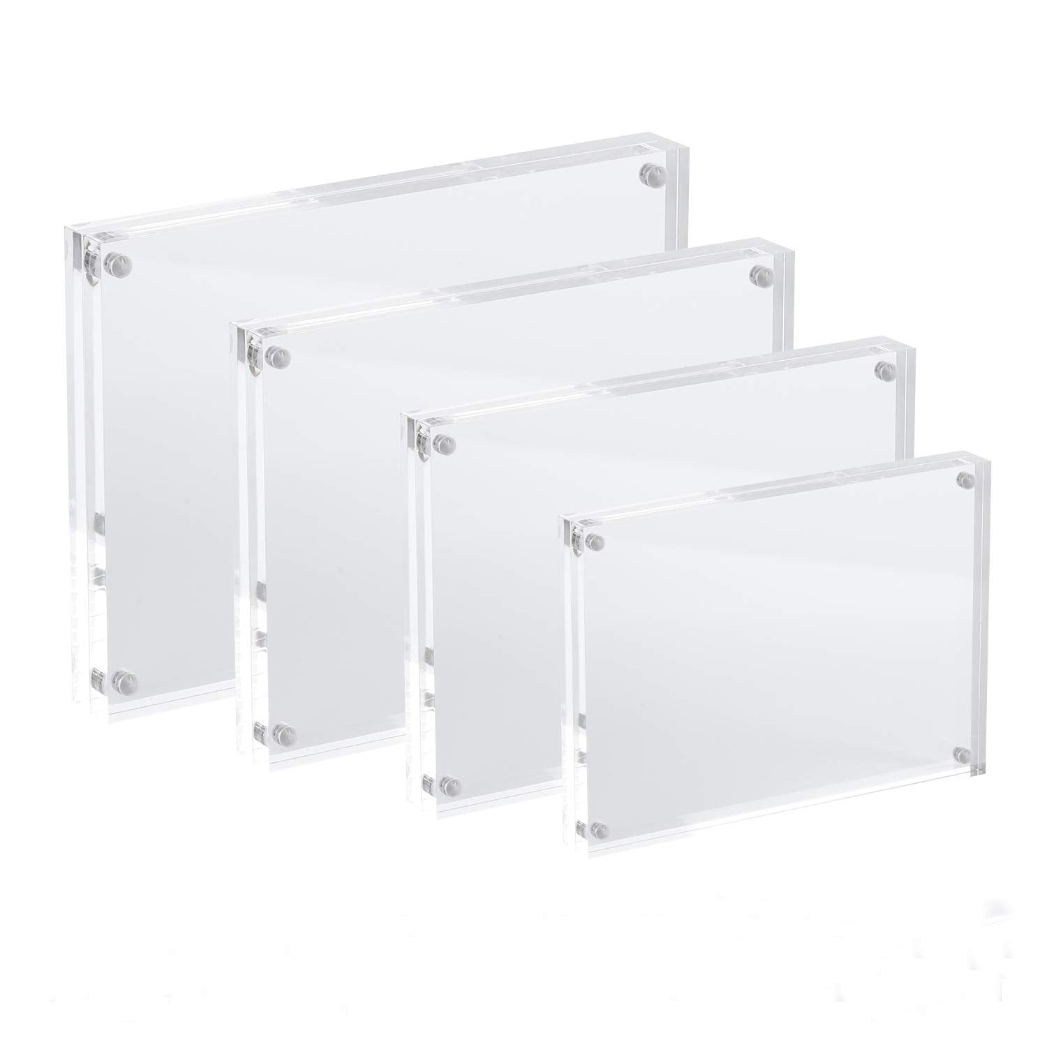 "DOUBLE-SIDED TRANSPARENT: The acrylic photo frame with magnet, double-sided transparent and clear, can be used as a single-sided or double-sided frame. This frame can hold two pictures back to back. The pictures can be displayed either vertically or horizontally to showcase baby photos, family photos, postcards, ticket stubs, trading cards, currencies, awards, etc."