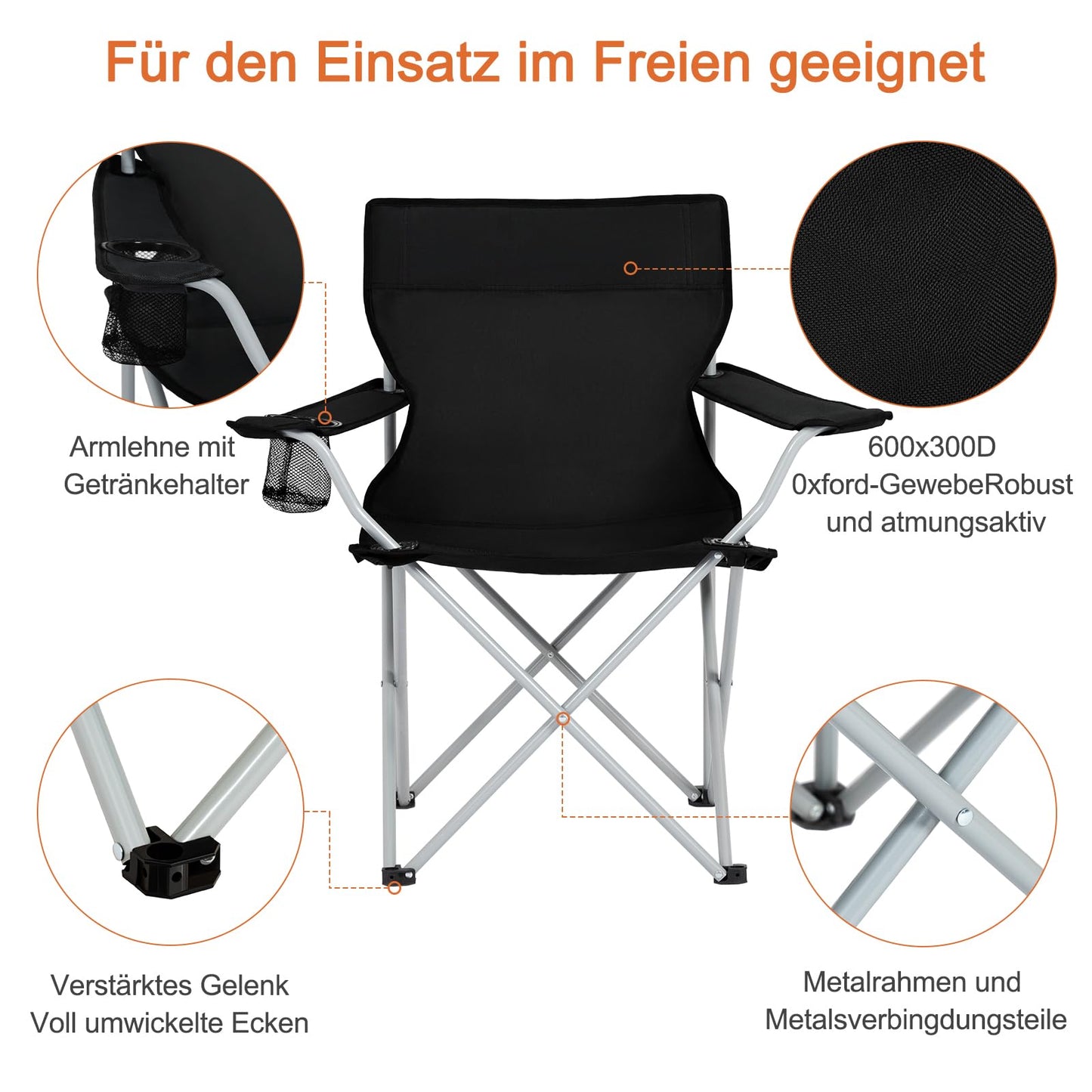 ["【Durable Material & Excellent Workmanship】The 600D*300D Oxford fabric of the camping chairs is tear-resistant and easy to clean. The sturdy steel tube and metal connectors create good load-bearing capacity. The powder coating on the steel tube is smooth and rust-resistant.",