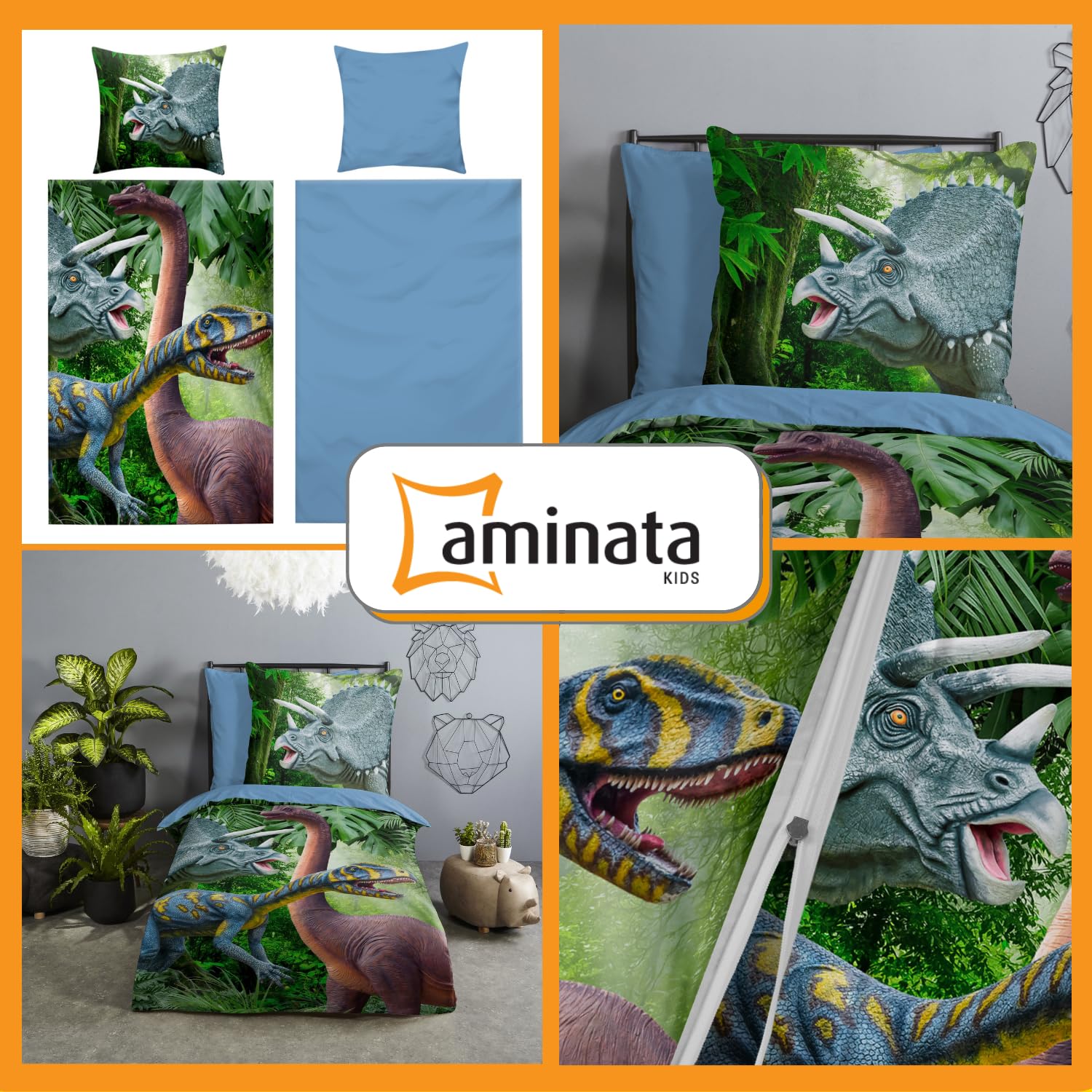 Aminata Kids Dino bed linen 135x200 children's bedding with dinosaur design cotton boys with zipper blue colorful soft